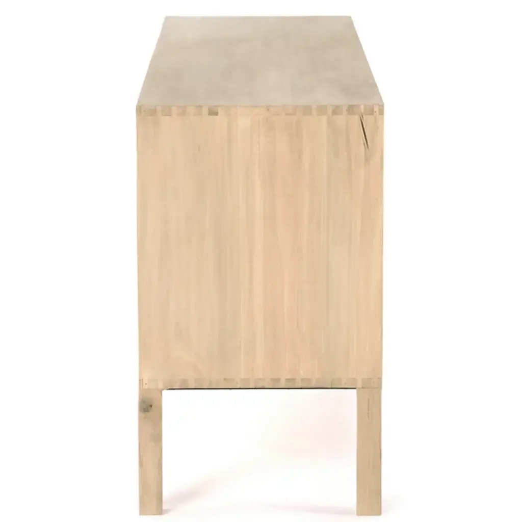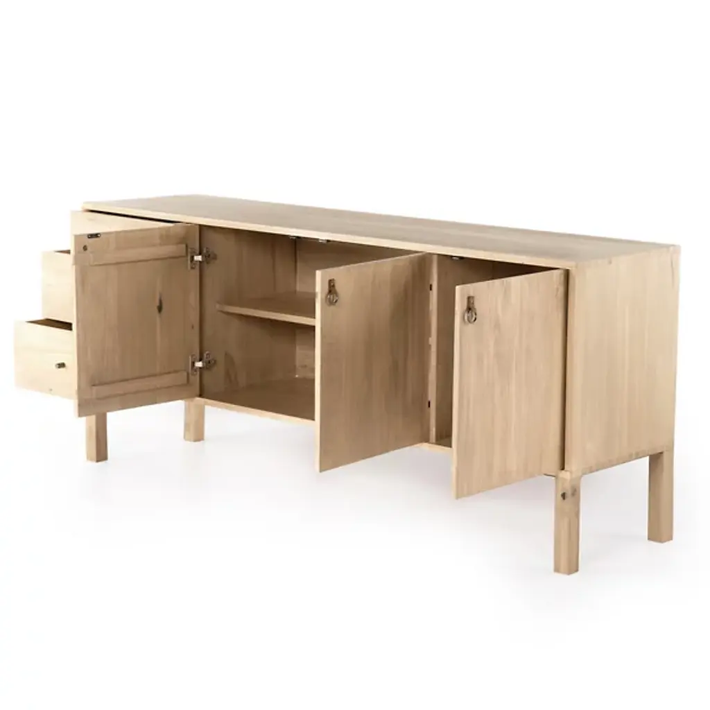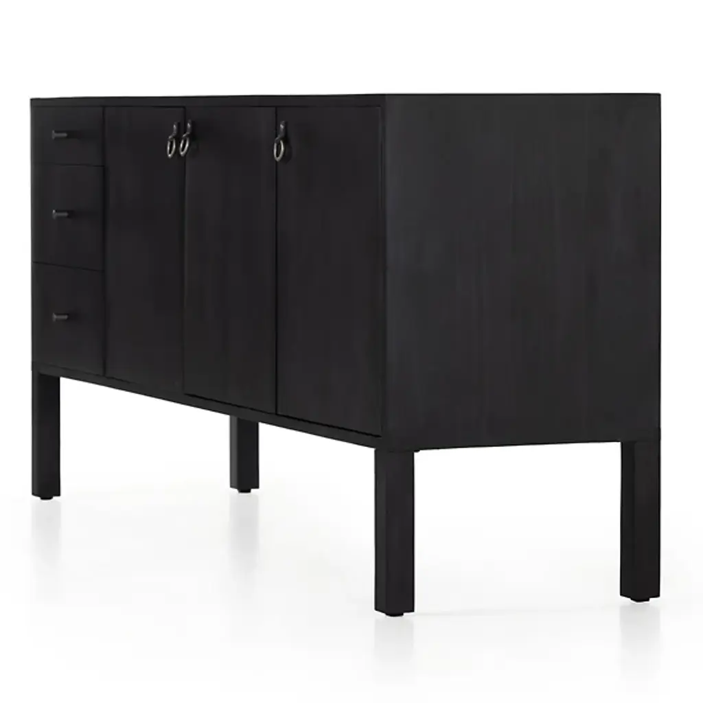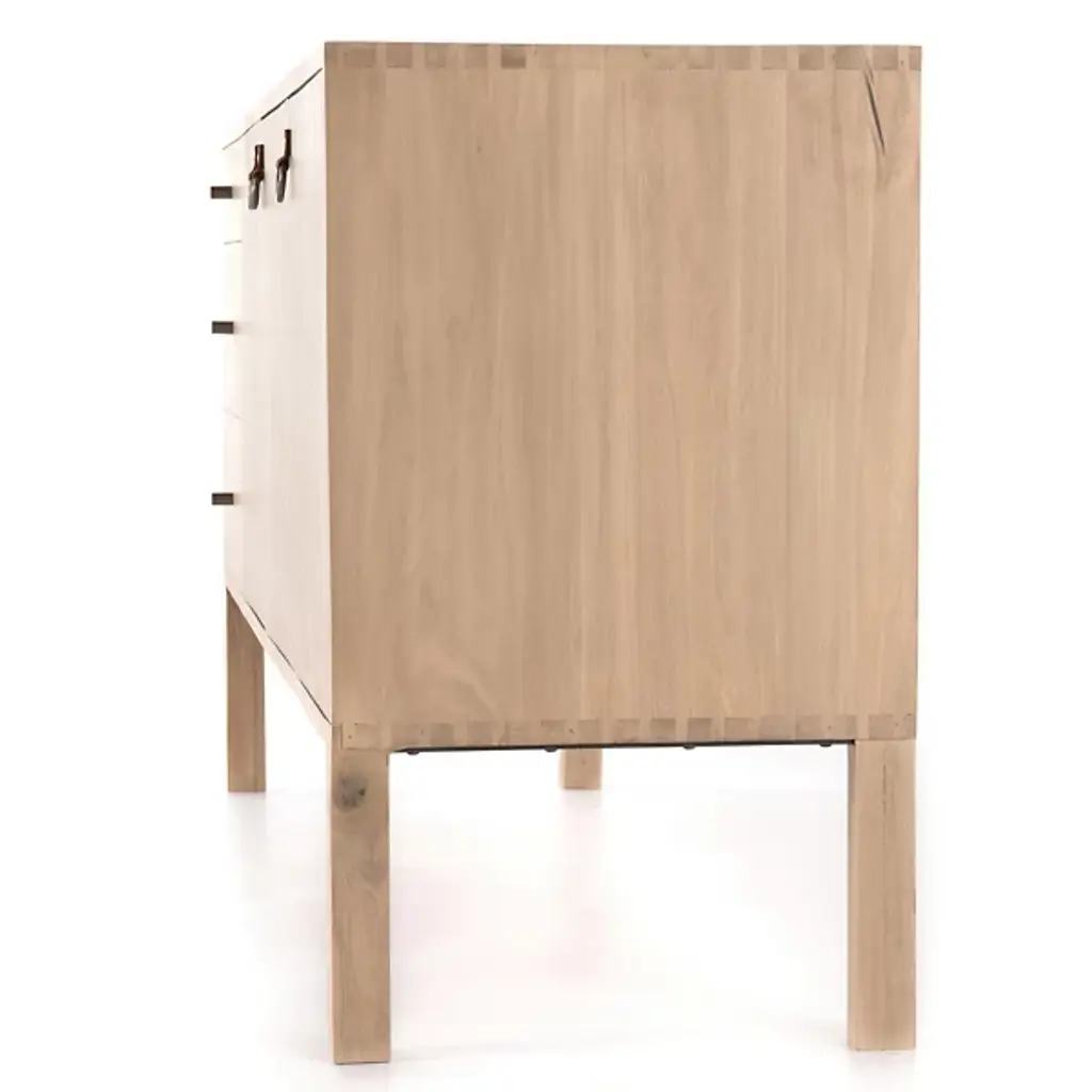 The Isador Sideboard from Four Hands captures a beautifully simple, Shaker-inspired design with a modern twist. Crafted from black-washed solid poplar, it features faux dovetail joinery, enhancing its minimalist appeal. The addition of iron and leather hardware brings a material-driven update, blending rustic and industrial elements for a fresh look. Designed for style and functionality, the sideboard includes rear cutouts for easy cord management, making it a versatile and refined storage solution for any space.