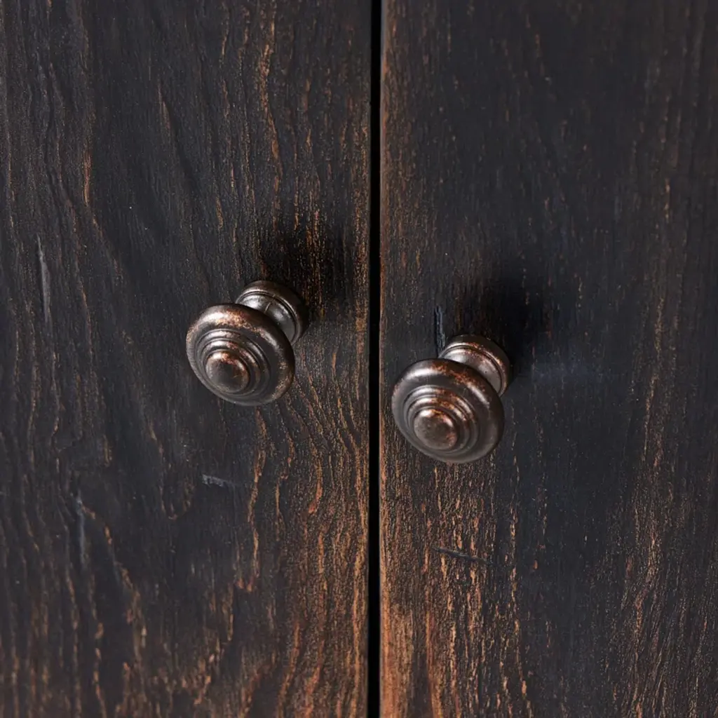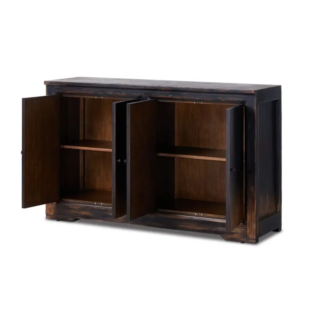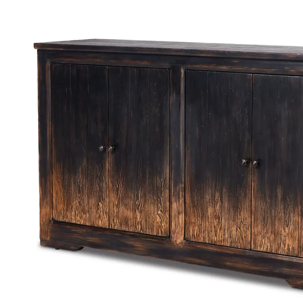 By the makers at Van Thiel, known for their antique-inspired pieces and hand-applied finishes. Influenced by a Chinese antique, this grand-scale sideboard features a simple box frame with subtle leg and hardware details. A worn finish with hand-distressing and chipping throughout gives each piece the look of a handed-down heirloom.