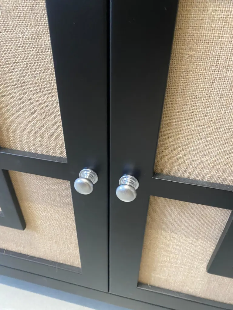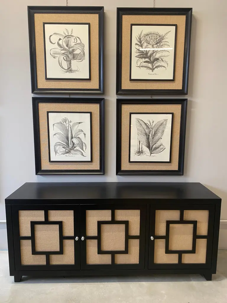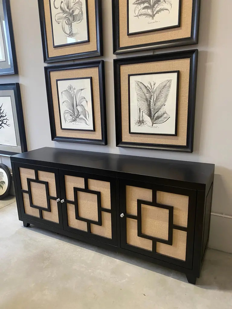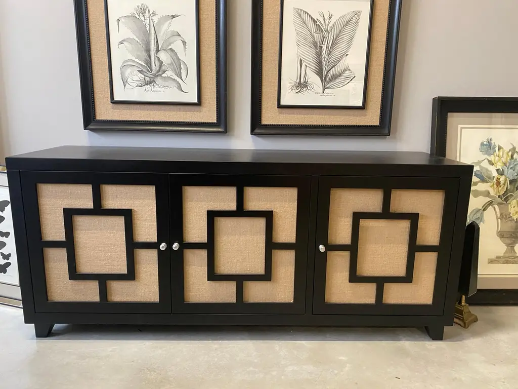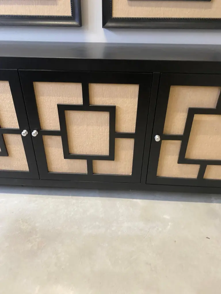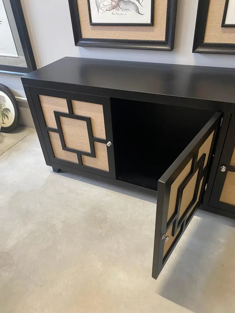 Beautiful two-door sideboard designed and handcrafted by us with structure and interior in solid wood, finishes in natural jute. The entire wooden structure is completely lacquered in black.It is an object of high quality and refinement, ideal for giving elegance to your environments.An object of high quality and refinement aimed at an elite audience.It is possible to have variations in color as visible in the photos above.Measures: 187 x 50 x 81 cmProduction time around 10 weeks.We are at your disposal for any question, curiosity and clarification.With over 40 years of experience, Artecornici Design creates high quality frames and handcrafted products to decorate yours using precious woods and working with various types of finishes, offering a vast choice of models. All our products are designed and produced in Florence by Italian master craftsmen.