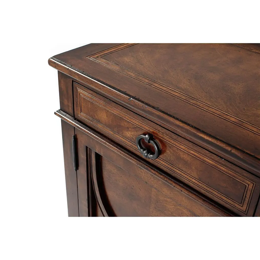 An Italian neoclassic style mahogany sideboard, the rectangular crossbanded top above three short frieze drawers and four further short graduated drawers to the center flanked by two paneled cabinet doors with wavy 'X' applied decoration, each lockable and enclosing an adjustable shelf, on splayed legs. Dimensions: 60" W x 18" D x 40.25" H.