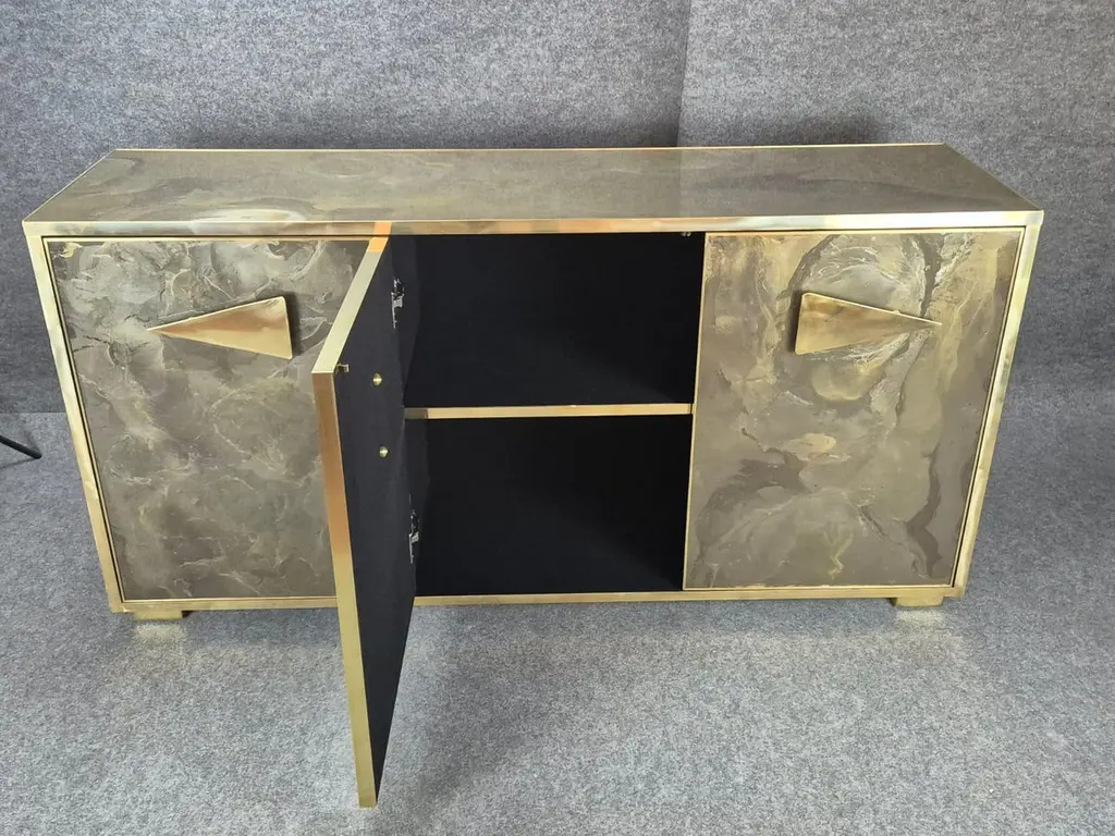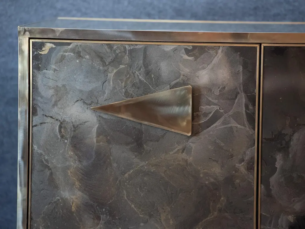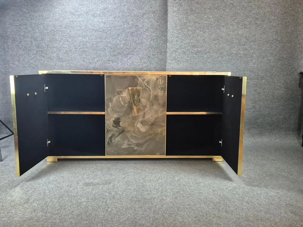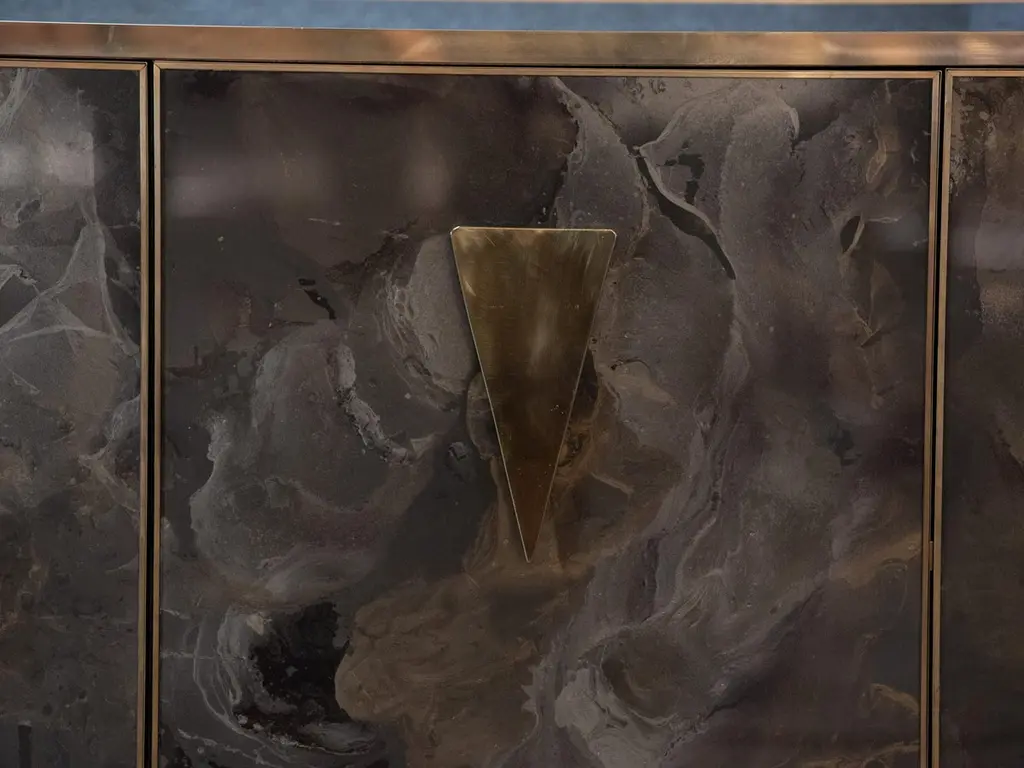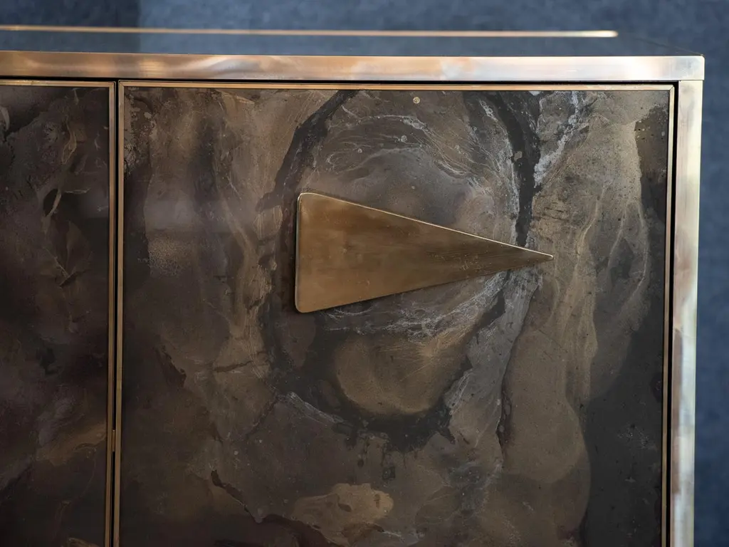 Imagine integrating into your interior design project a sideboard that is not just a piece of furniture, but a true work of art, capable of capturing attention and transforming a space. This sideboard, with hand-painted Murano glass doors, represents the pinnacle of Venetian craftsmanship and contemporary design, combining tradition and modernity in perfect balance.Murano glass, renowned throughout the world for its refinement and quality, is crafted here by master craftsmen, who hand-paint every detail, creating unique and unrepeatable patterns. The intense colors and delicate details, which can range from geometric patterns to elegant floral motifs, add a touch of liveliness and personality to any space. The transparency and shine of the glass are enhanced by the brass finishes, which embellish the entire piece with a warm and luxurious finish.The handles, made of solid brass, are designed to offer not only functionality, but also a distinctive design element. With their unconventional yet elegant triangular shape, they give the sideboard a bold and contemporary look, while maintaining stylistic coherence with the refined and clean lines of the furniture.This piece fits perfectly into high-profile interior design contexts, ideal for those who want to enrich their spaces with a luxury element that reflects great attention to detail and a passion for high-quality design. Whether it is a modern living room or a more classic dining room, the Murano glass sideboard becomes a focal point capable of communicating with the entire environment, adding a note of exclusivity and timeless charm.Perfect for designers looking for unique solutions, it is a piece destined to stand out, transforming any environment in which it is placed.