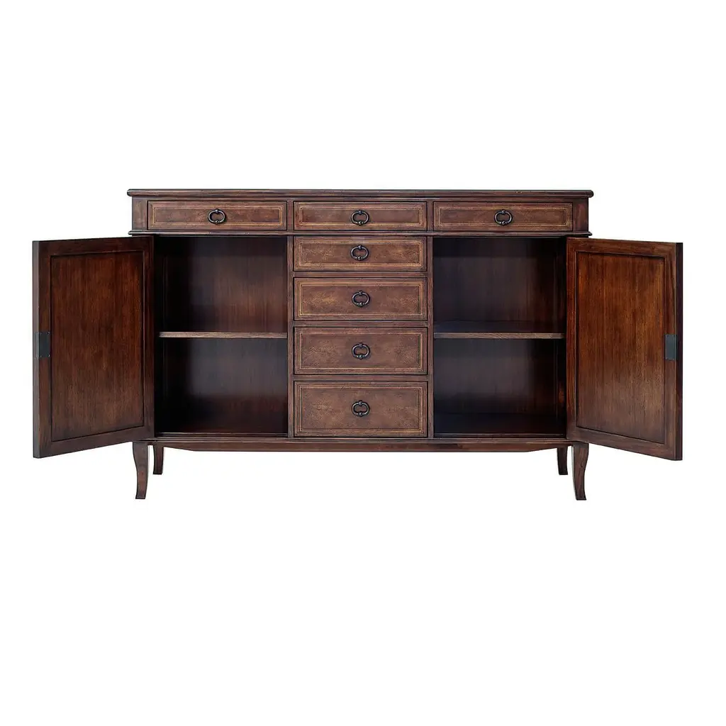 An Italian NeoClassic style mahogany sideboard, the rectangular crossbanded top above three short frieze drawers and four further short graduated drawers to the center flanked by two paneled cabinet doors with wavy 'X' applied decoration, each lockable and enclosing an adjustable shelf, on splayed legs. Dimensions: 60" W x 18" D x 40.25" H