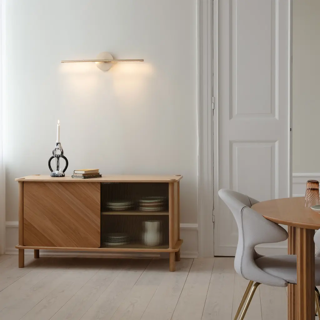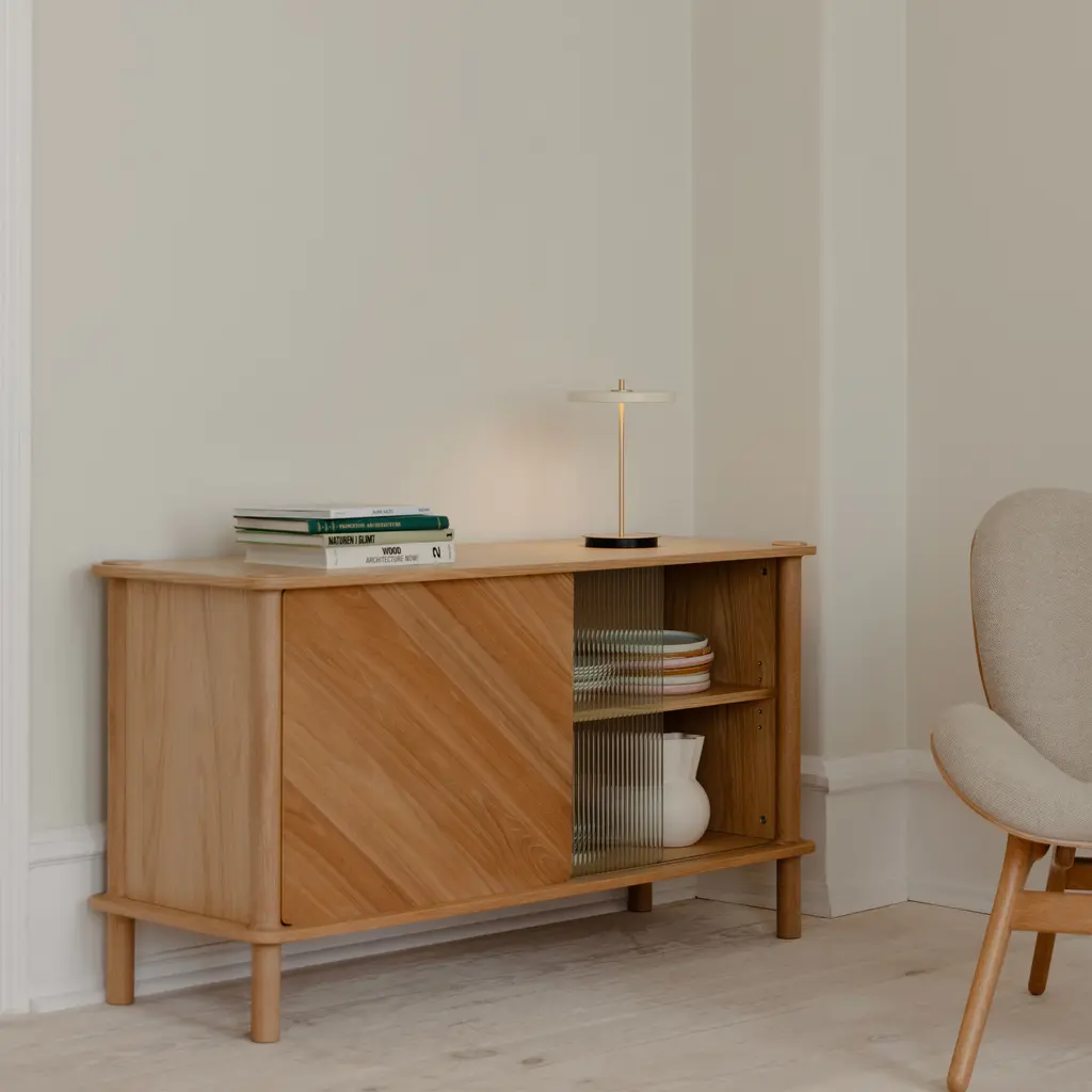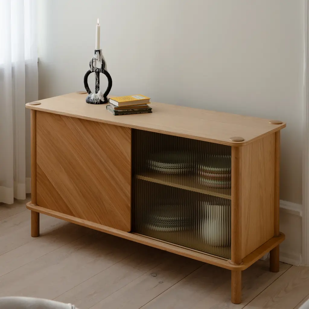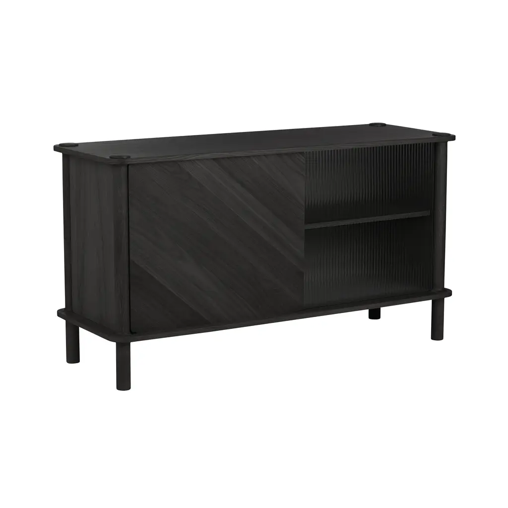 The Italic Sideboard features subtly rounded corners and is crafted from solid and veneered wood, ensuring durability. Designed by Erno Dierckx, this variation offers doors in fluted glass. Available in oak, dark oak, and black.