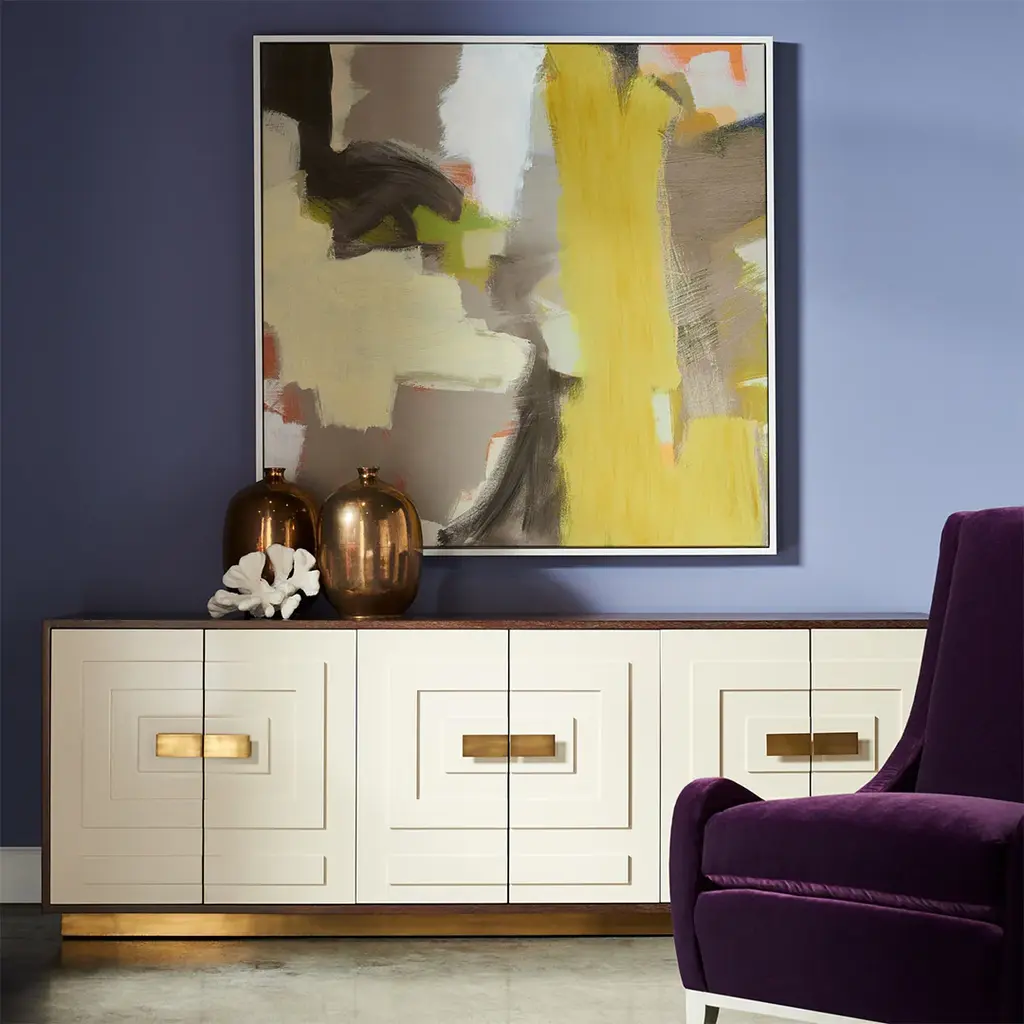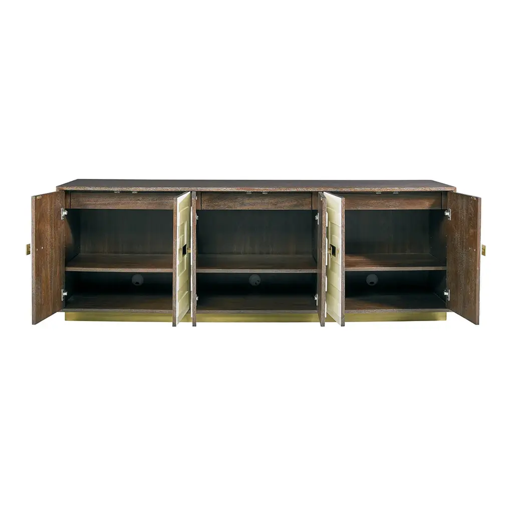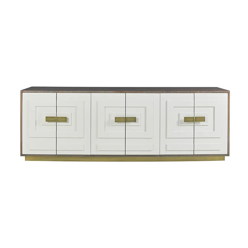 International 60's inspired cabinet with an all walnut case and relief surface patterns on the gloss white doors with oversize brass hardware that ties back to the plinth base. Low long clean lines, great for a living room, dining room, or bedroom. Ships In 4-5 Weeks Adjustable shelves Soft close drawers Walnut wood case This image is for illustrative purposes only. The colors shown are accurate within the constraints of lighting, photography, and the color accuracy of your screen.