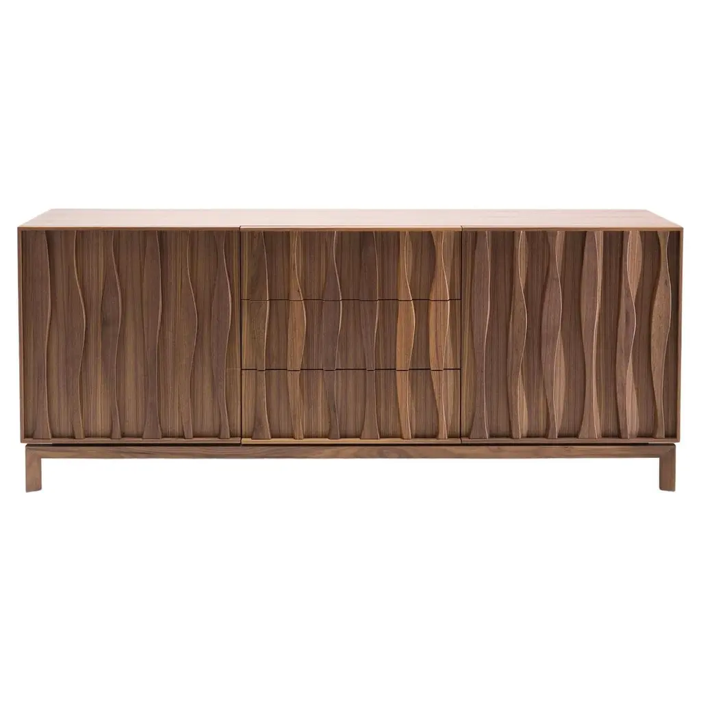 Hand-carved of walnut, this sideboard's classically carved face is enhanced with a dramatic carved swoosh that drifts from corner to corner. No hardware distracts from its clean lines, but it isn't just pretty. Four drawers and two cupboards provide plentiful storage.