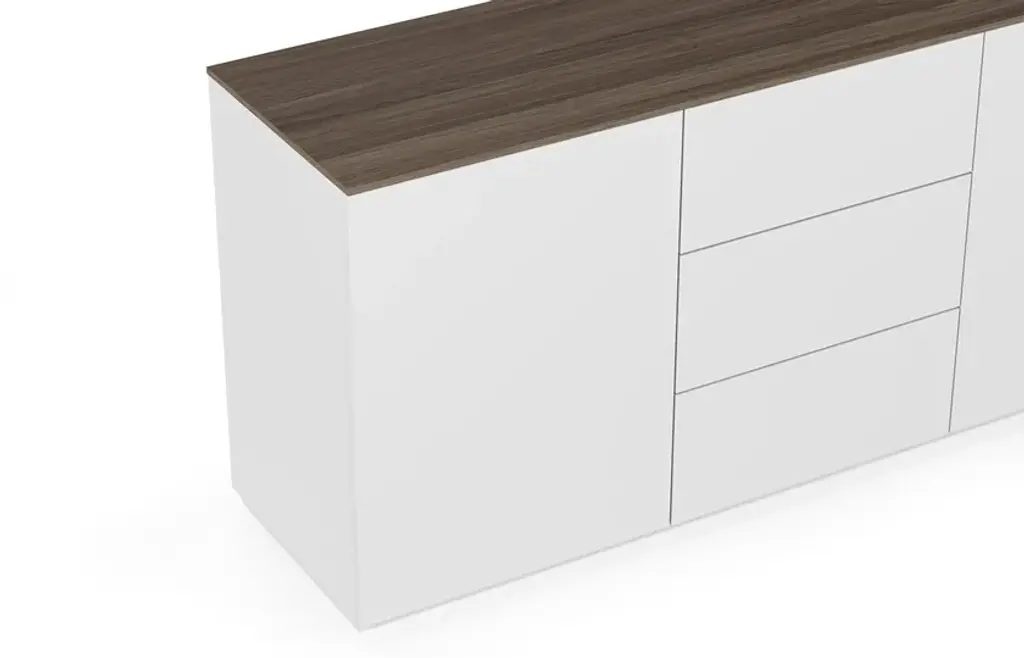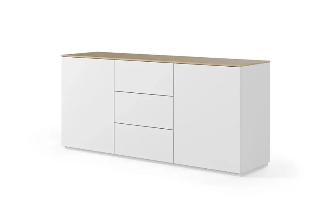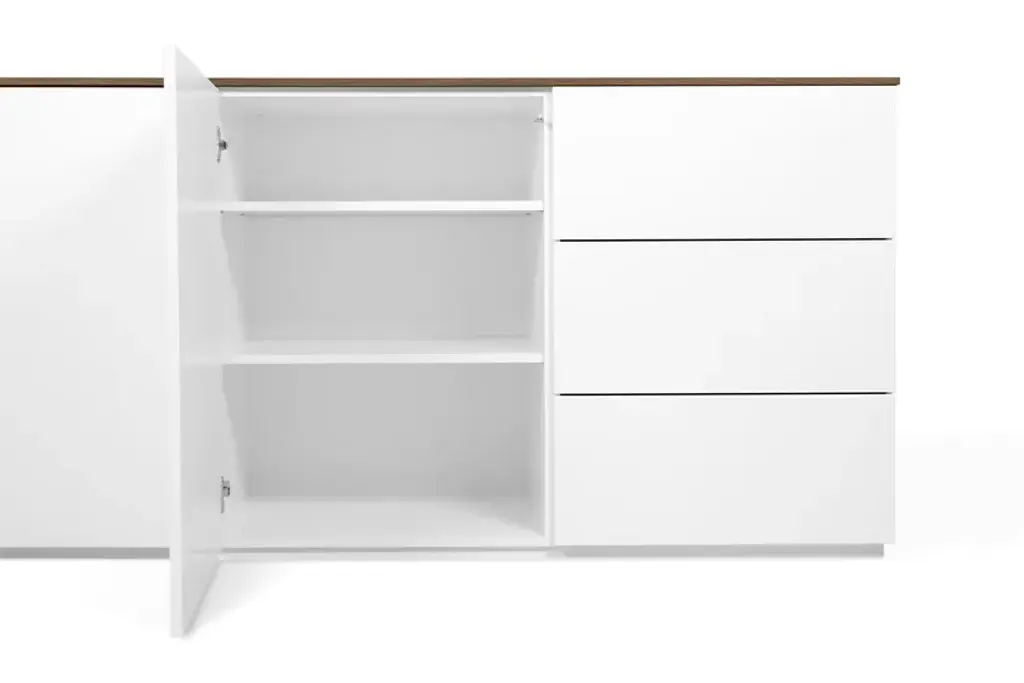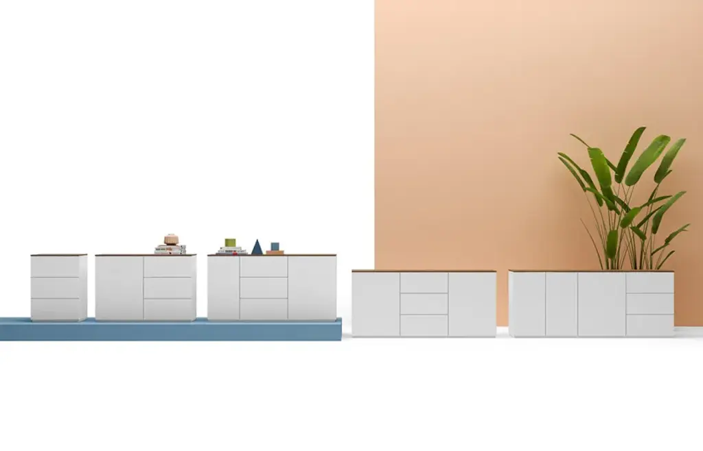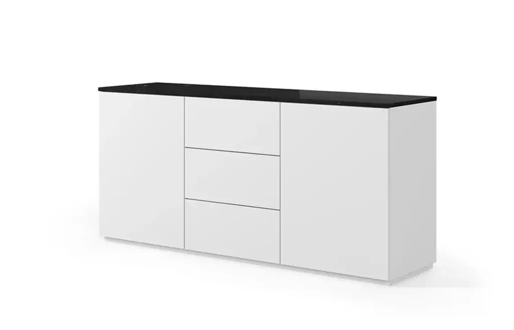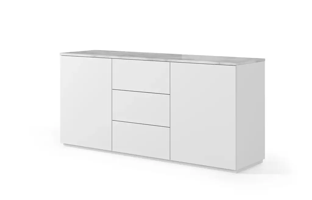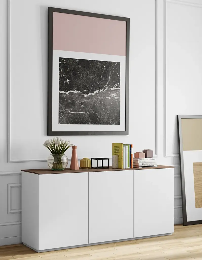Join is a modular system of sideboards designed with focused lines for multifunctional spaces. Join is the perfect fitting for a hallway, living, dining or home office interior, and illustrates perfectly the famous quote from Leonardo Da Vinci: “Simplicity is the ultimate sophistication”. This complete system is available in five different sizes – 60, 120, 160, 180 and 200 cm -, with two possible heights for the sideboard’s body, six diverse finishes for the top - between wood veneer, marble and glass – and two feet options, since you can opt for a more conventional base or a black metallic structure.