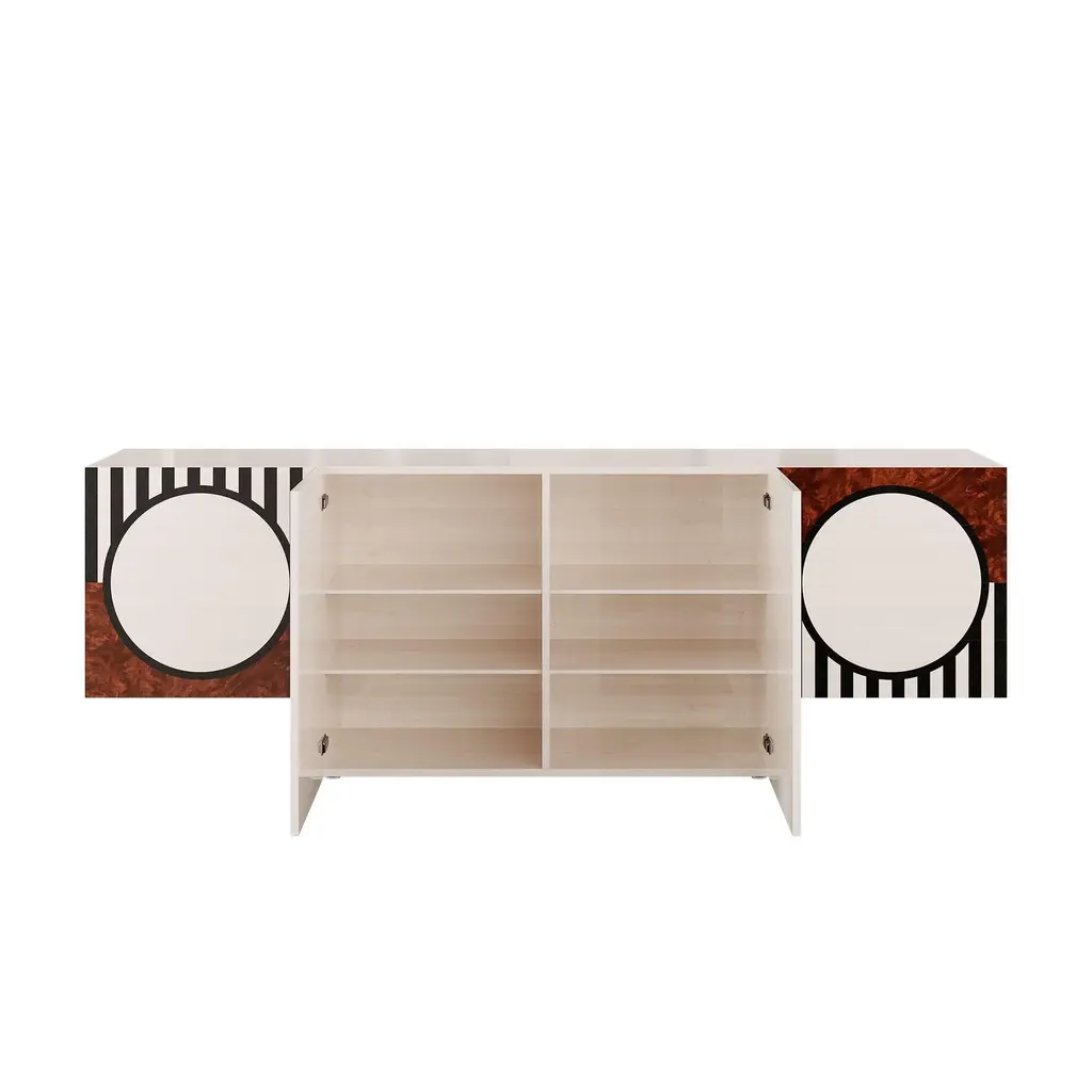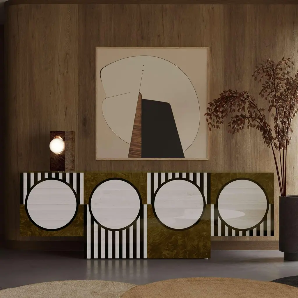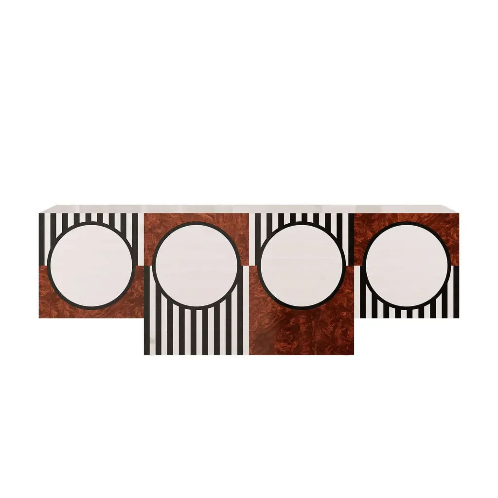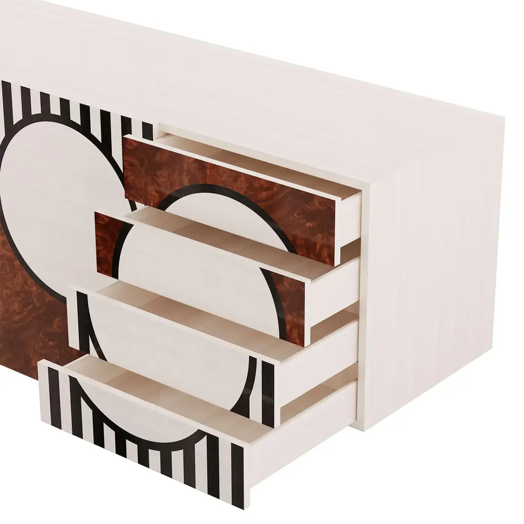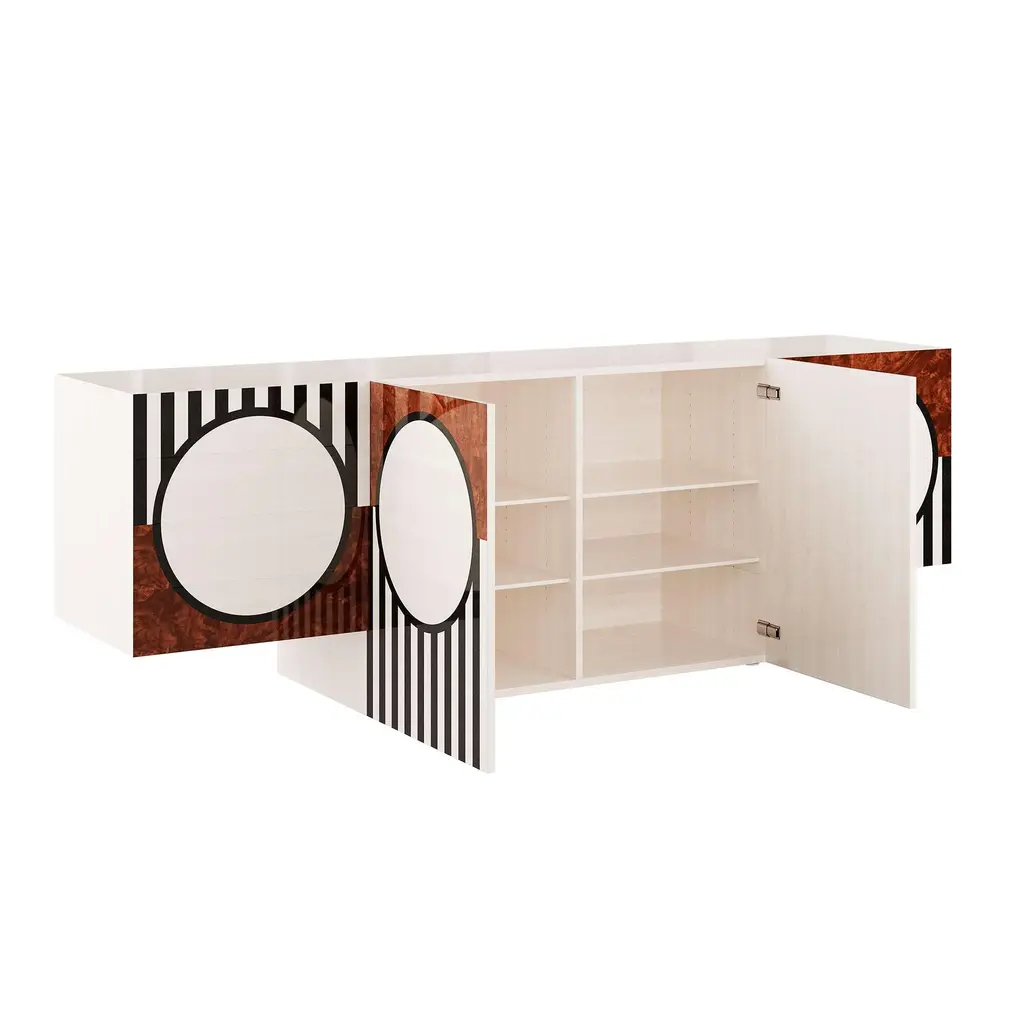 The Jojo Sideboard is designed to infuse your living space with sophistication and creative expression. This modern sideboard showcases impeccable craftsmanship and timeless allure, highlighted by its striking Art Deco geometric pattern inspirations. The Jojo Sideboard promises to enrich any room with its sleek lines and artistic design. It is perfect for contemporary interiors and offers ample storage while serving as a stunning focal point. Whether placed in a dining room, living room, or hallway, this versatile piece enhances the ambiance with its refined presence and unique aesthetic. Dimensions: Width: 240 cm | 94.5 in – Depth: 55 cm | 21.7 in – Height: 82 cm | 32.3 in Materials: Doors in Marquetry Gloss Black Bird Eye; White Maple, Walnut Root Structure and interior in Gloss White Maple