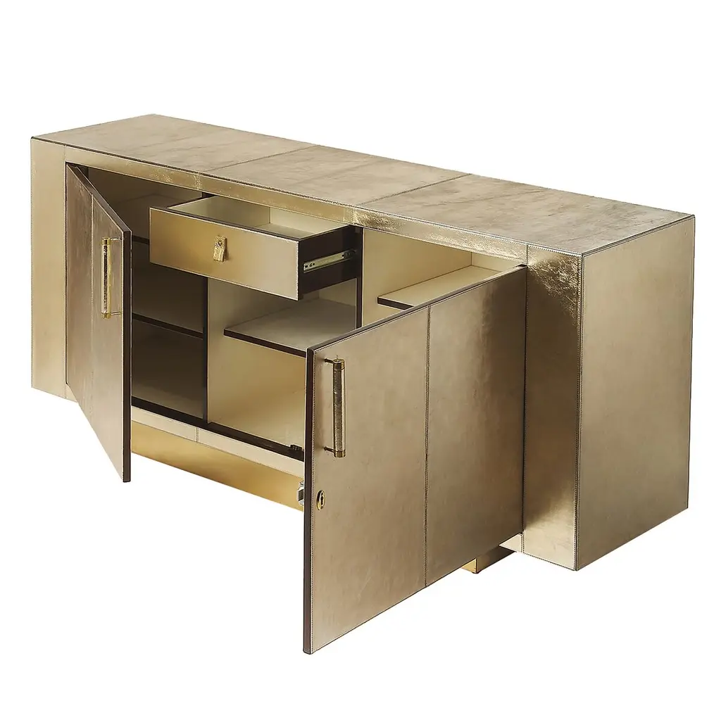 This modern buffet is a masterpiece of elegance and sophistication, captivating in every conceivable way. Its sleek lines are adorned with finely tailored leather, resting gracefully on a platform base. The buffet's doors open to reveal a luxurious interior, fully lined in polysuede with exquisite wood trim. Inside, you'll find adjustable shelves in the side storage compartments and a center storage compartment, along with a tray drawer featuring a leather front and smooth ball-bearing glides. This piece is masterfully crafted from the finest wood solids and products, a testament to impeccable craftsmanship and timeless beauty.