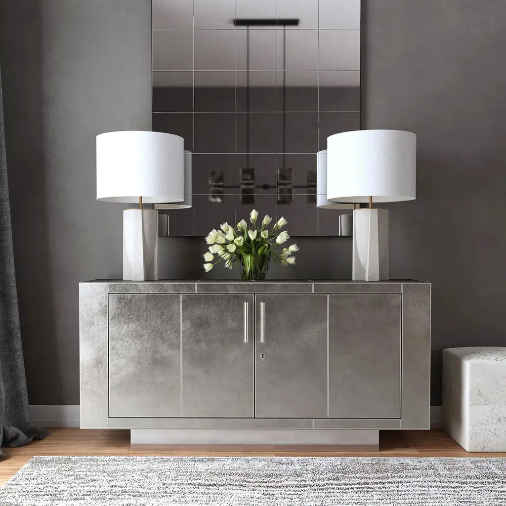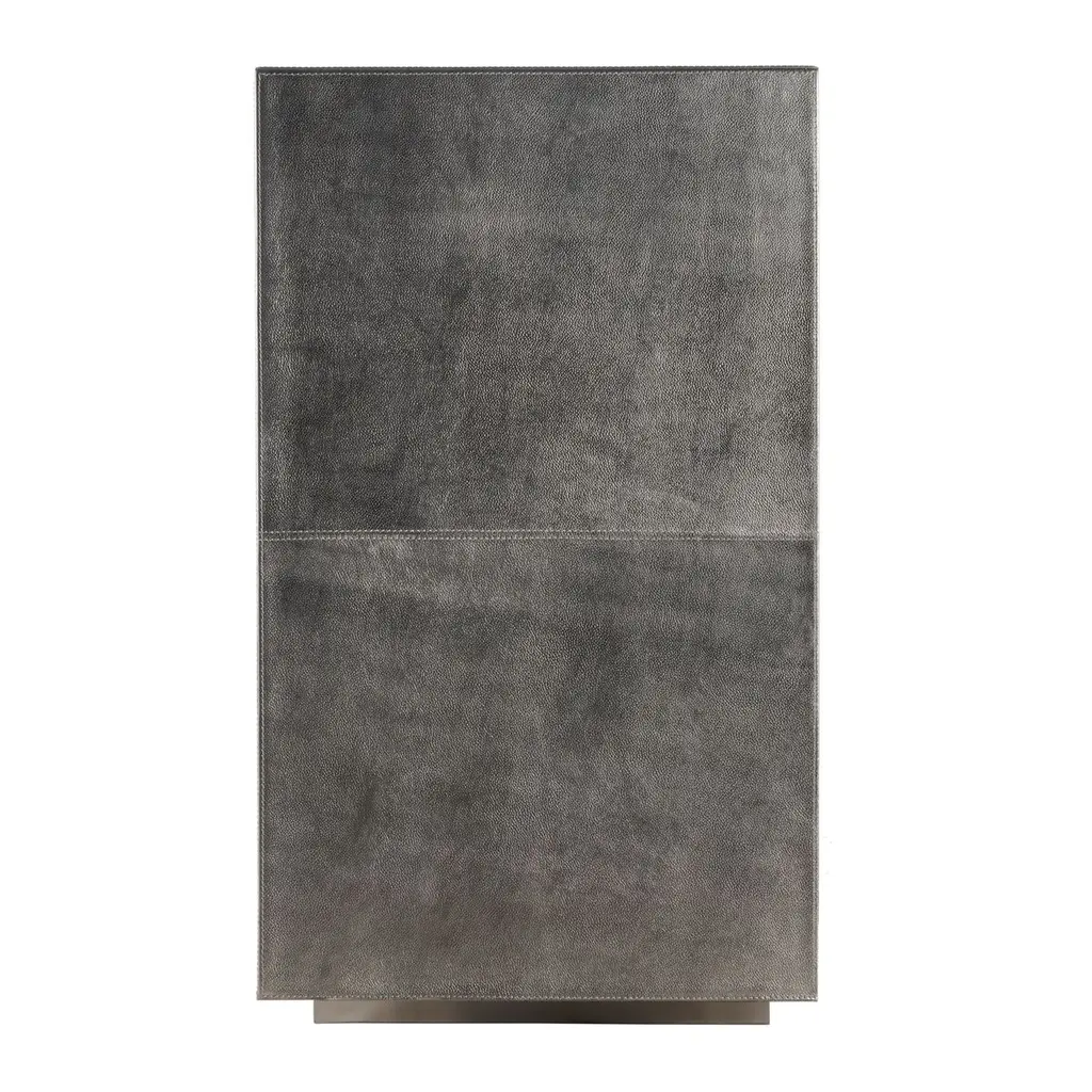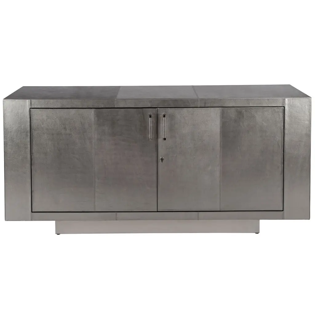 This modern buffet is a masterpiece of elegance and sophistication, captivating in every conceivable way. Its sleek lines are adorned with finely tailored leather, resting gracefully on a platform base. The buffet's doors open to reveal a luxurious interior, fully lined in polysuede with exquisite wood trim. Inside, you'll find adjustable shelves in the side storage compartments and a center storage compartment, along with a tray drawer featuring a leather front and smooth ball-bearing glides. This piece is masterfully crafted from the finest wood solids and products, a testament to impeccable craftsmanship and timeless beauty.