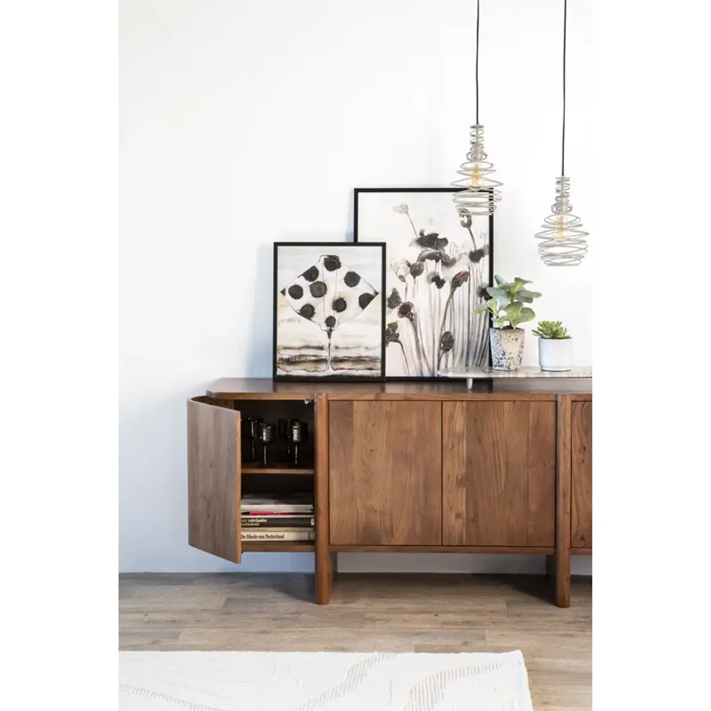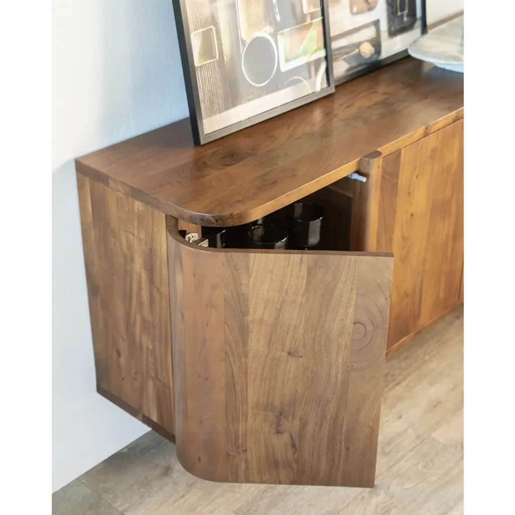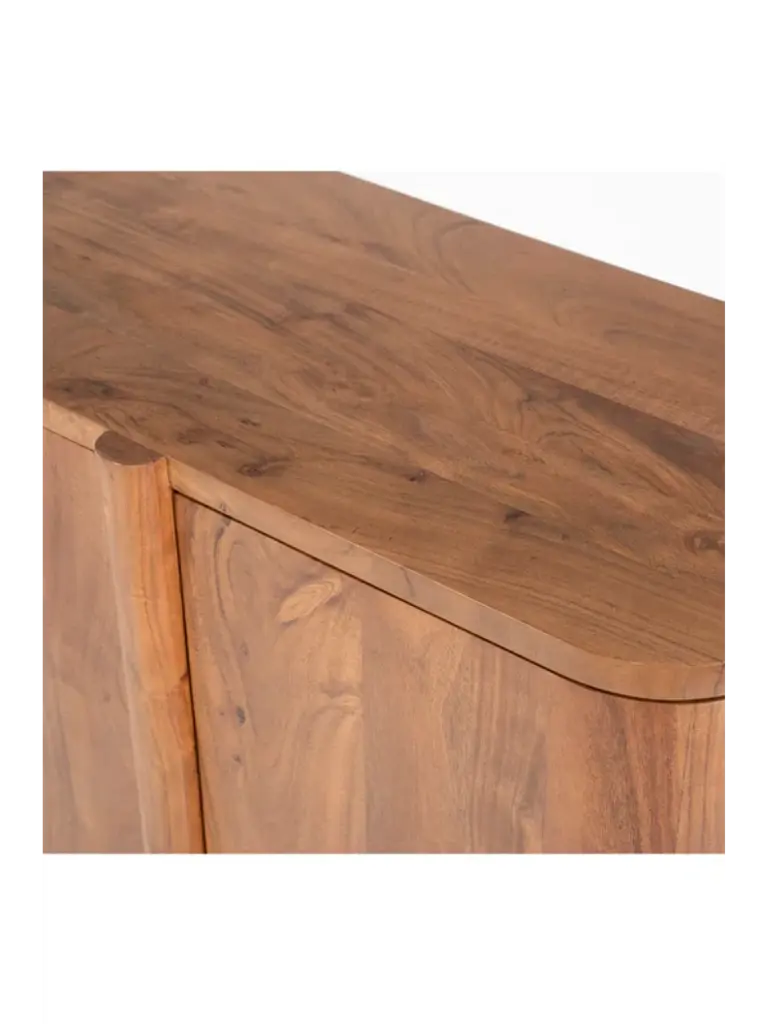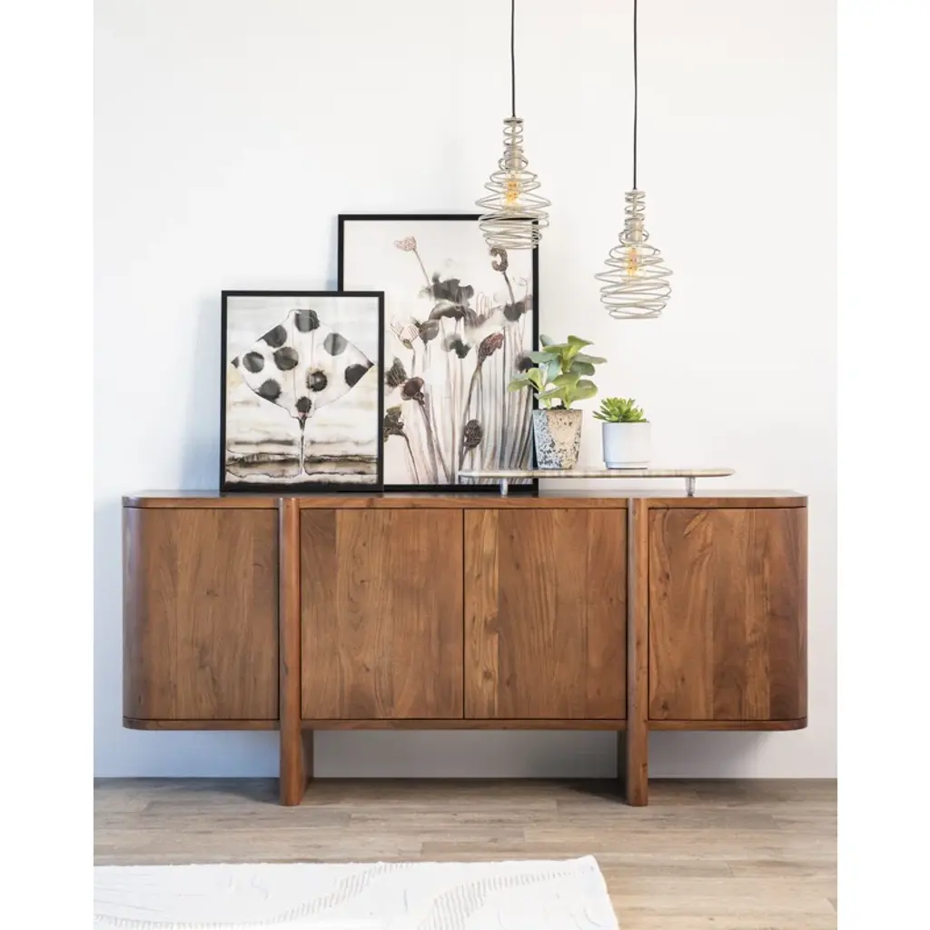Seasoned brown acacia forms curved legs and the cabinets of this sideboard. Generous space for all dining storage needs.