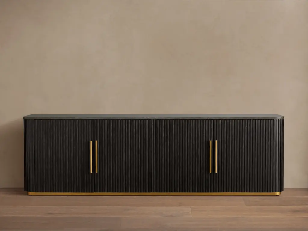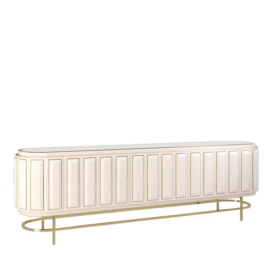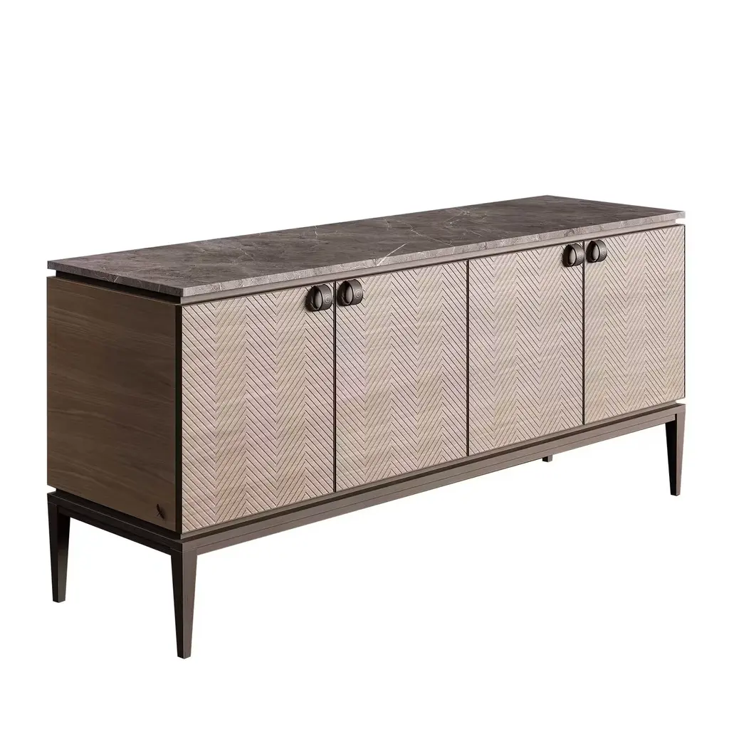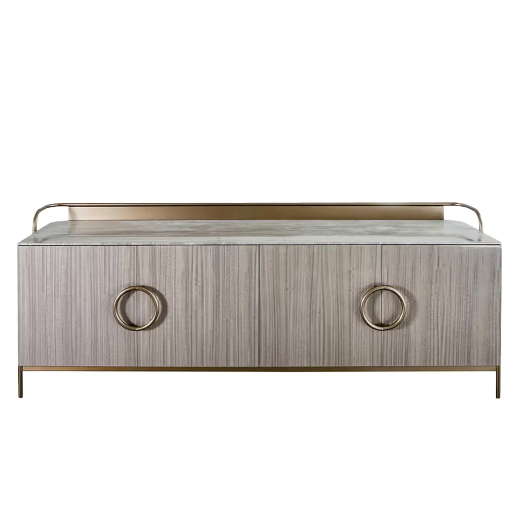 The sideboard has two central doors and a marble top. The lower part is covered with a metal band in the copper finish, and an application of nabuck that runs along the lower perimeter expands the possibility of customization.