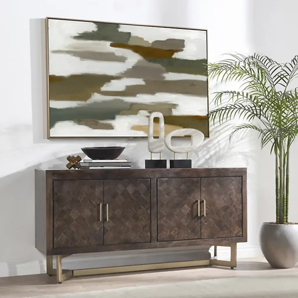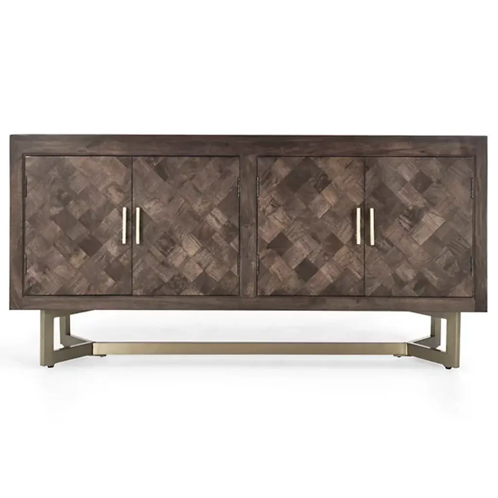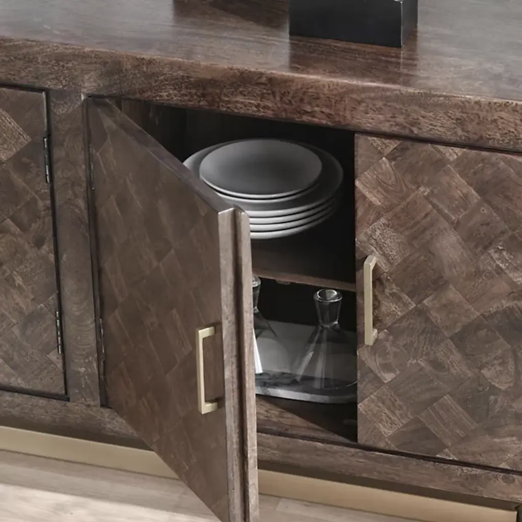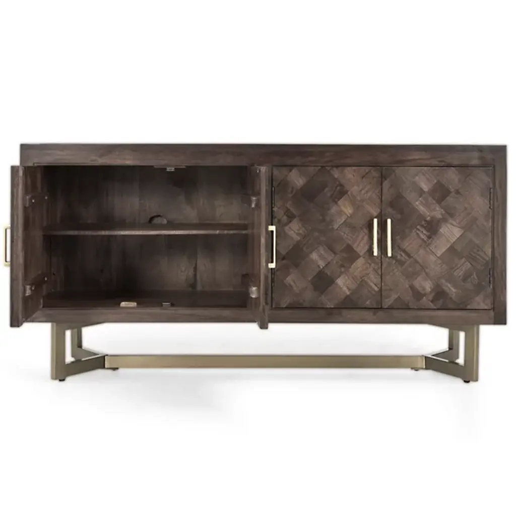 The Kade Sideboard from Classic Home blends form and function with artisanal flair. Made in India from solid mango wood, its hand-finished, distressed surface exudes rustic charm, while the four doors open to reveal fixed shelves for ample storage. The angular iron base features outward-angled legs with a branching design, adding a contemporary edge. Perfect for dining rooms or living spaces, this sideboard offers a stylish solution optimized for organization and display.