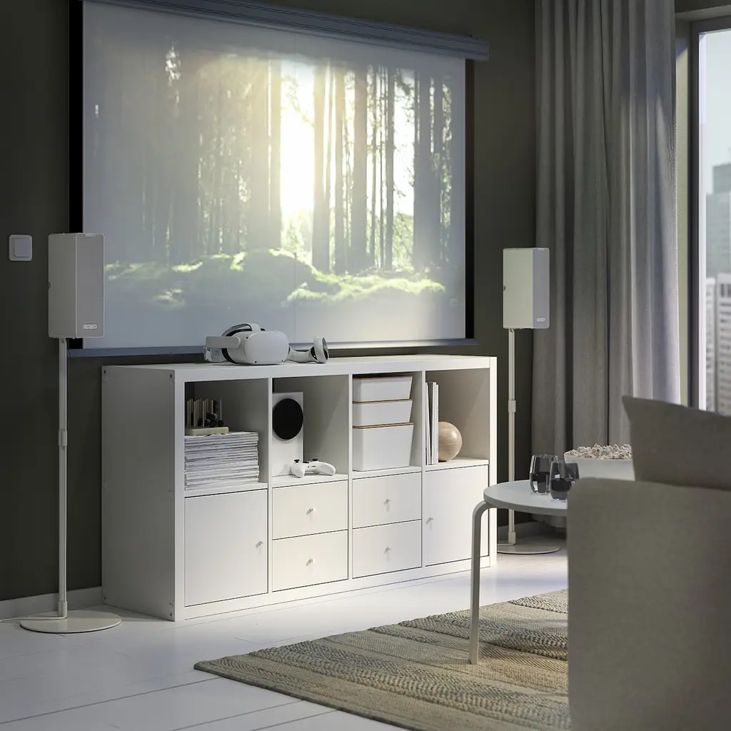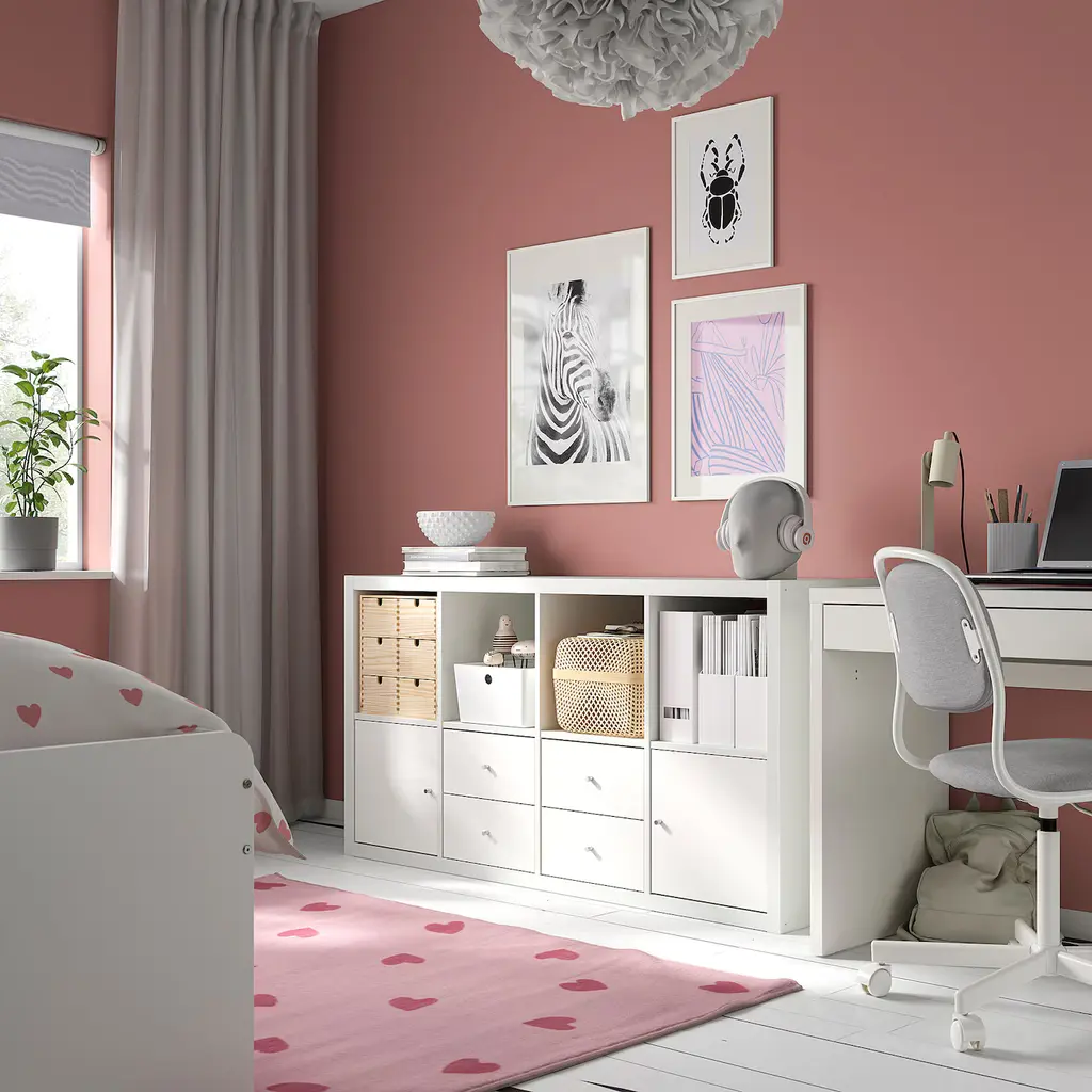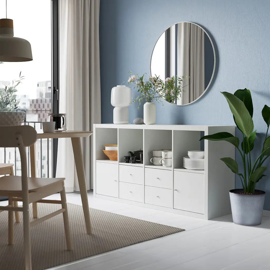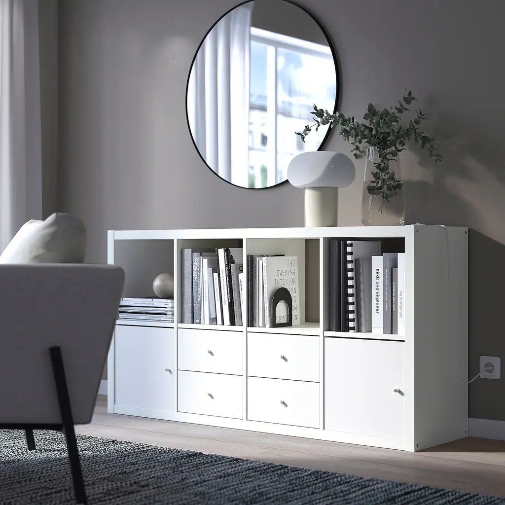 KALLAX Shelf unit with 4 inserts - white 57 5/8x30 1/8 ". The practical inserts hide things and help maintain a clean and tidy look. Choose whether you want to place it vertically or horizontally to use it as a shelf or sideboard.