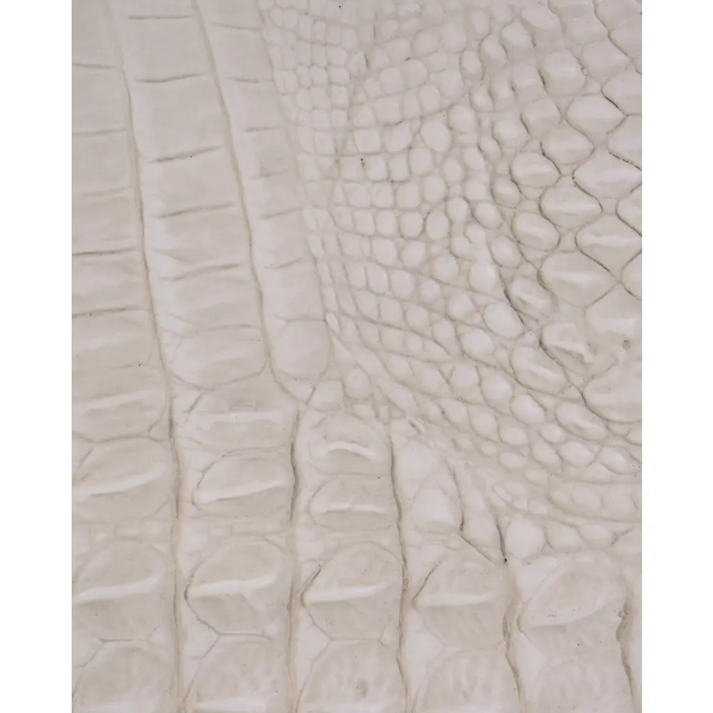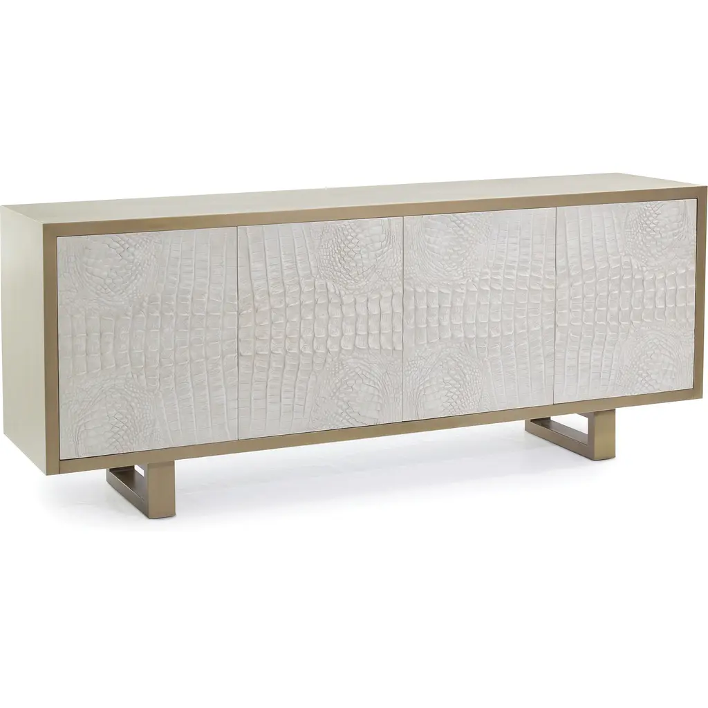 This modern sideboard features a book-matched faux crocodile pattern across each pair of doors finished in variegated cream and white. The case is finished in antique beluga with brushed brass on the front molding and metal base. Pus