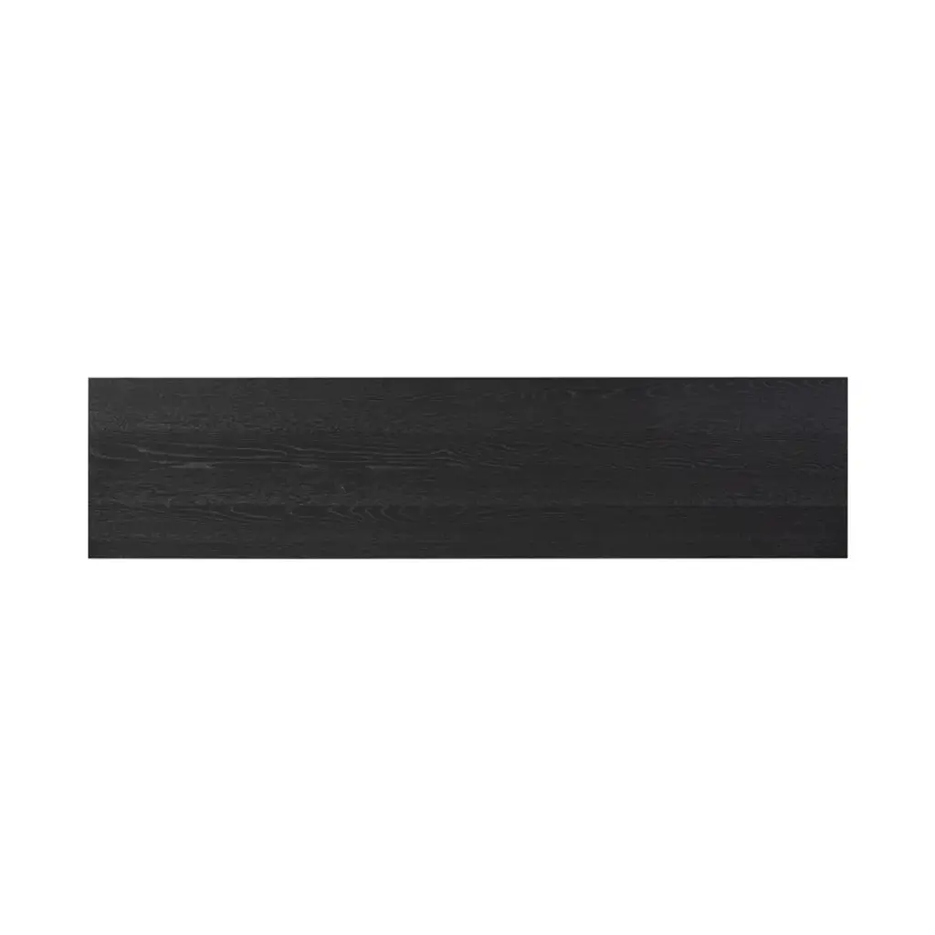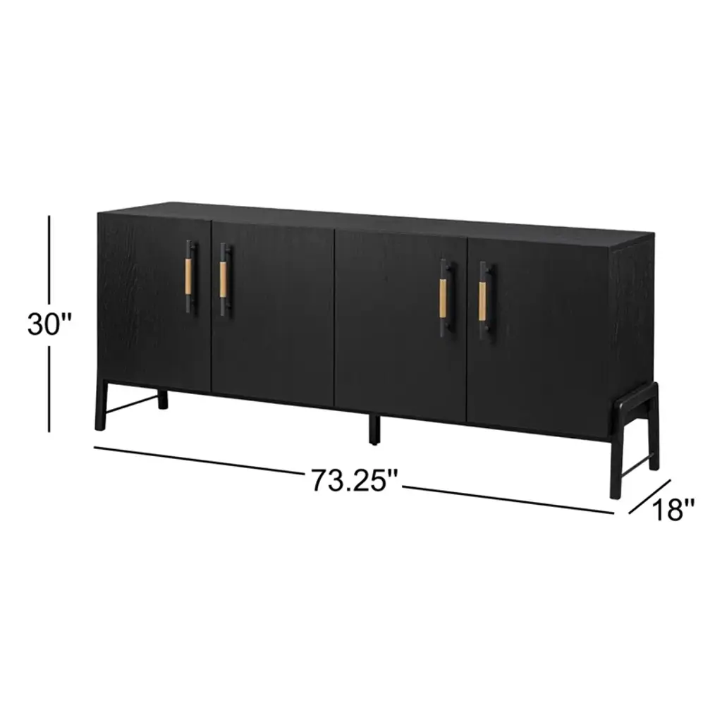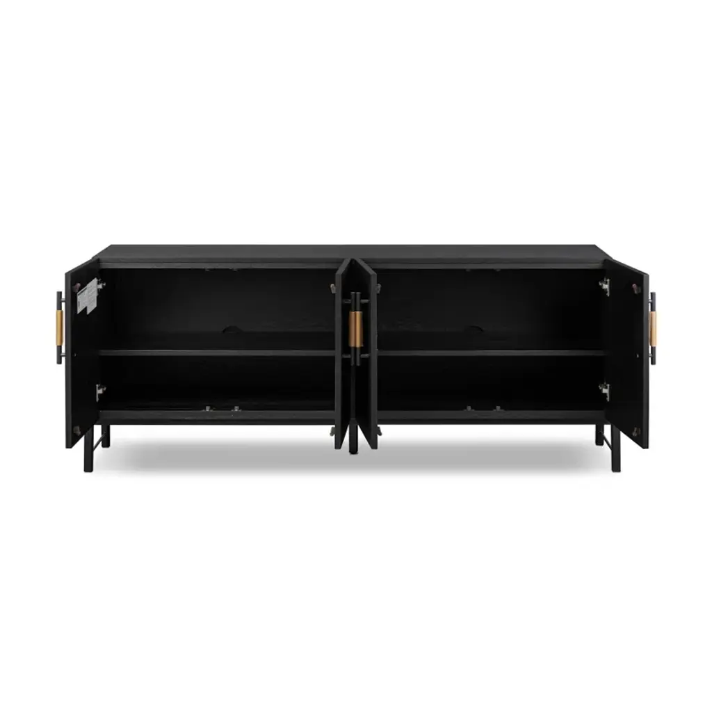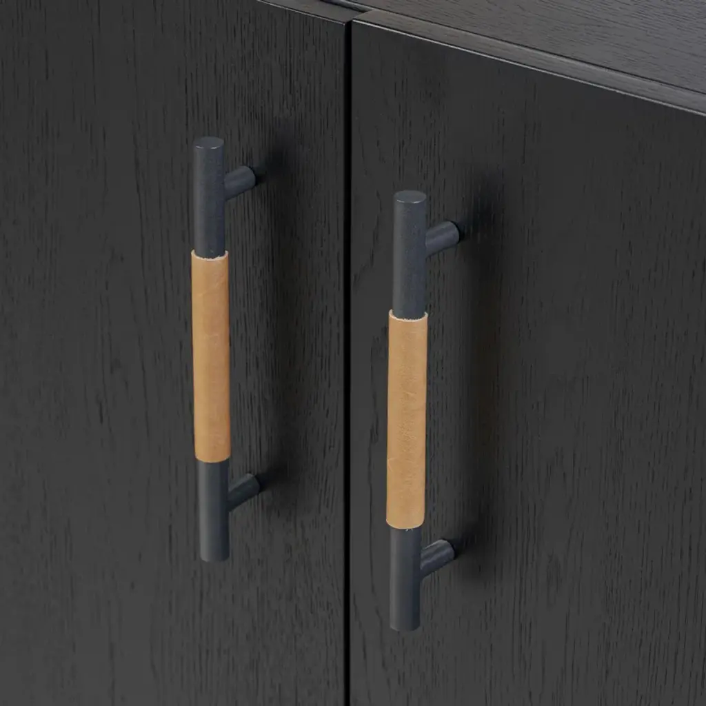 Accented with iron hardware wrapped in tan top-grain leather, light-finished oak veneer forms a clean silhouette with plenty of storage. Outset legs add an element of interest.