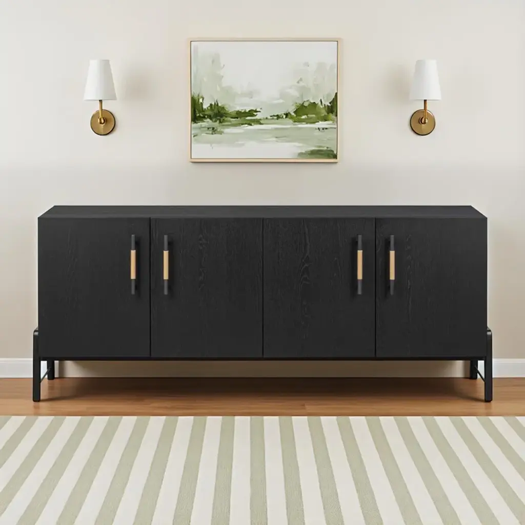 Accented with iron hardware wrapped in tan top-grain leather, light-finished oak veneer forms a clean silhouette with plenty of storage. Outset legs add an element of interest.