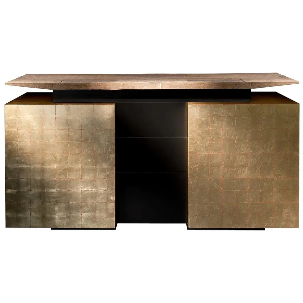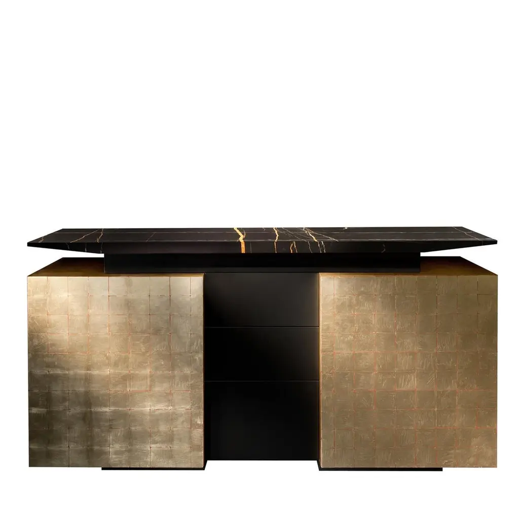 Modern sophistication and a unique, refined allure define this magnificent sideboard. A testament to impeccable craftsmanship, it is fashioned of wood with a Nero Guinea marble top showcasing bright, natural veins. The two doors with inner shelves boast a luminous golden finish, while the three central drawers are finished with a glossy black polyurethane lacquer. This sideboard is available with the top in barnwood or Dover White marble, and other finishes upon request.