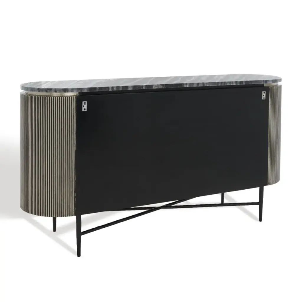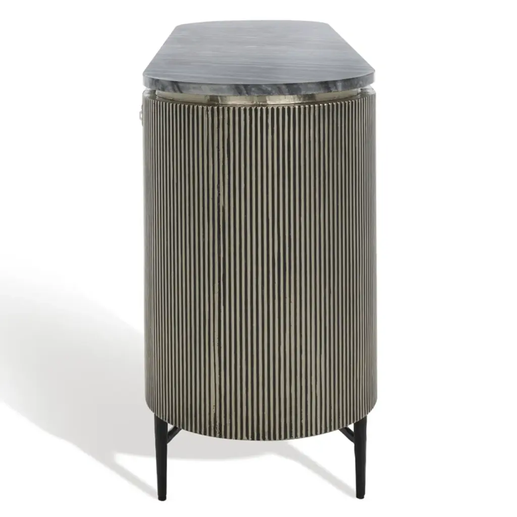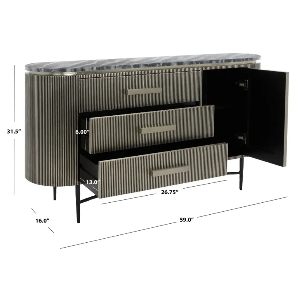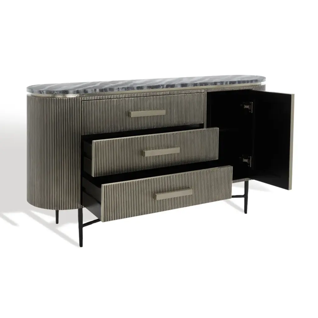 Art deco decadence gets a thoroughly modern makeover in this fabulous hand-painted sideboard. This sideboard's expansive oval silhouette flaunts intricately grooved details that are further enhanced by the shimmering silver pulls on its three drawers and single door, while its sleek marble top is the epitome of glamour.