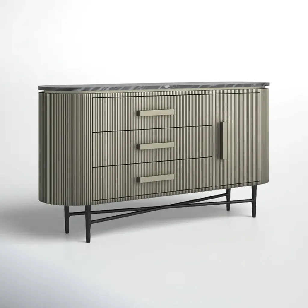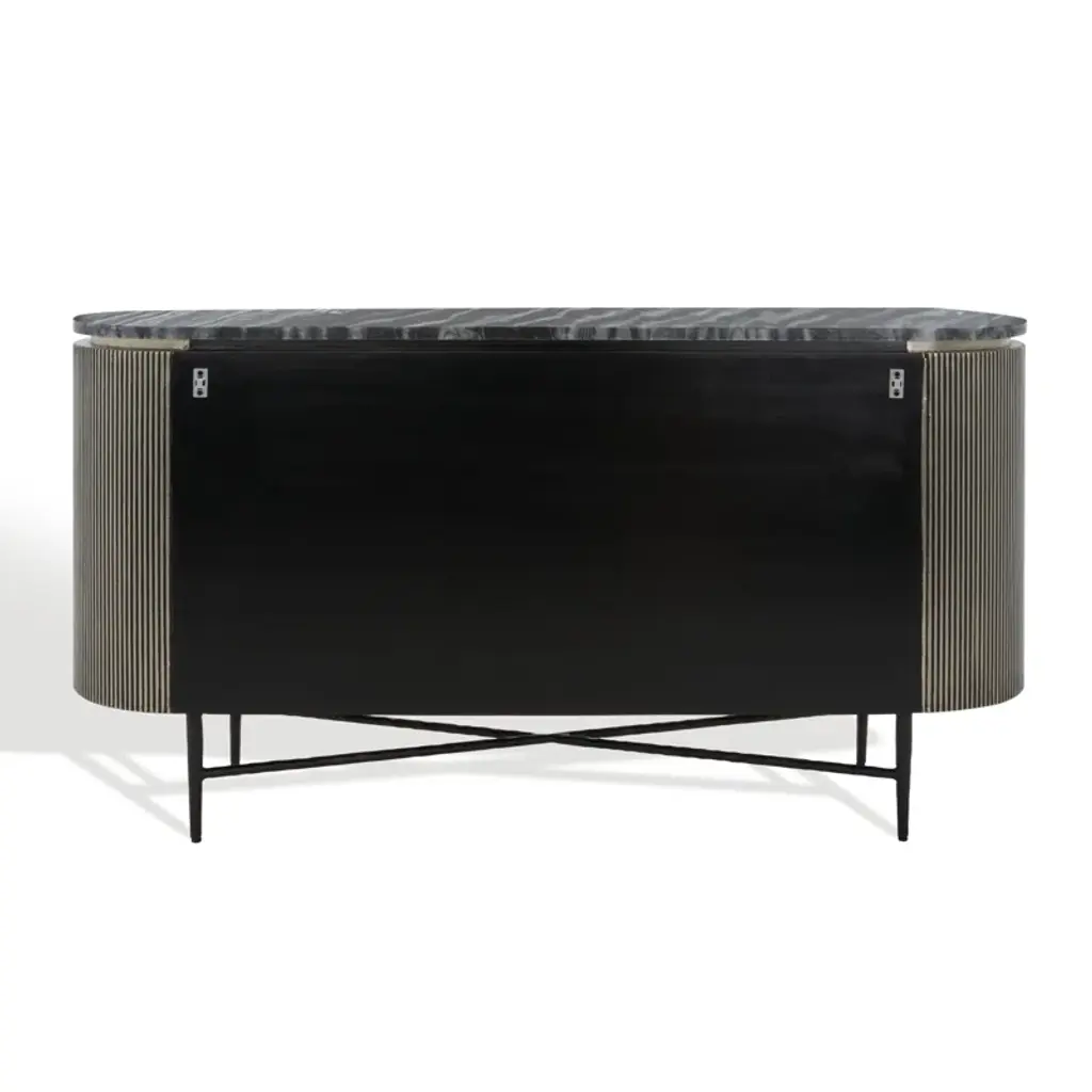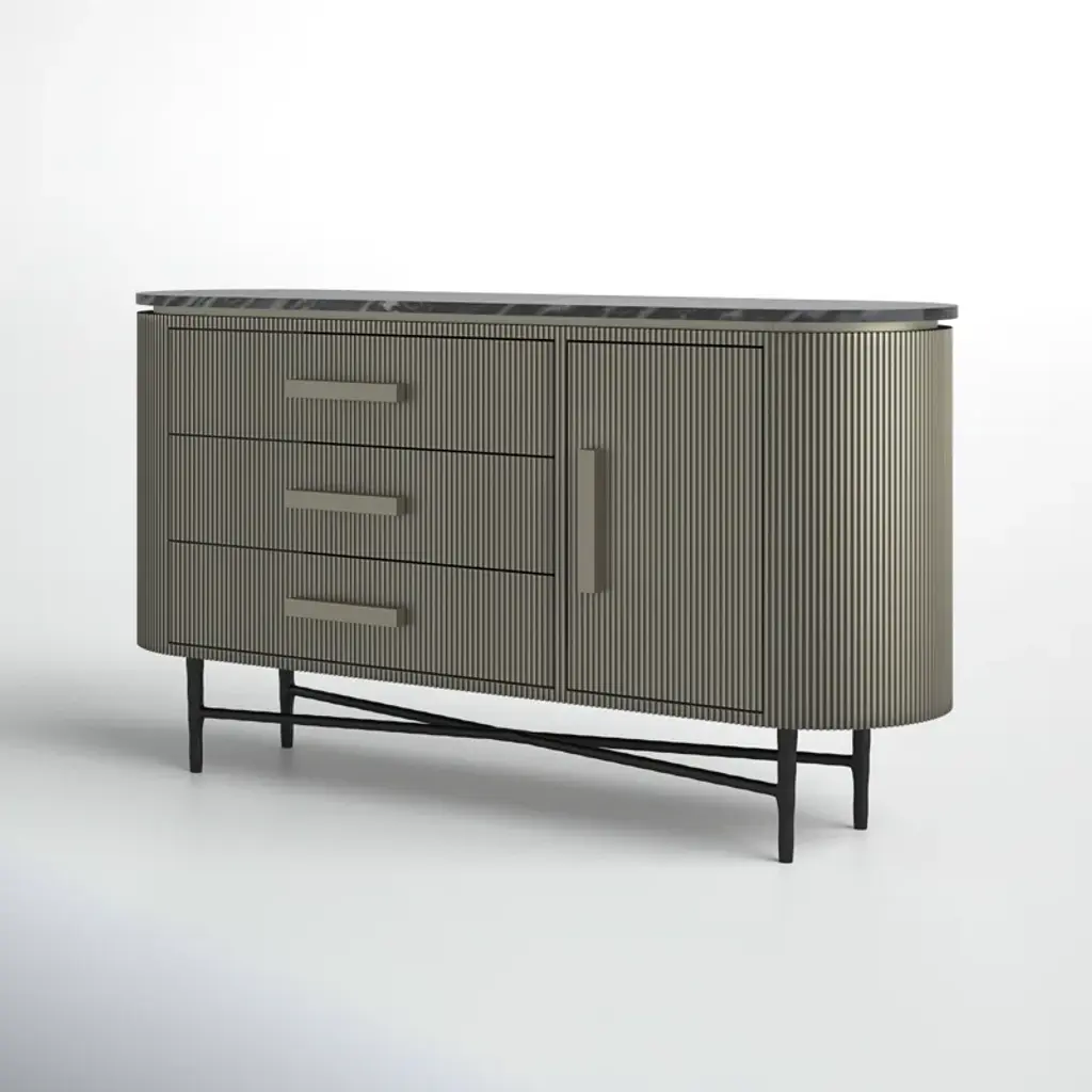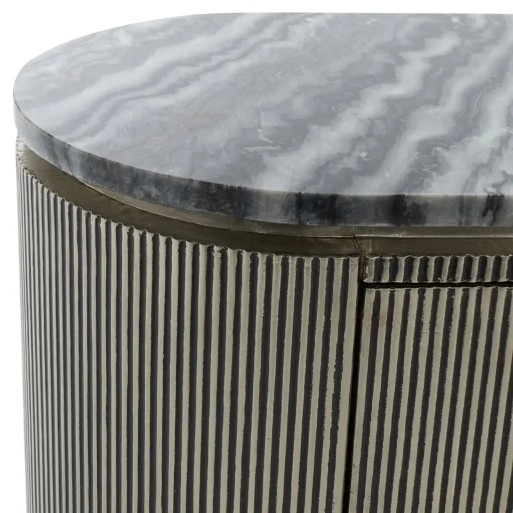 Art deco decadence gets a thoroughly modern makeover in this fabulous hand-painted sideboard. This sideboard's expansive oval silhouette flaunts intricately grooved details that are further enhanced by the shimmering silver pulls on its three drawers and single door, while its sleek marble top is the epitome of glamour.