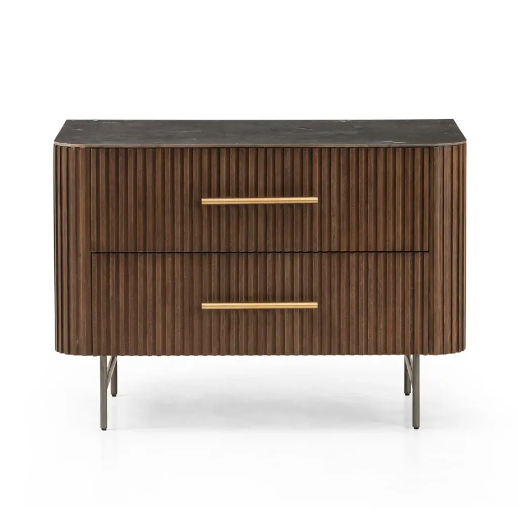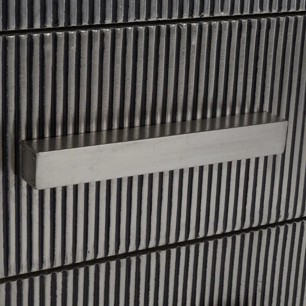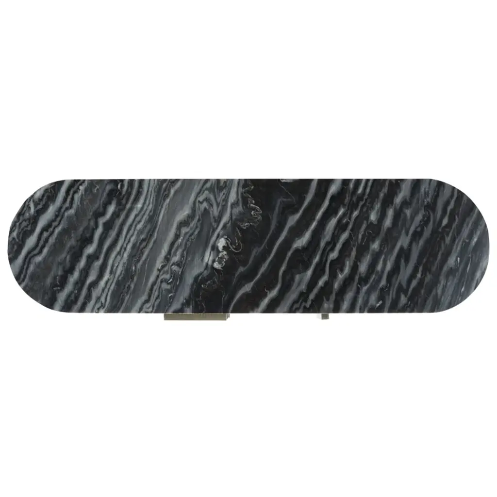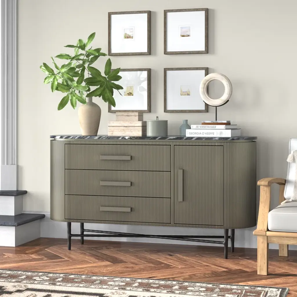 Art deco decadence gets a thoroughly modern makeover in this fabulous hand-painted sideboard. This sideboard's expansive oval silhouette flaunts intricately grooved details that are further enhanced by the shimmering silver pulls on its three drawers and single door, while its sleek marble top is the epitome of glamour.