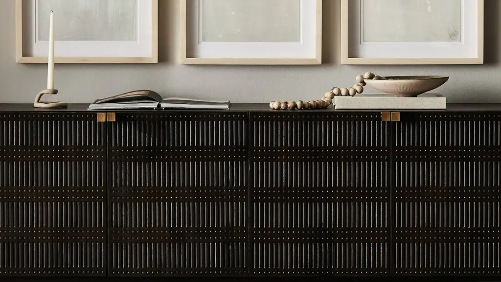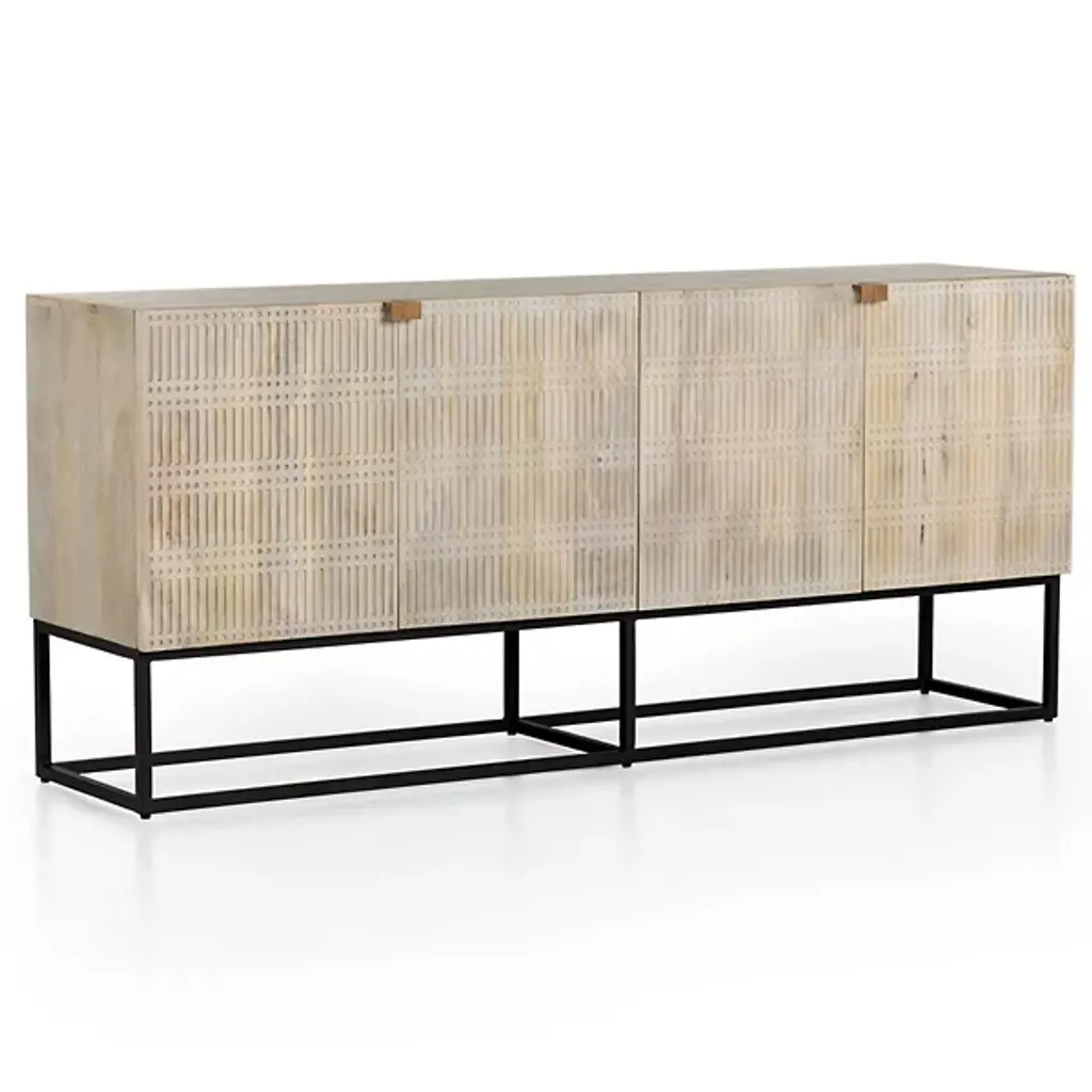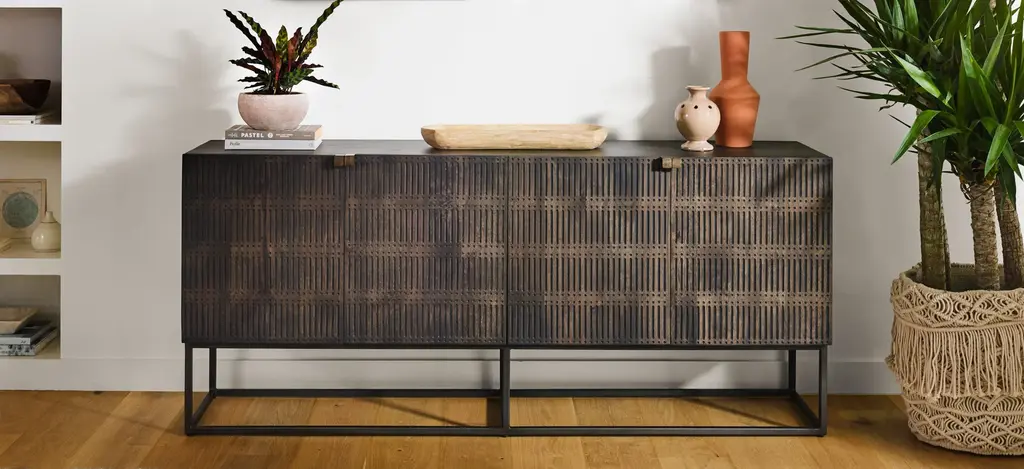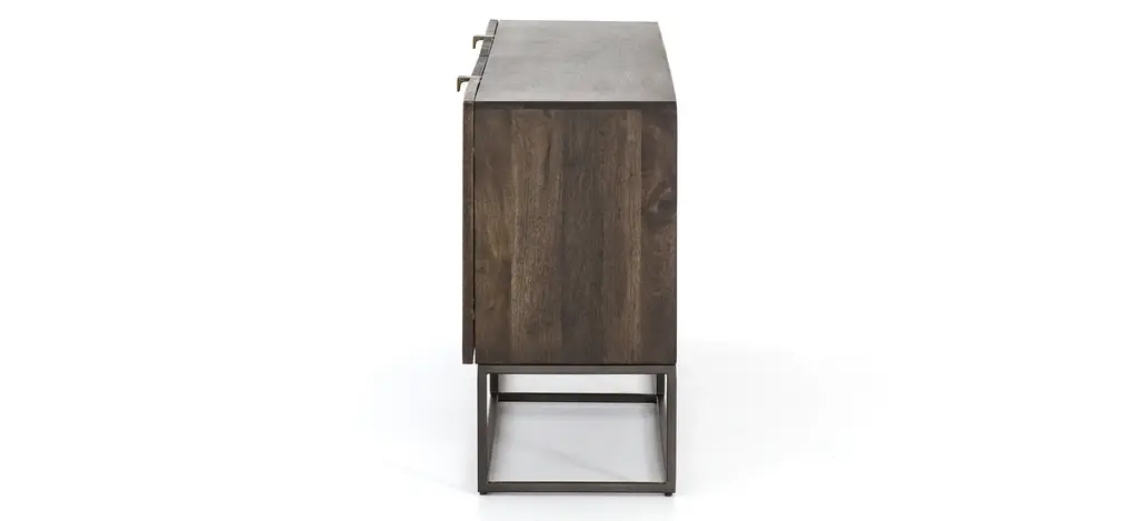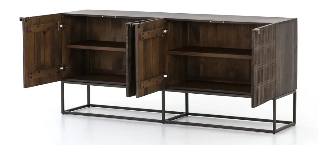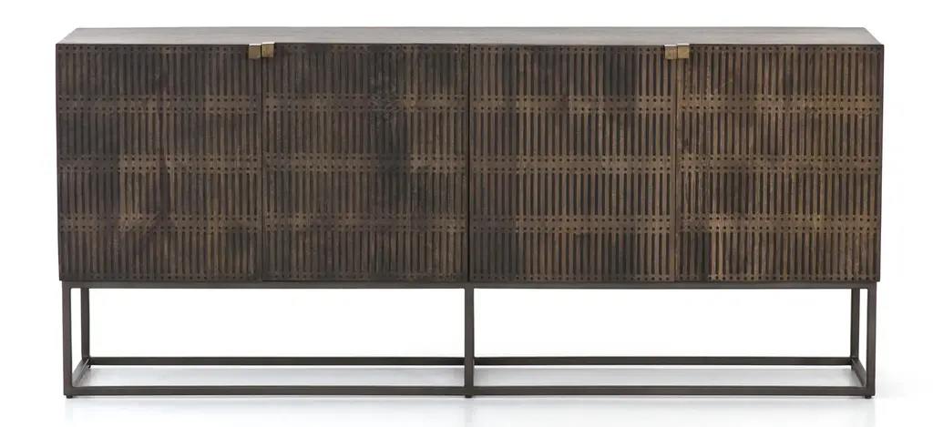 Unique linear carving meets fresh dimension with an artisan slant. Mango wood casing is finished in a vintage brown, highlighting texture and high craftsmanship. A slim iron base adds an airy, cage-like look to clean-lined storage.