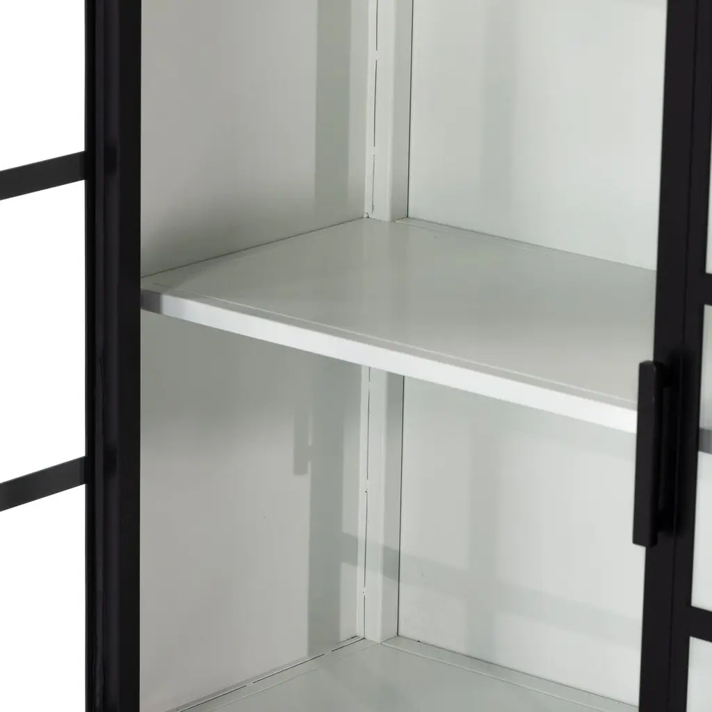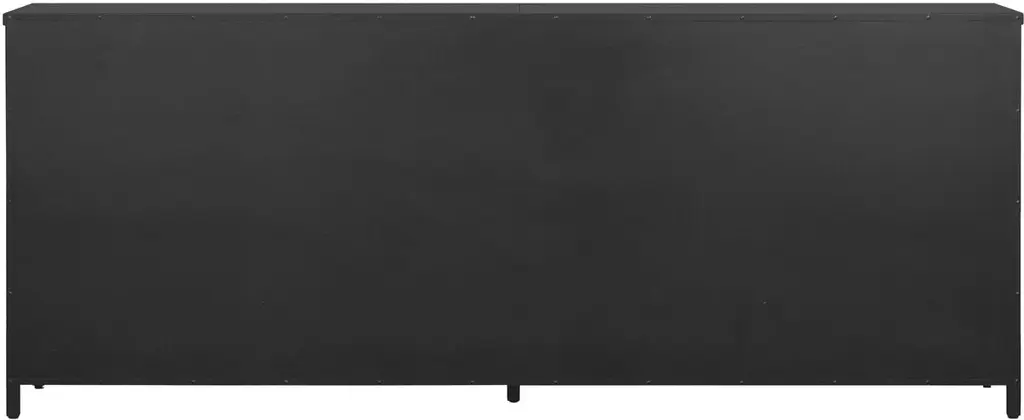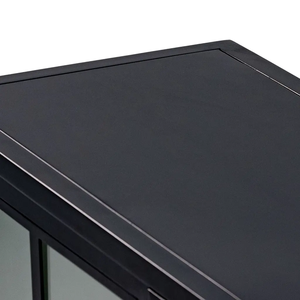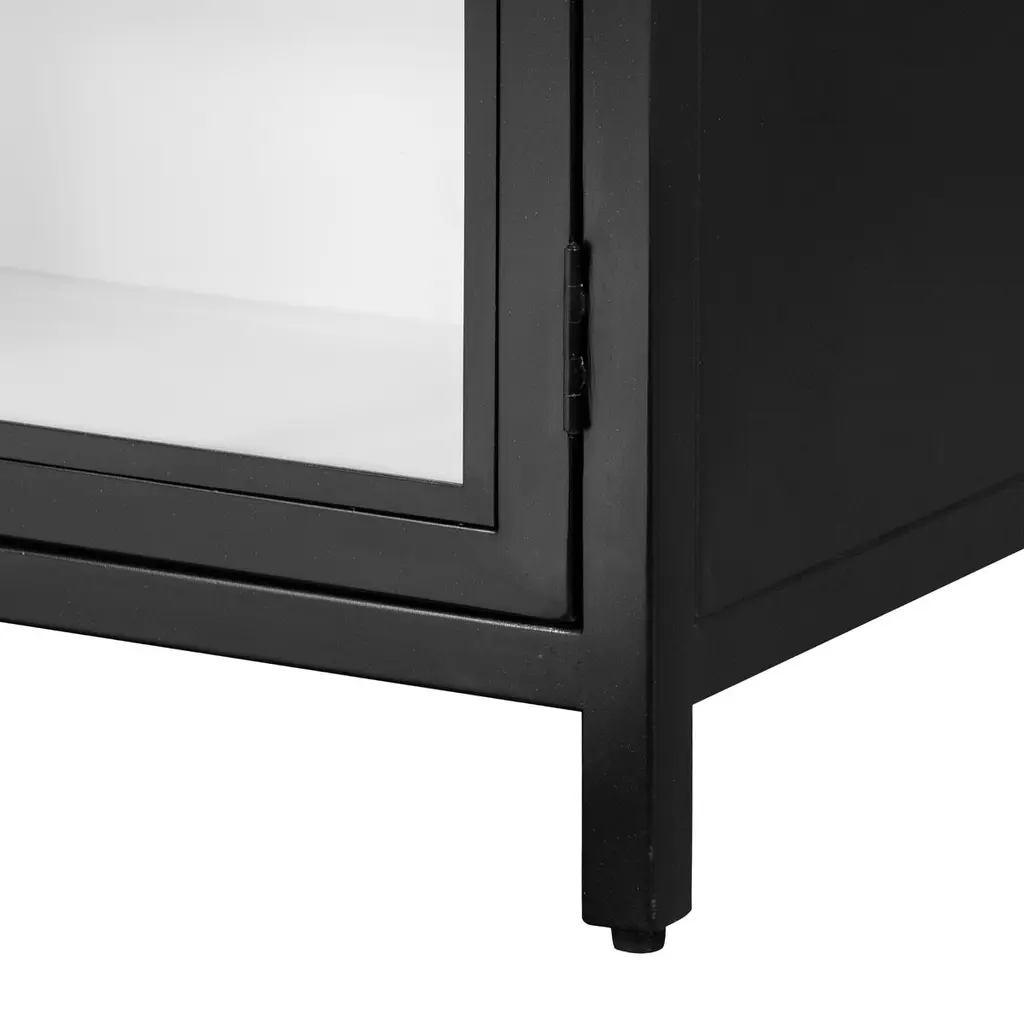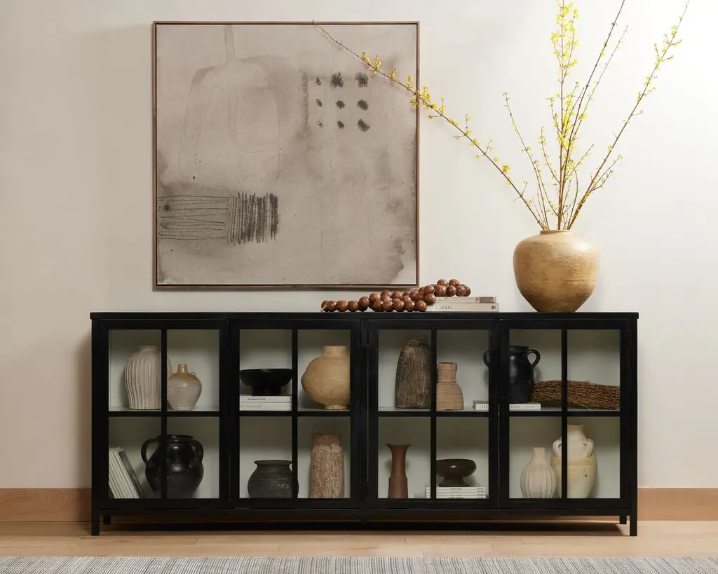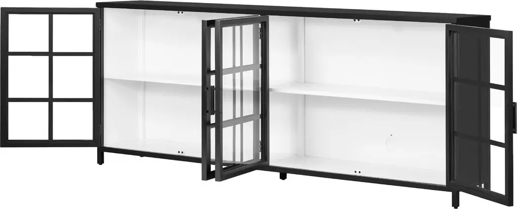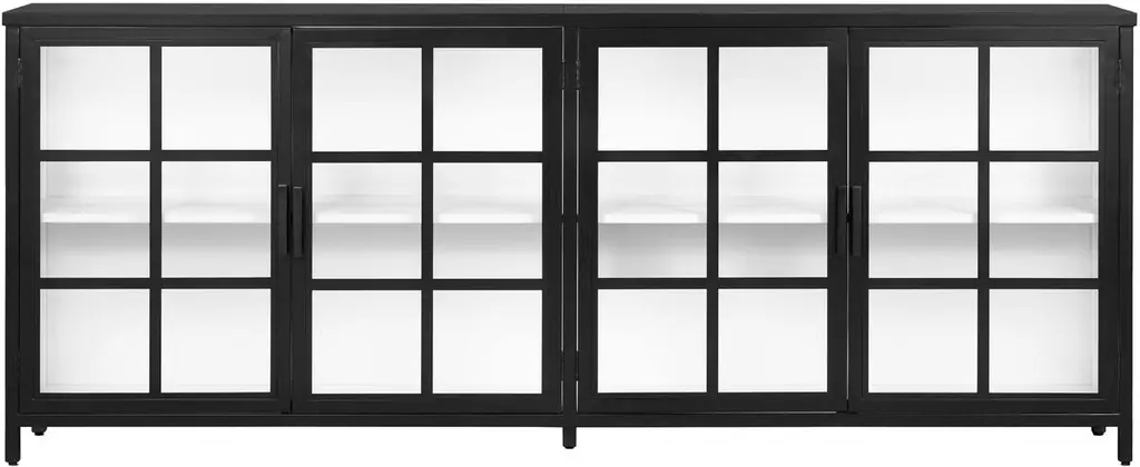 This versatile piece can serve as a dining room sideboard, a living room media cabinet, or an office bookcase. Made of iron with tempered-glass door panels, it features shelves as well as rear cutouts for cord management. Its classic, timeless style makes it a welcome addition to traditional and contemporary rooms alike.