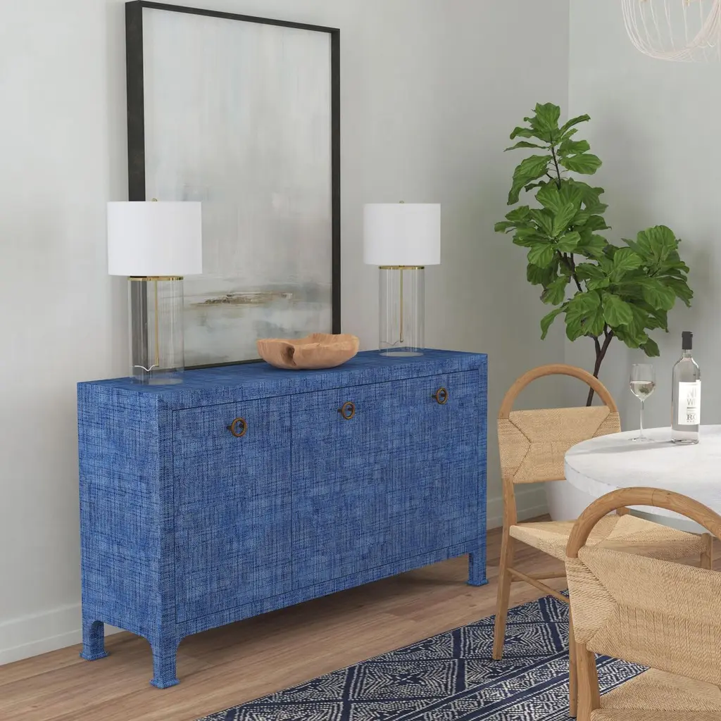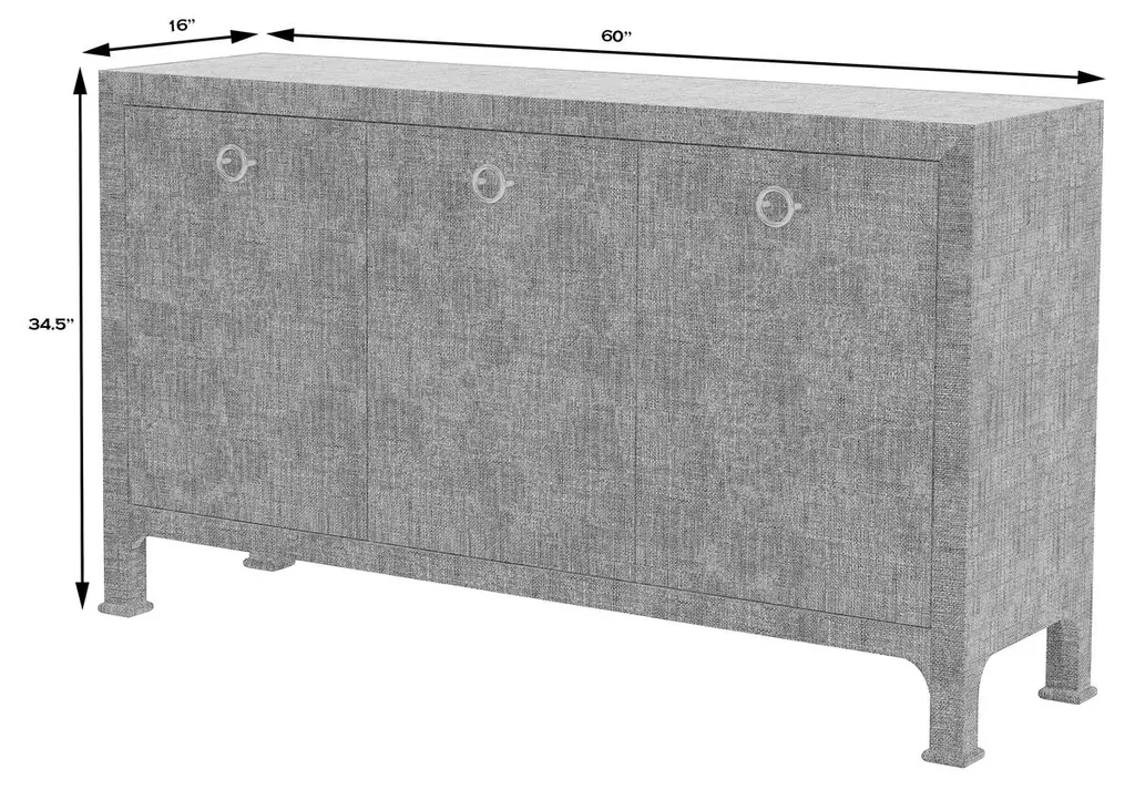 Designed by us and available only at One Kings Lane: Covered in woven raffia, this three-door sideboard provides both organic elegance and ample storage. The brass finish of the door pulls adds just the right touch of glimmer.