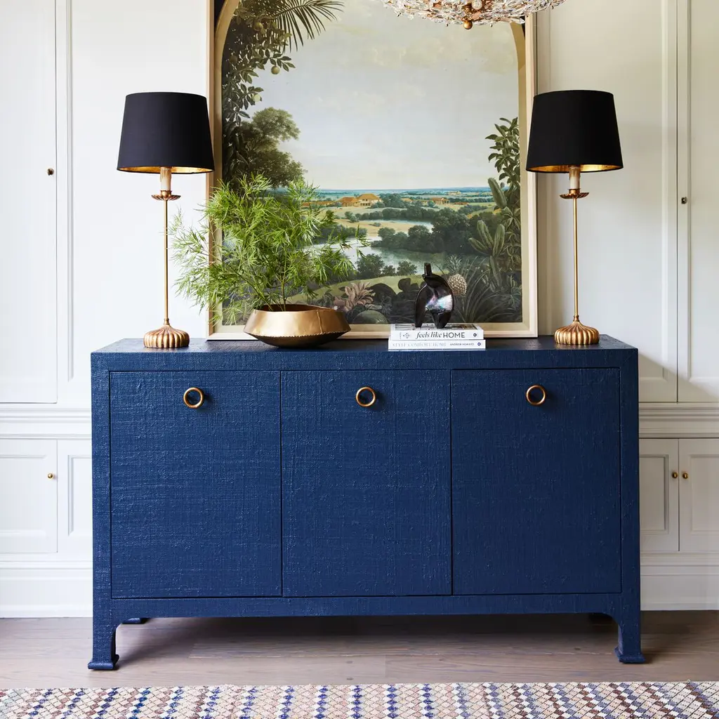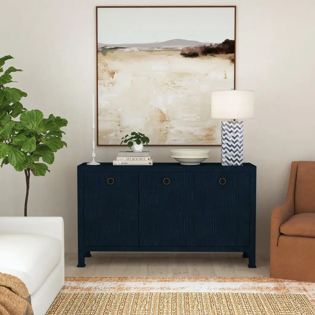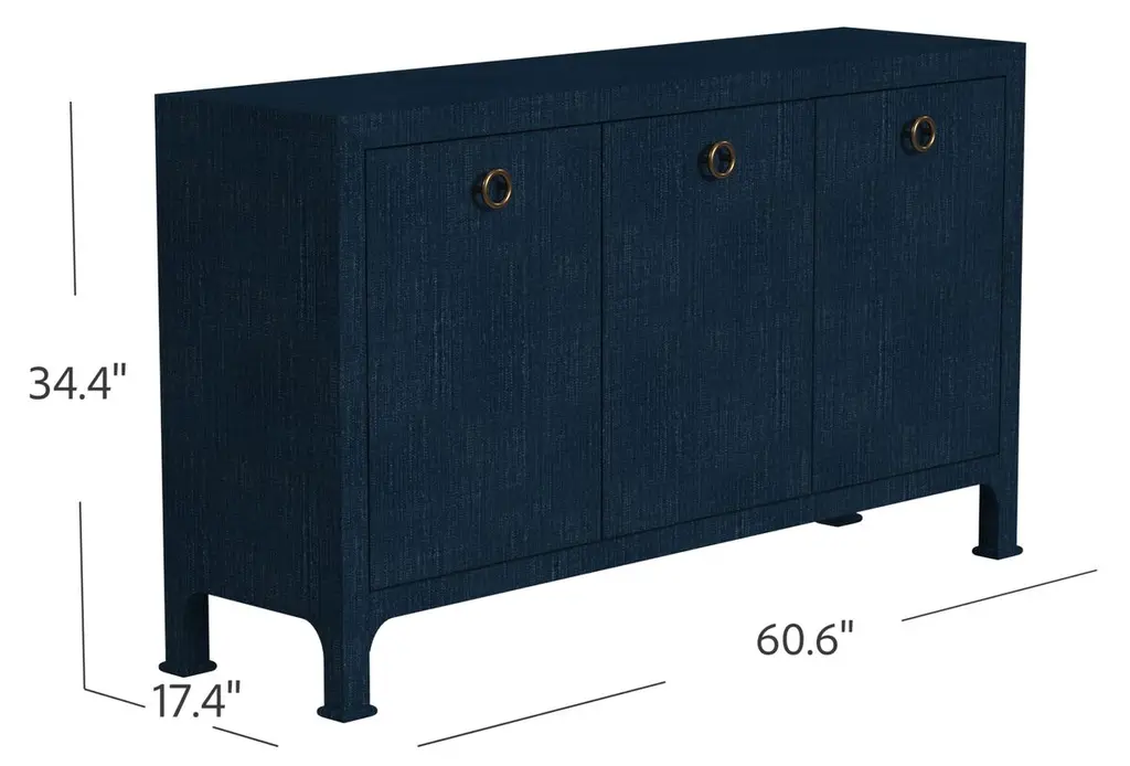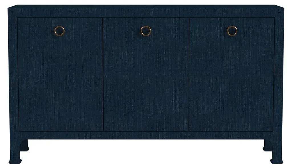 Designed by us and available only at One Kings Lane: Covered in woven raffia, this three-door sideboard provides both organic elegance and ample storage. The brass finish of the door pulls adds just the right touch of glimmer.