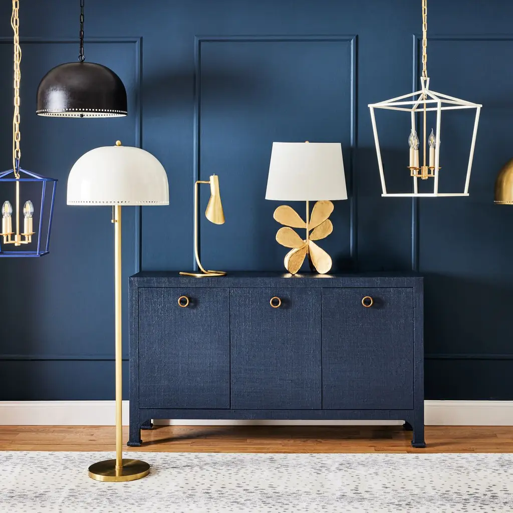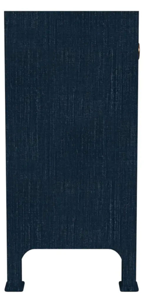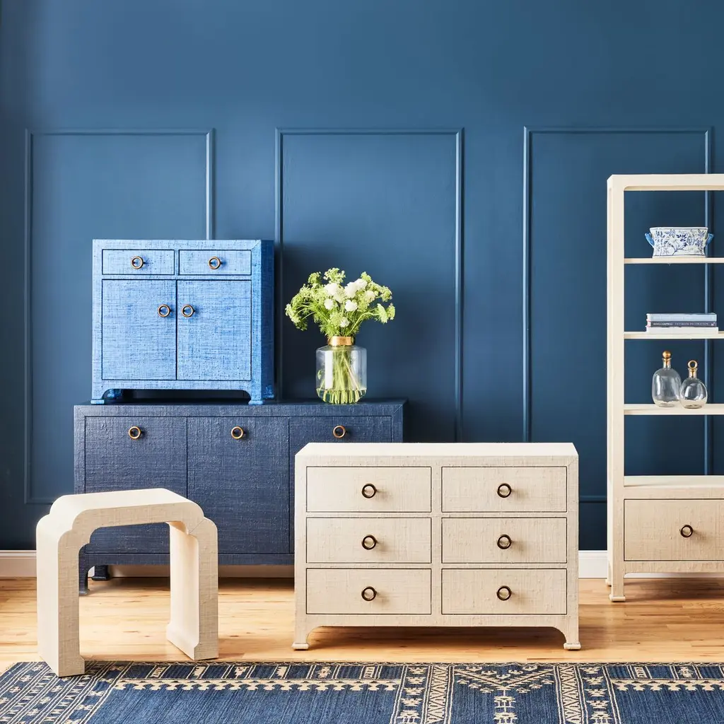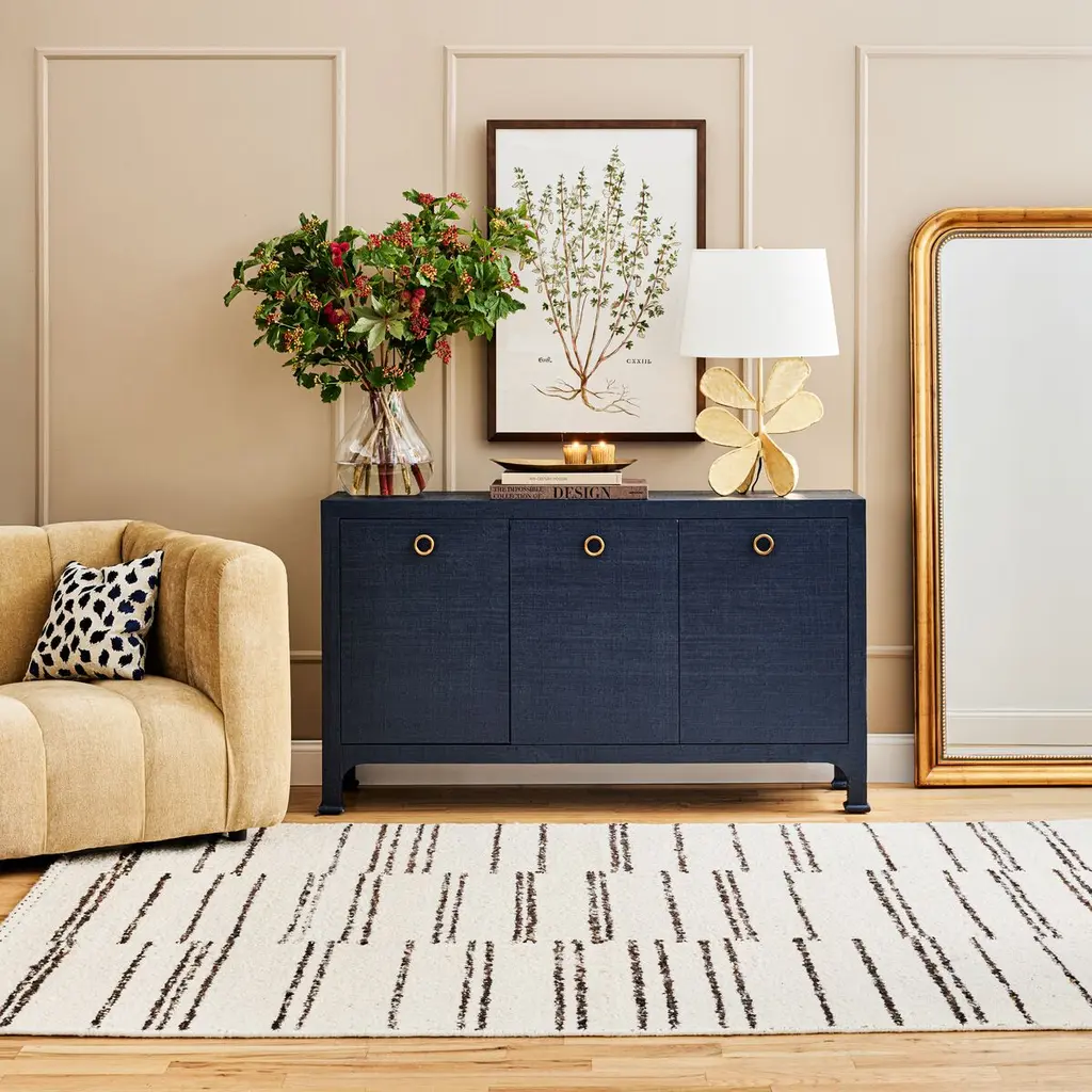 Designed by us and available only at One Kings Lane: Covered in woven raffia, this three-door sideboard provides both organic elegance and ample storage. The brass finish of the door pulls adds just the right touch of glimmer.