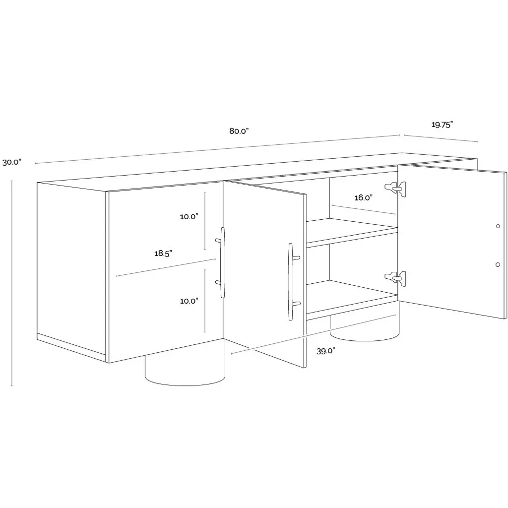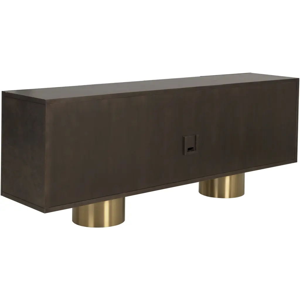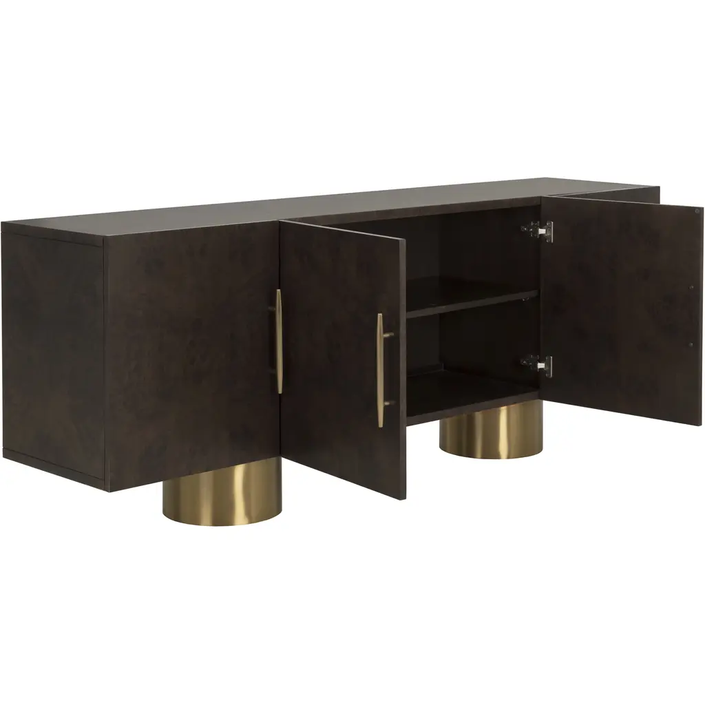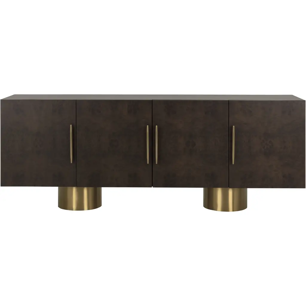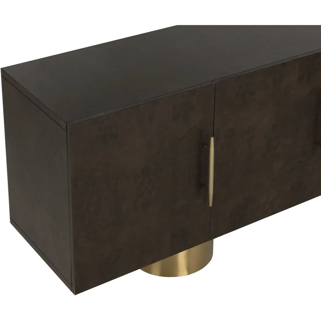 With rich brown hues and gold stainless steel accents, the Kresteven Sideboard imbues any space with an air of understated luxury. The intricate swirling patterns and distinct mottled shading of maple burl veneer emphasize quality craftsmanship and modern design.