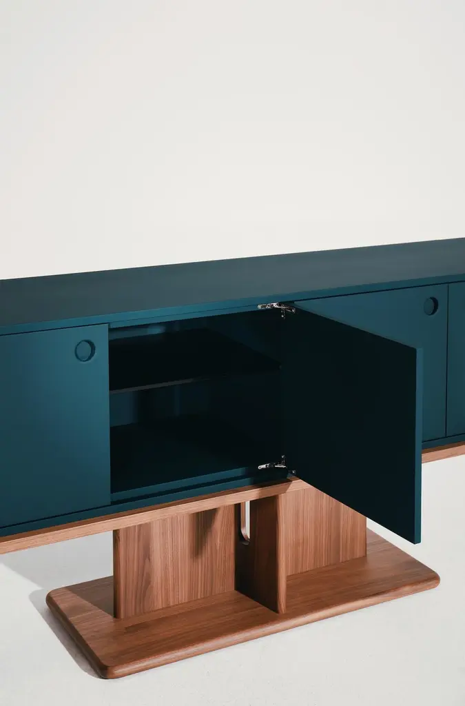 For La Manufacture, Neri&Hu have designed a range of sideboards within their ‘Intersection ’collection celebrating monastery life. The use of natural or stained wood panels for the horizontal and vertical elements, and the pedestal leg give this range of sideboards a simple, yet sculptural and monolithic look. For La Manufacture, Neri&Hu have designed a range of sideboards within their ‘Intersection ’collectioncelebrating monastery life.The use of natural or stained wood panels for the horizontal and vertical elements, and the pedestal leg give this range of sideboards a simple, yet sculptural and monolithic look. Somewhere between a piece of furniture and an altar, this design displays simplicity expressed through clean and uncluttered lines, evoking traditional and religious furniture that favours function over ornamentation.This high quality walnut sideboard comes in different sizes, and is available in a variety of finishes: natural, stained plum, off white or dark green. Despite its simple and austere look, this collection designed and developed during the pandemic radiates a certain sense of tranquillity and serenity. It is an invitation to focus on what truly matters, on building sincere relationships.Size: W2018 x D499 x H854 W 79" 1/2 x D19" 5/8 xH33" 5/8.