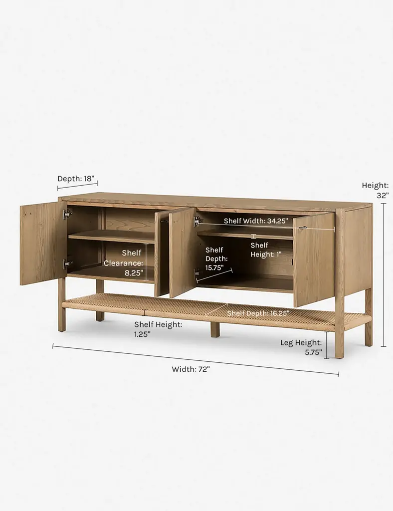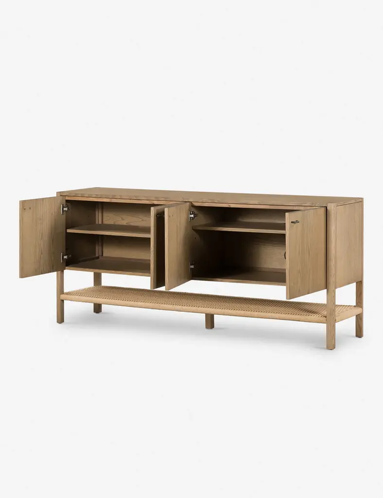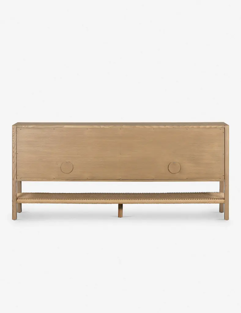 A clean-cut, ash wood design brings Danish-inspired warmth to this Laird sideboard. Iron arch pulls complete the look, while a woven cord shelf offers the perfect textural touch. This sideboard cabinet provides a spacious interior for everyday essentials, plus the open lower shelving is ready for easy storage and display.