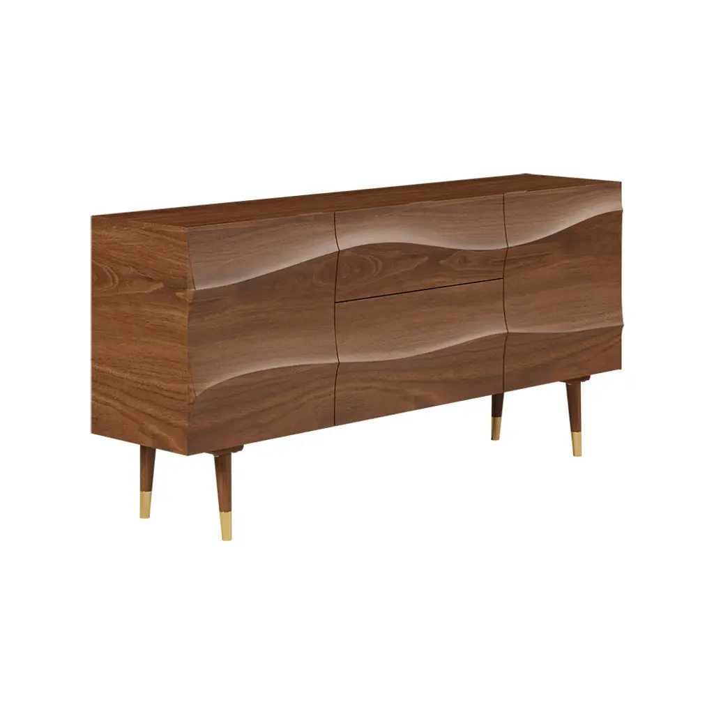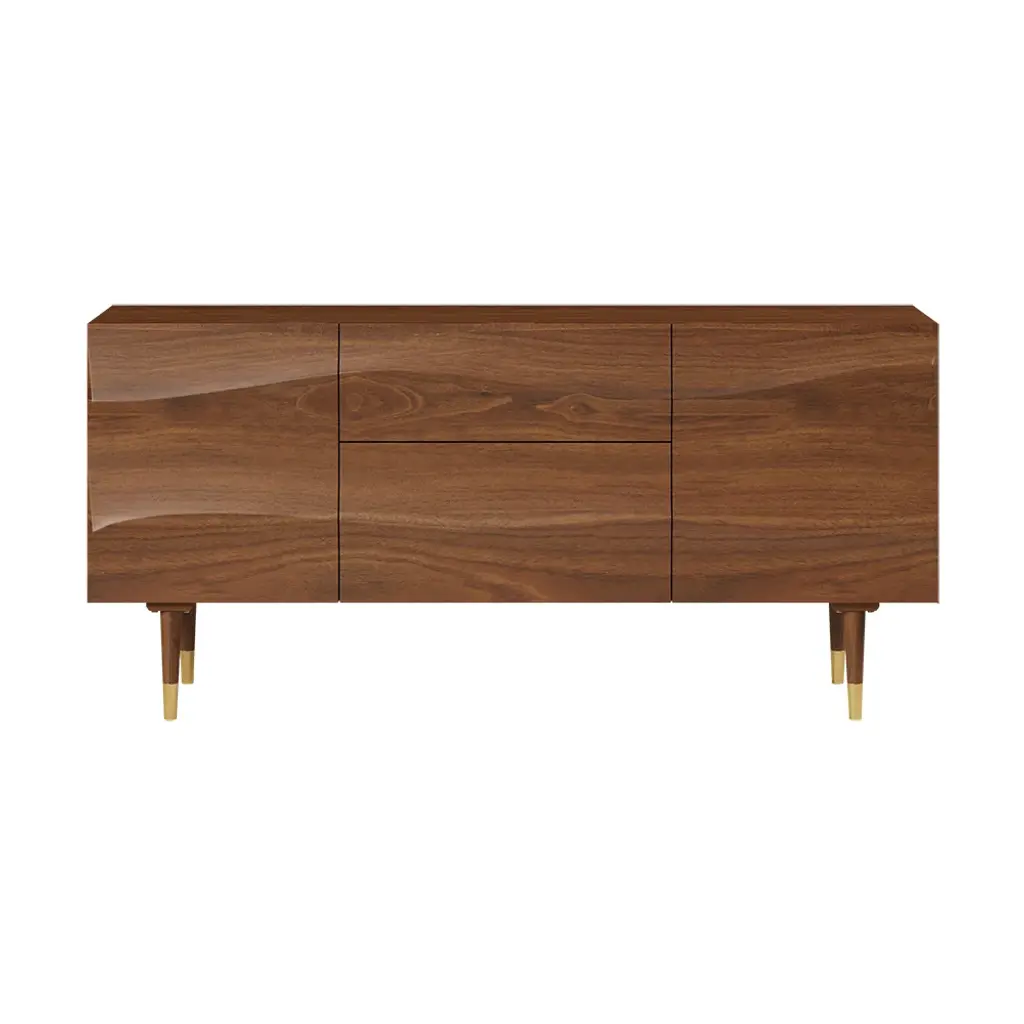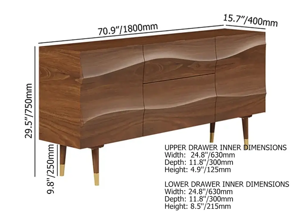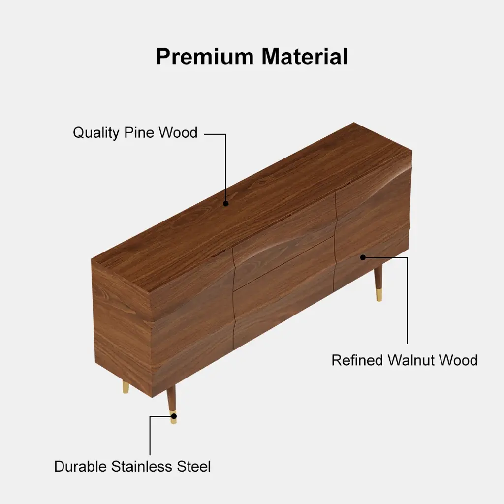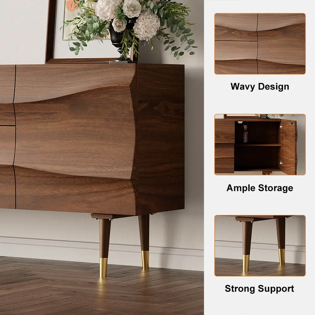 Bring effortlessly mid-century modern grace and simple utility to any entertainment space with this essential sideboard. Accented by wave-like flow doors atop sleek tapered legs, adding a subtle mid-century feel. With 2 doors and 2 drawers that can be used to keep necessary items like linens, plates or table mats, crockery, and other dining essentials. It has a large surface to display framed photographs, creative accents, and more. Boasting refined solid wood and durable stainless steel, this sideboard buffet ensures long-lasting service.