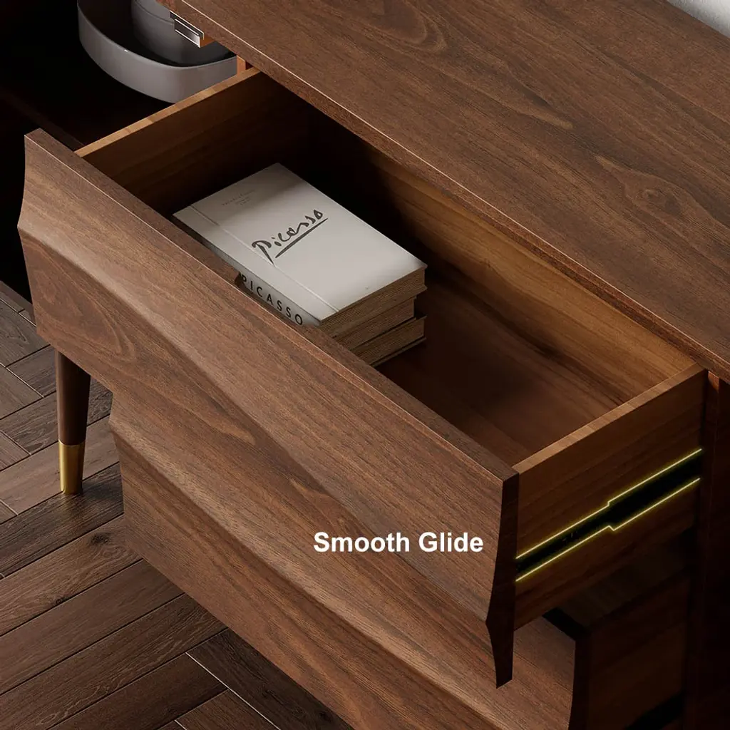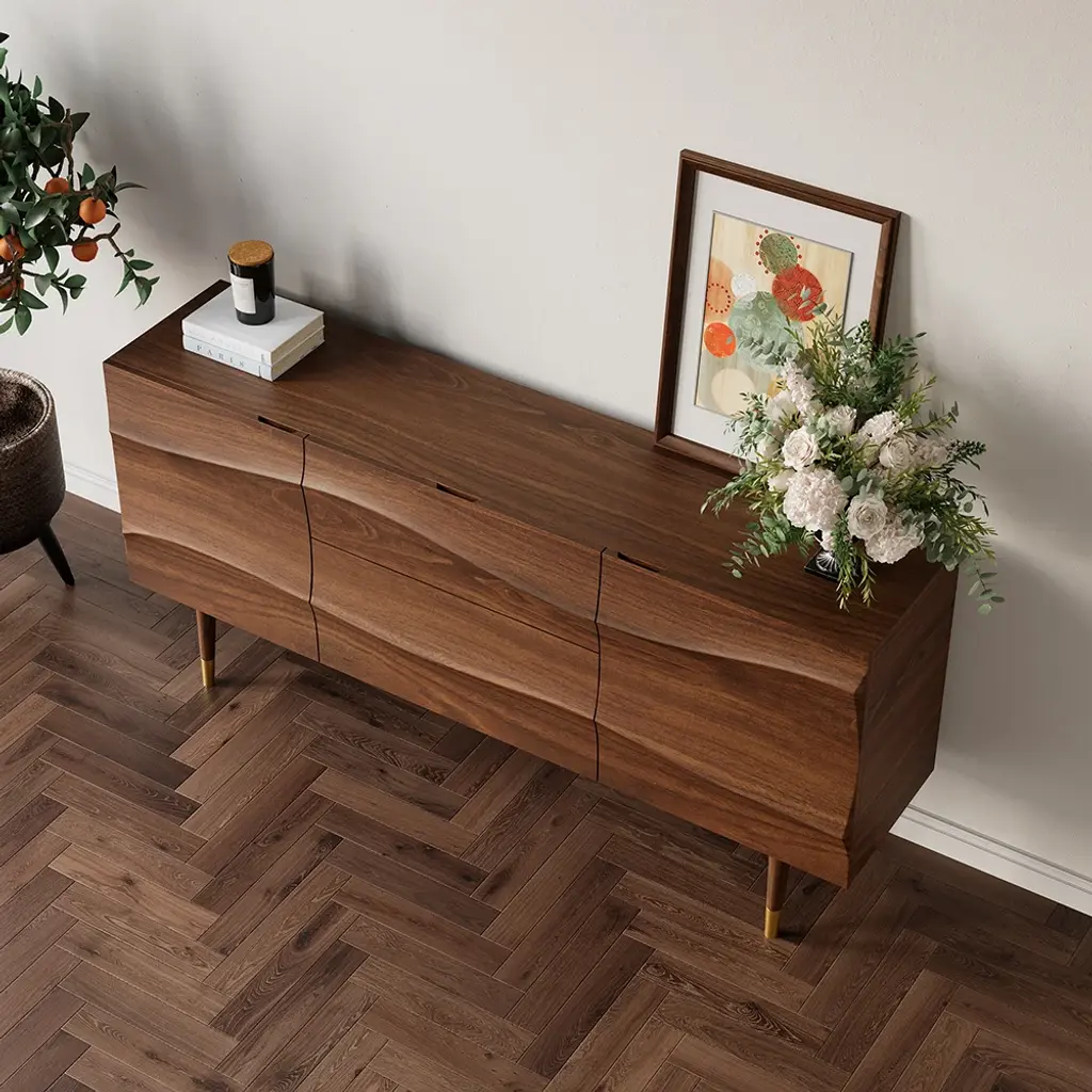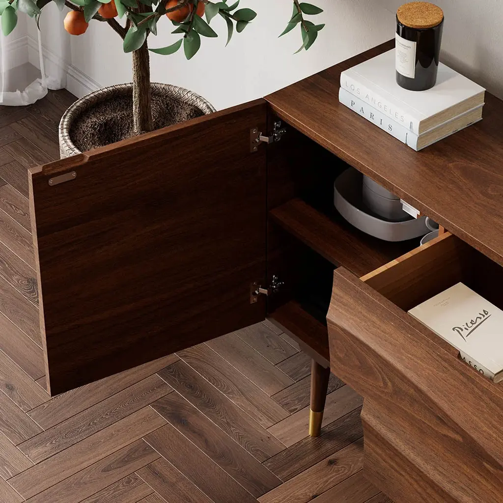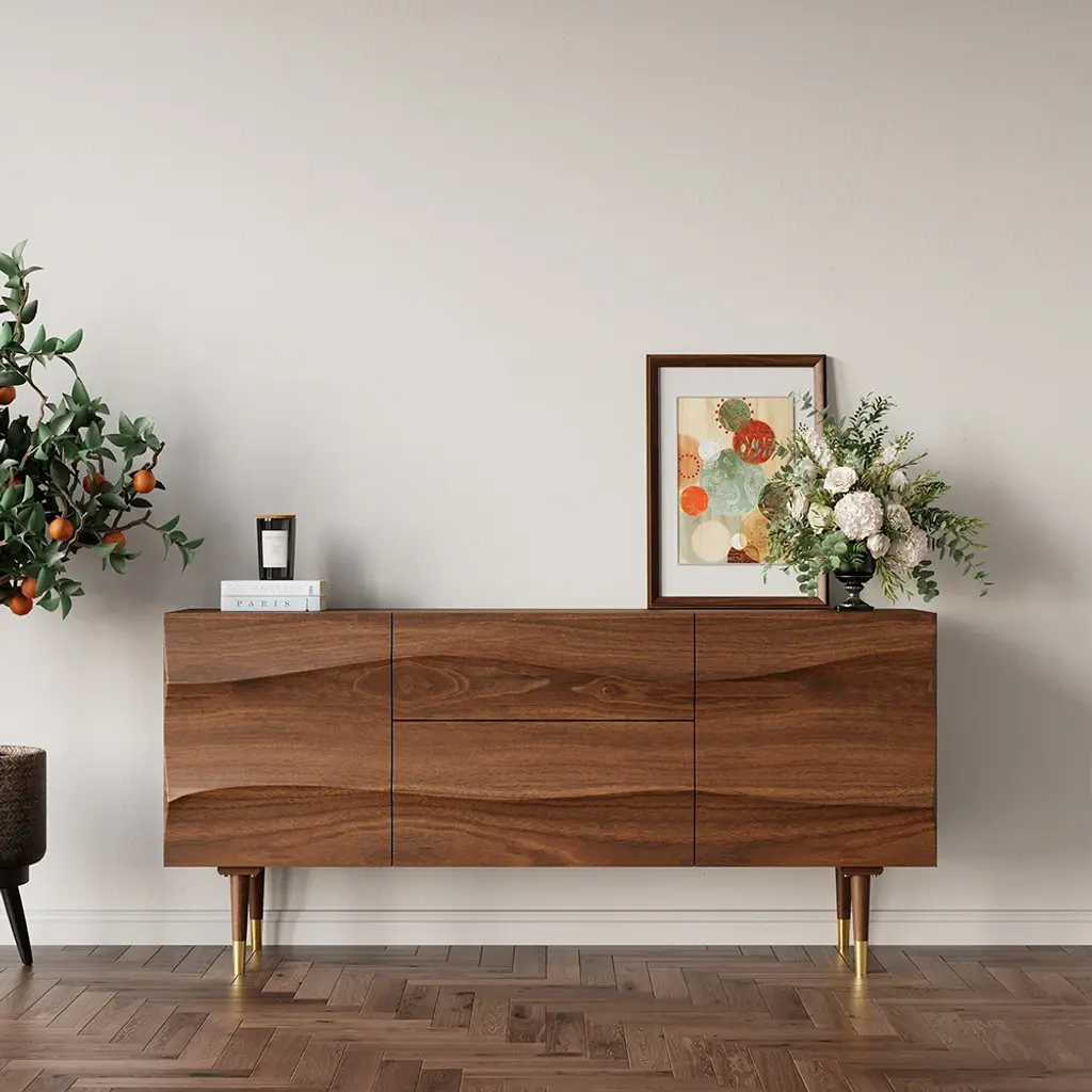 Bring effortlessly mid-century modern grace and simple utility to any entertainment space with this essential sideboard. Accented by wave-like flow doors atop sleek tapered legs, adding a subtle mid-century feel. With 2 doors and 2 drawers that can be used to keep necessary items like linens, plates or table mats, crockery, and other dining essentials. It has a large surface to display framed photographs, creative accents, and more. Boasting refined solid wood and durable stainless steel, this sideboard buffet ensures long-lasting service.