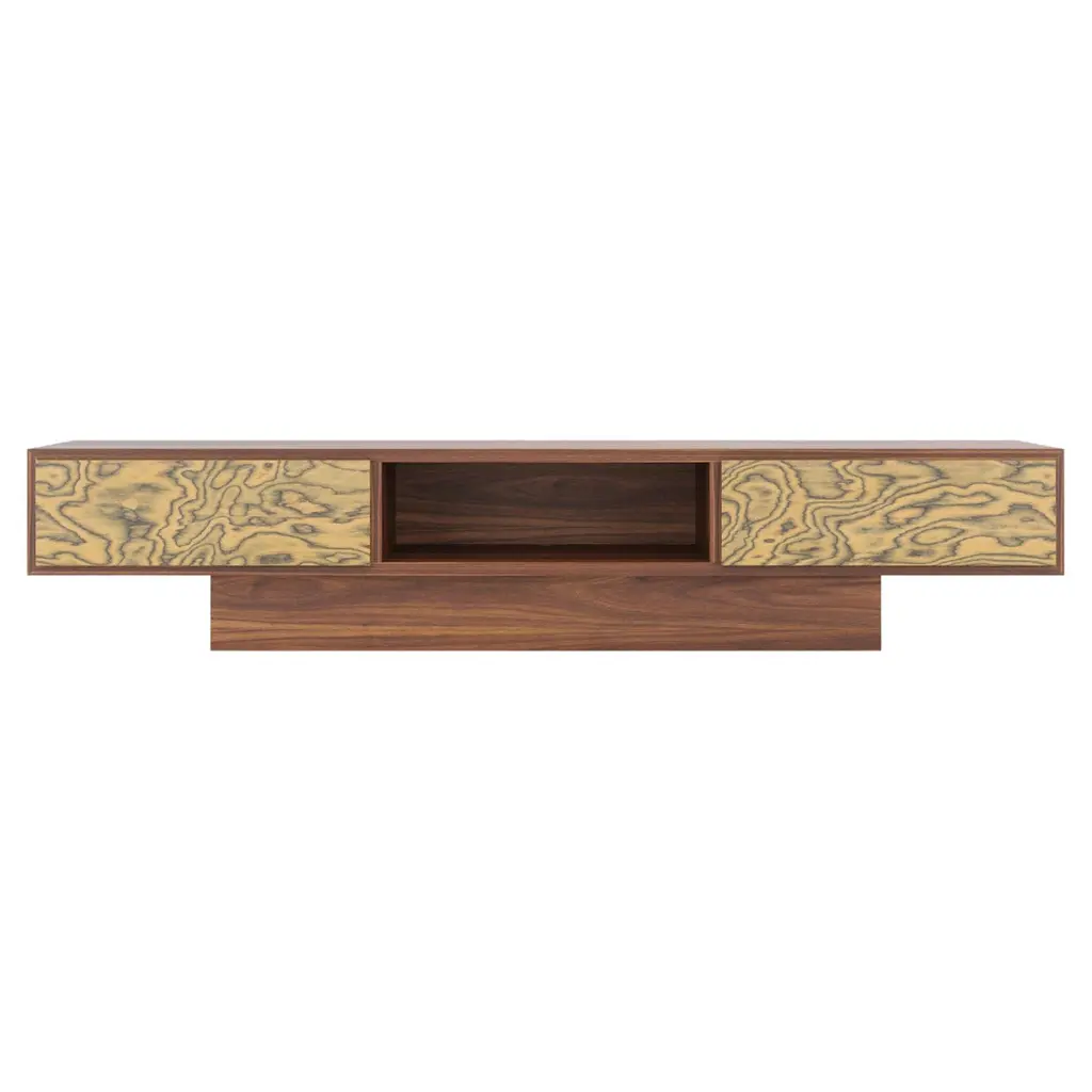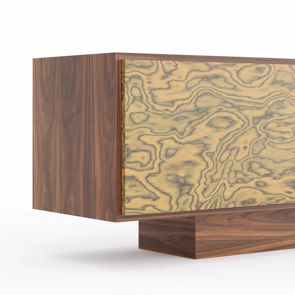 Walnut sideboard with three doors overlaid with Ettore Sottsass veneer in Mid Century Modern style.Perfect as a sideboard, buffet, TV stand, record player and vinyl storage for music enthusiasts. This long sideboard offering spacious storage and is ideal for dining room, bedroom or living room. One adjustable shelf behind each door. High quality sideboard made of wood covered with natural American walnut veneer and ALPI Ettore Sottsass veneer.Handmade in Poland.Dimensions:width: 150 cm or 180 cm or 200 cm or 220cm or 240cmdepth: 47 cmtotal height: 60 cmbase height: 14cmMaterial used:structure, base, shelves: blockboard overlaid with natural American walnut veneerdoors: blockboard overlaid with ALPI Ettore Sottsass veneer. Push to open.Wood finishing: high quality matte varnish.Made to order. Lead time: 9-10 weeksYou can change the size, material, surface treatment after prior contact and setting prices.