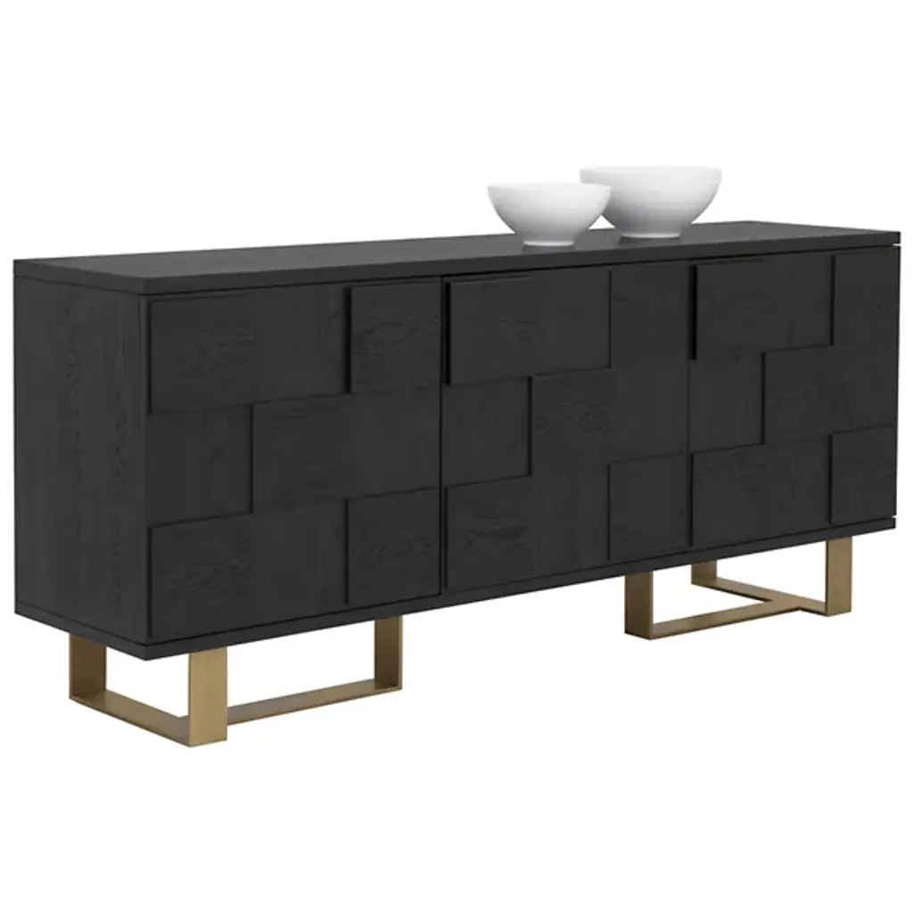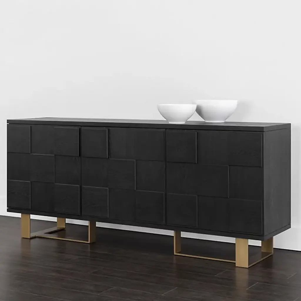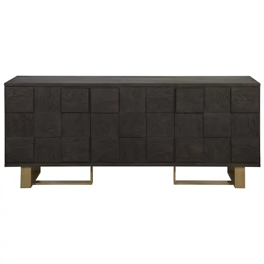 The Lars Sideboard from Sunpan brings bold design and natural warmth to any dining or living space. Made from smoked acacia wood, its three-dimensional checkered cabinet doors create a memorable visual texture, while the antique brass-finished iron frame adds an industrial edge. It features three spacious doors to the interior and ample storage with style. Natural variations in wood grain, knots, and texture make each piece unique, resulting in a versatile and inspired addition to rustic modern or contemporary interiors.
