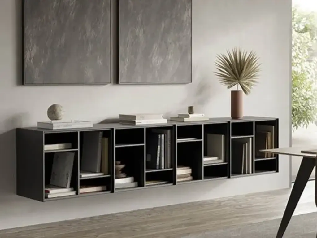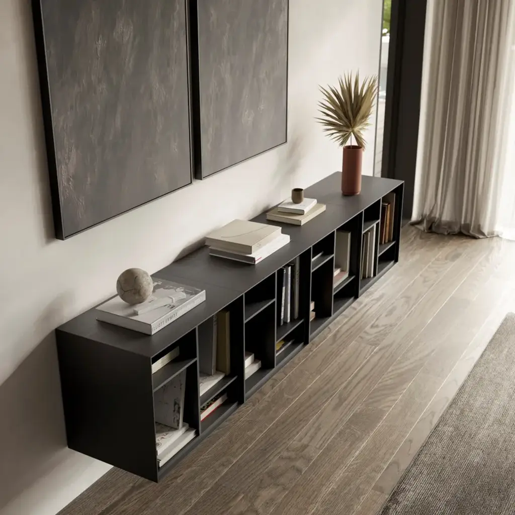 Wall-Mounted Composition in Kai Black WoodIn the photo:4 open compartments 64 x 54 x 37 cm– Casing: Kai Black– Back panel: Kai Black– Shelf: Kai BlackFor additional finishes and color combinations, please contact our customer service center.The aesthetic subtlety of this collection draws you to it and invites you to touch and contemplate it. A thin half-centimetre frame envelopes the entire piece, outlining the push-to-open drawers that lend a touch of imagination and resolution to a design that is easy to admire yet difficult to materalise. The Lauki collection is made up of multiple boxes that can be arranged on the floor, piled on top of one another or hung from the wall. Moreover, these boxes are available in a wide range of different measurements, finishes and functions (drawers, doors, open modules, etc.), thus enabling you to create an endless variety of configurations to suit any room. For example, the same module can be used as a bedside table or an office drawer unit. With just a few different modules, you can design a solution for an entrance hall or any other room in the house. And by putting a larger number of them together, you can create a TV unit, sideboard or even a filing cabinet for the office.