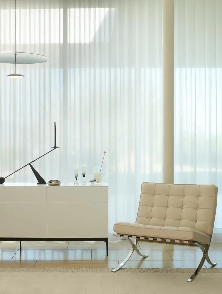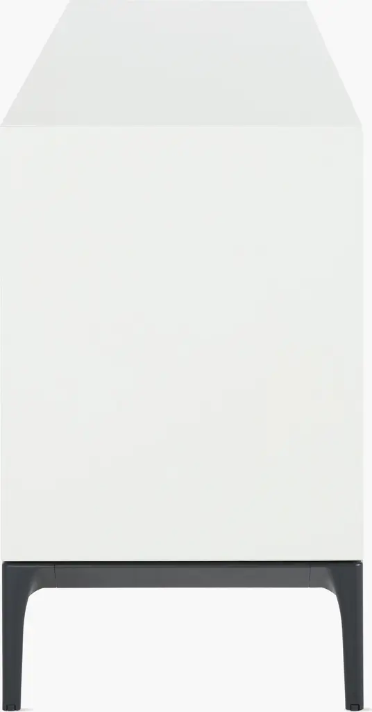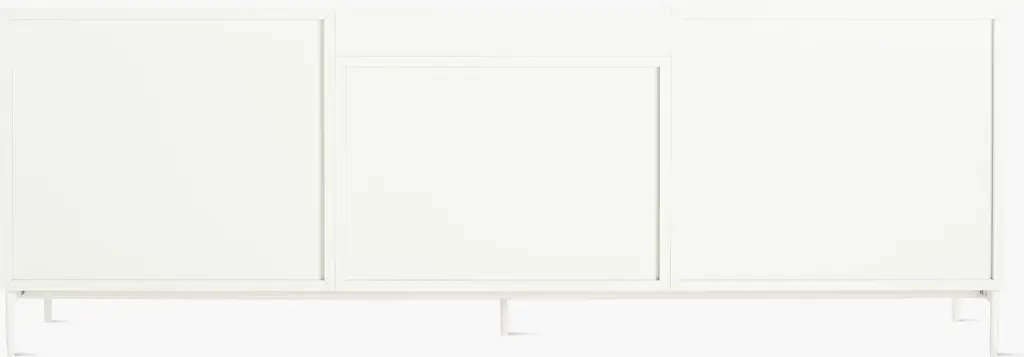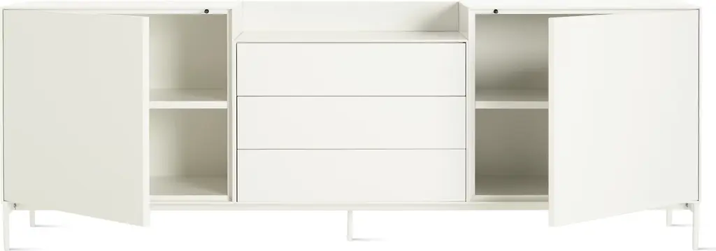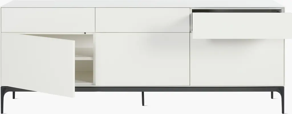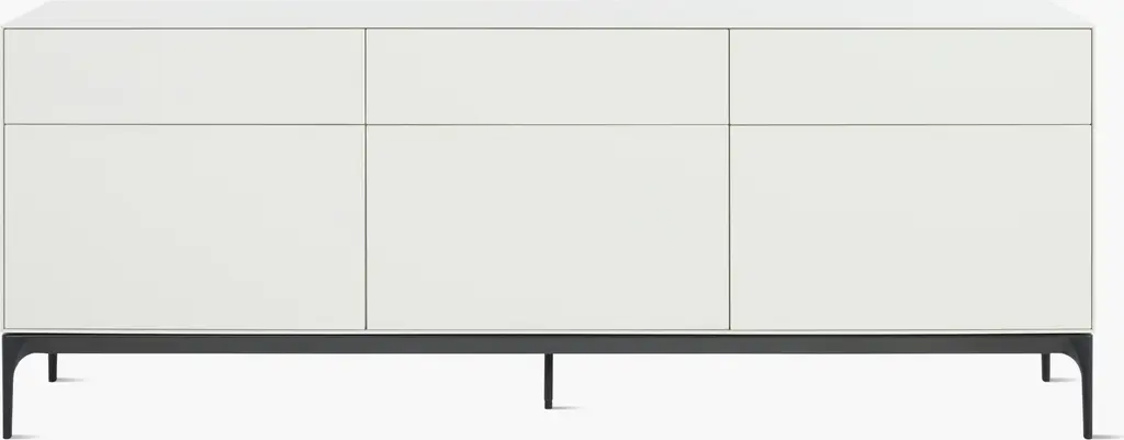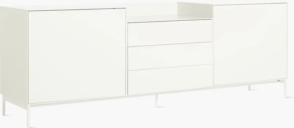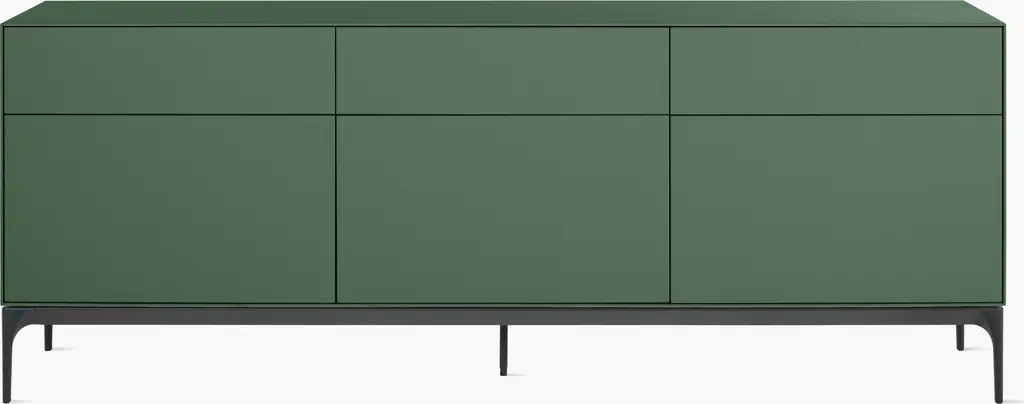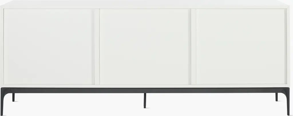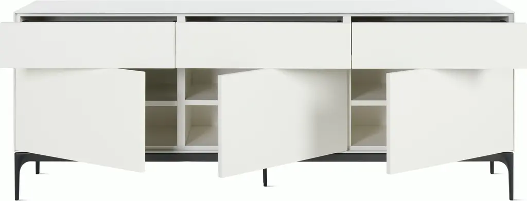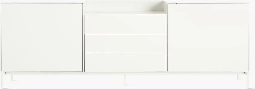 Minimal yet harmonious, the Lauki Credenza (2017) offers a sleek solution for media, dining, and workspace storage. Push-latch cabinets and drawers that allow the fronts to remain hardware-free present a streamlined look. The slender raised base lends visual lightness to the overall aesthetic. Made in Spain.