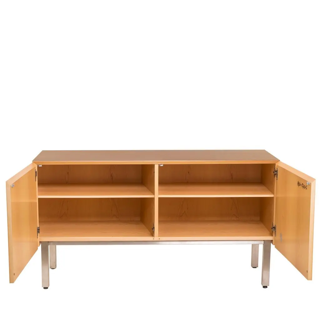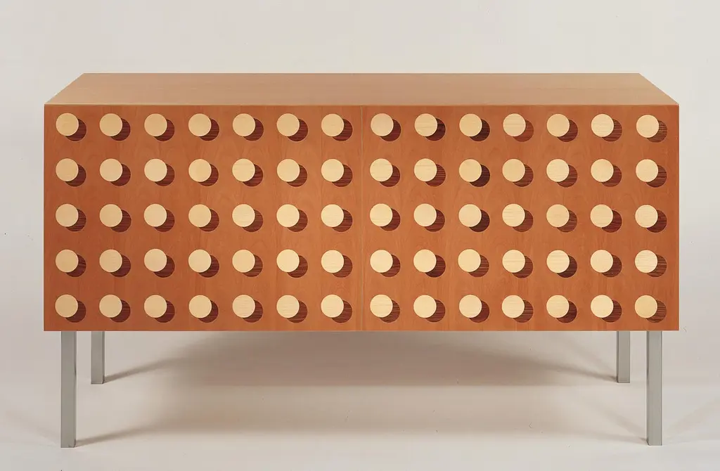 Sideboard with brushed metal legs and base, inlaid doors and matt lacquered veneered structure in maple wood. Fitted with push-pull doors and one internal shelf, it is also available in the hanging version.FINISH:Limited Edition Art InlayThis project presents an ordered sequence of circles on a darker background. The representation of the shades of each circle, besides reproducing an effect of depth, completes the chromatic range with elegance and harmony.R.t.h.2 sideboard is produced in a Limited Edition of 33 multiples only.