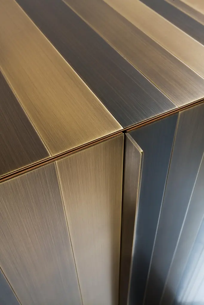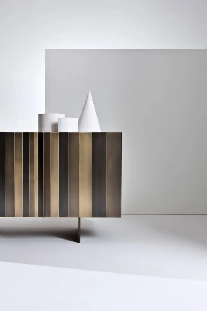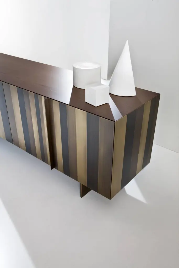 Low sideboard with 4 hinged doors and metal legs; equipped with 2 internal drawers. Side panels, doors and legs clad in burnished brass. Top and inside in walnut Colore.FINISH:Burnished brass and walnut ColoreThis low sideboard is a luxury element of design focusing the attention on the finest materials and their elegant combination. Through the use of our hand-worked Stars matelas, the essentiality of the design is enhanced by a unique and different Surface Design.CUSTOMIZATION:Available in polished steel, satin brass, burnished brass, satin copper, burnished copper and black iron Cenere. Available with top in walnut Colore or clad in metal.