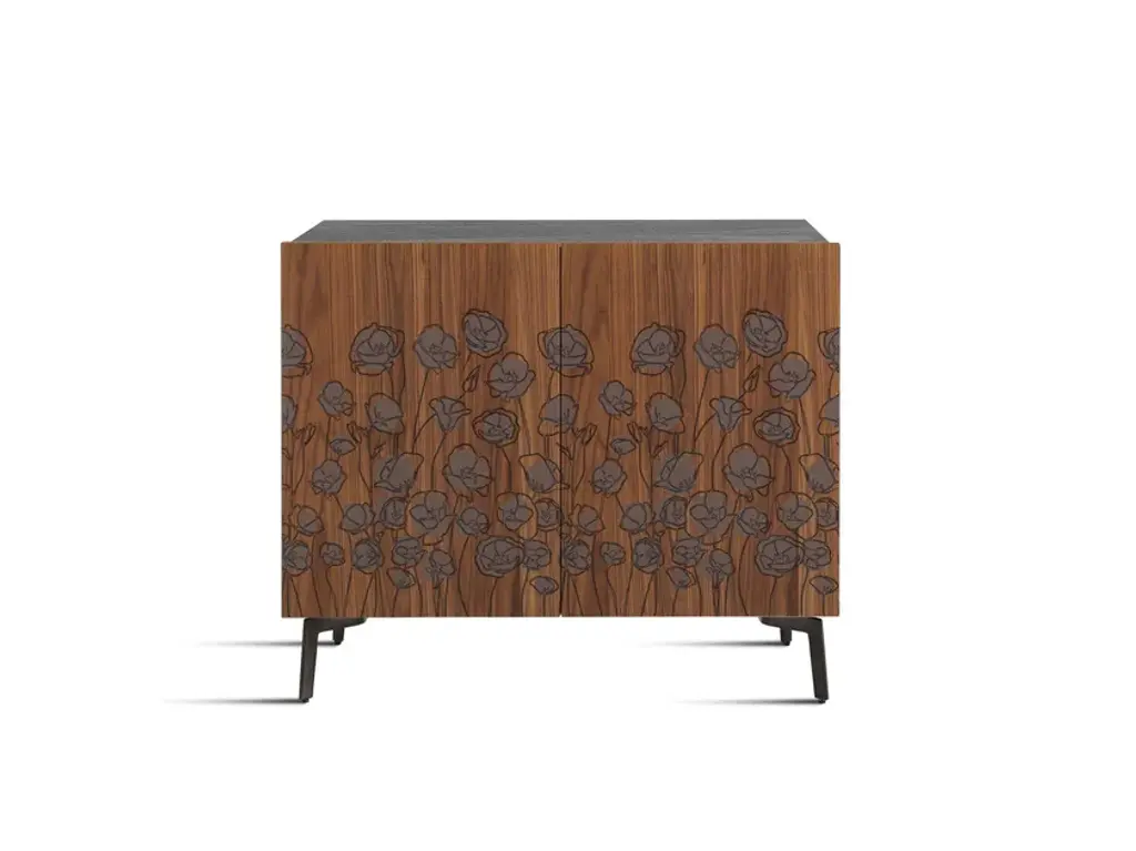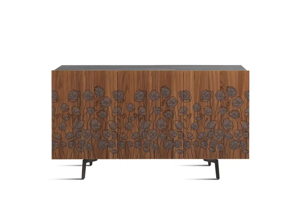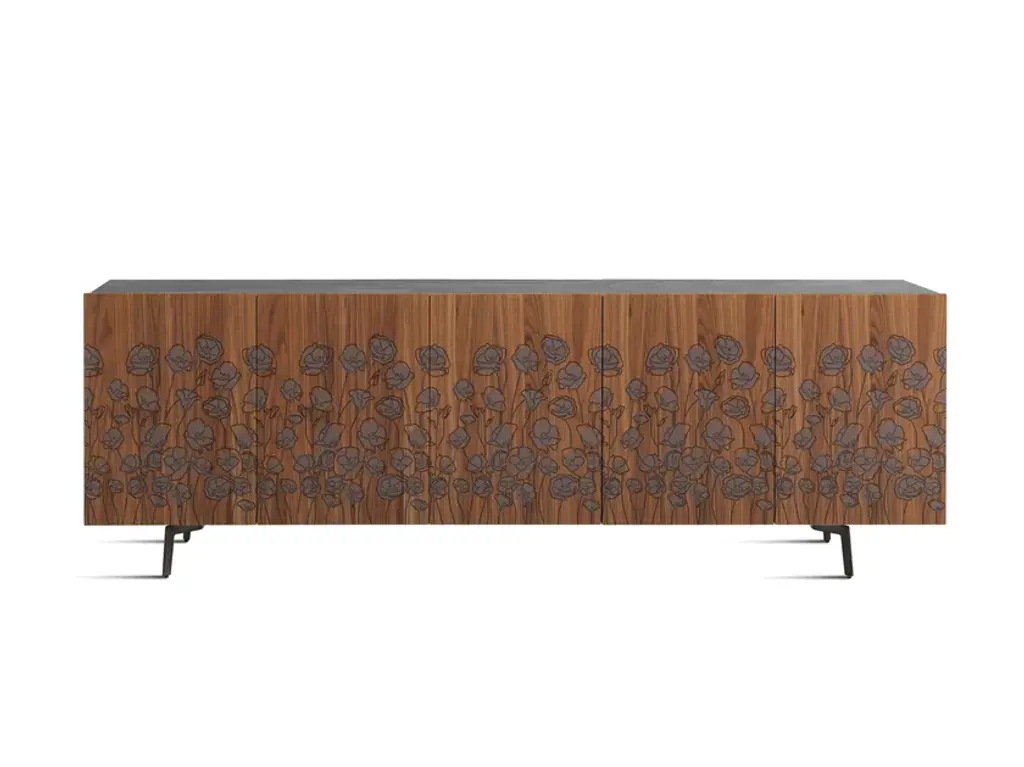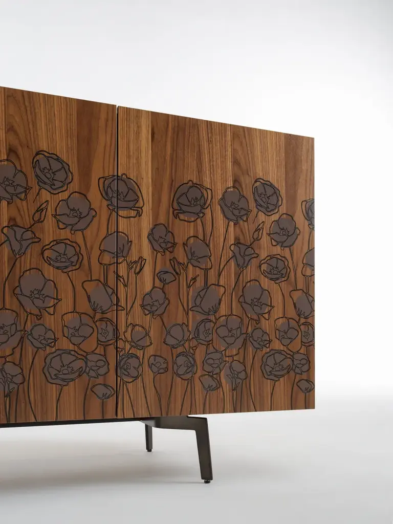 Le Jardin Mid-Century is a new sideboard. Its underlying concept draws on the simplicity and purity of a childhood memory: on his walk to school he would pause in the midst of a garden in springtime bloom. The Le Jardin cabinet body is lacquered glossy or matt in Horm colours, or is in mocha-tinted beech. The canaletto walnut doors feature silk-screen decorations.Structure made from particleboard, either veneered and stained or lacquered. Doors veneered with Canaletto walnut with screen-printed decoration. Shelves of transparent tempered glass.