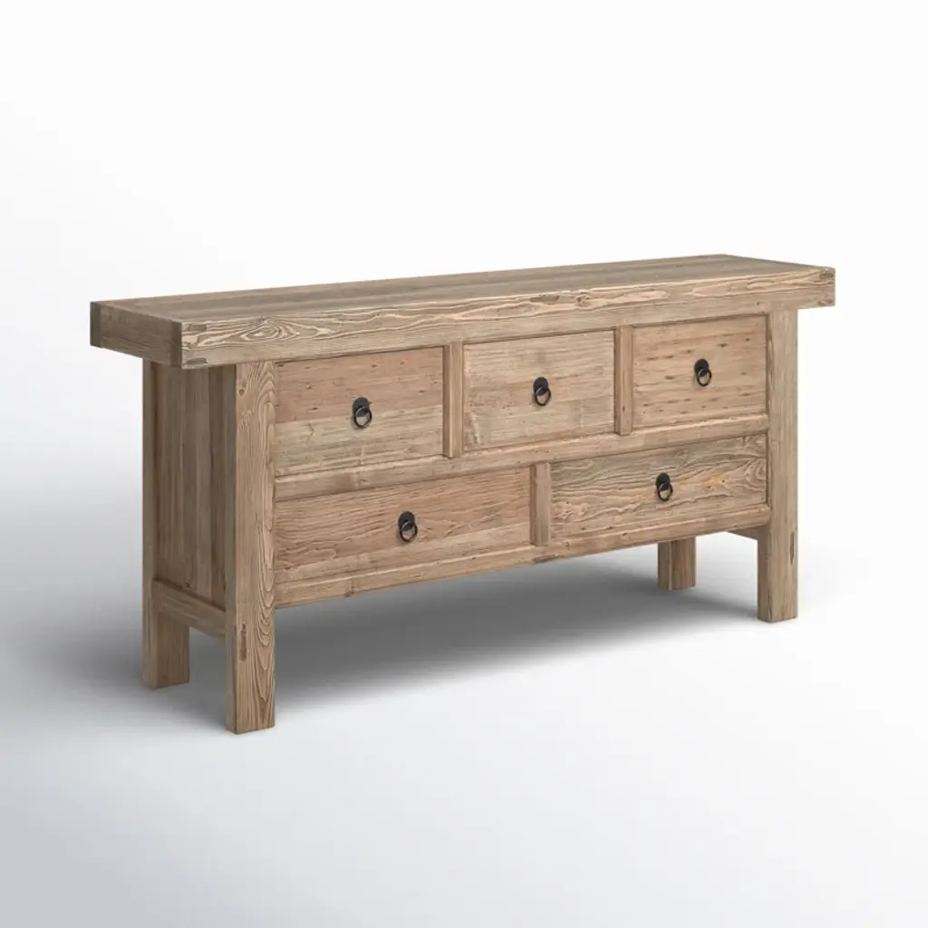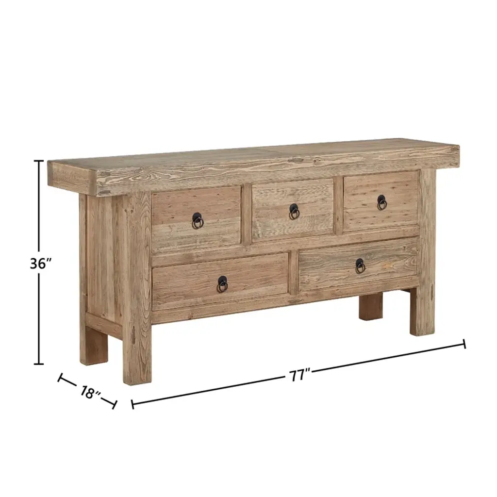In this new rendition of our best-selling buffet, we've rescaled the design to fit smaller spaces while still offering the honest, simple design of the original. Crafted from reclaimed pine, this handsome server is protected by a clear coat finish that shows off the gorgeous natural wood grain of the material beneath. Accented with ring pull hardware in a simple black metal, the spacious drawers offer generous storage space for whatever your needs are, while the shallow depth makes this a perfect solution for making any room feel spacious.