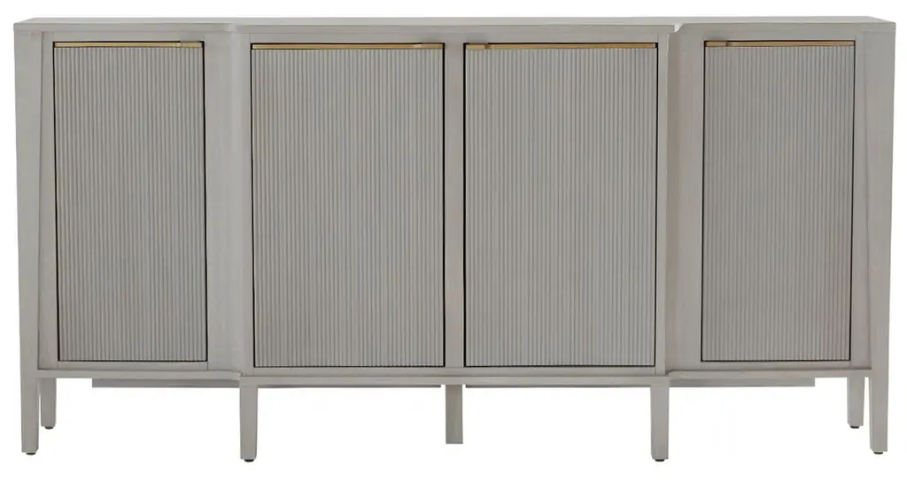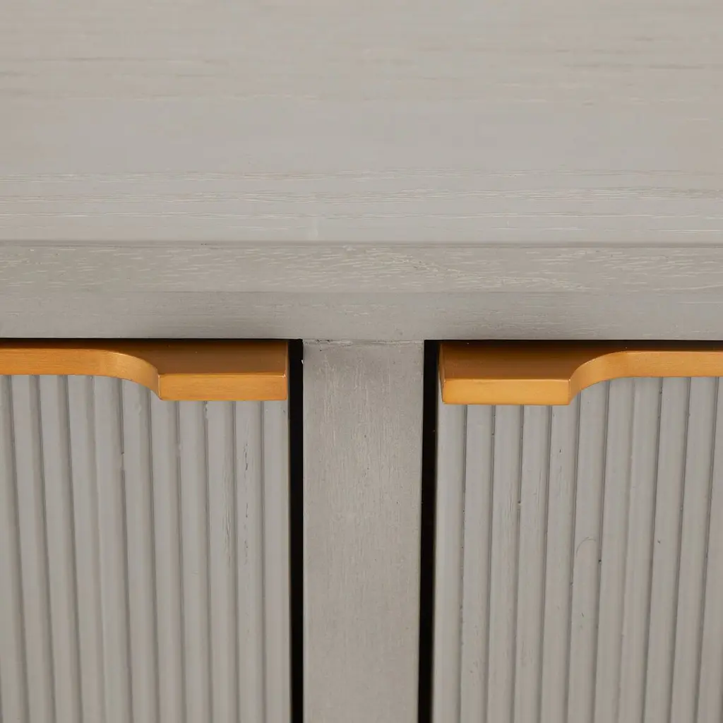The slim Leary Sideboard is a popular design that is perfectly sized for entryways and narrow spaces, offering stylish storage solutions. Its clean design is enhanced by ribbed door fronts with accents, creating a sophisticated and modern look. With ample storage space and a sleek profile, this sideboard is both functional and visually appealing, making it a great addition to any home.