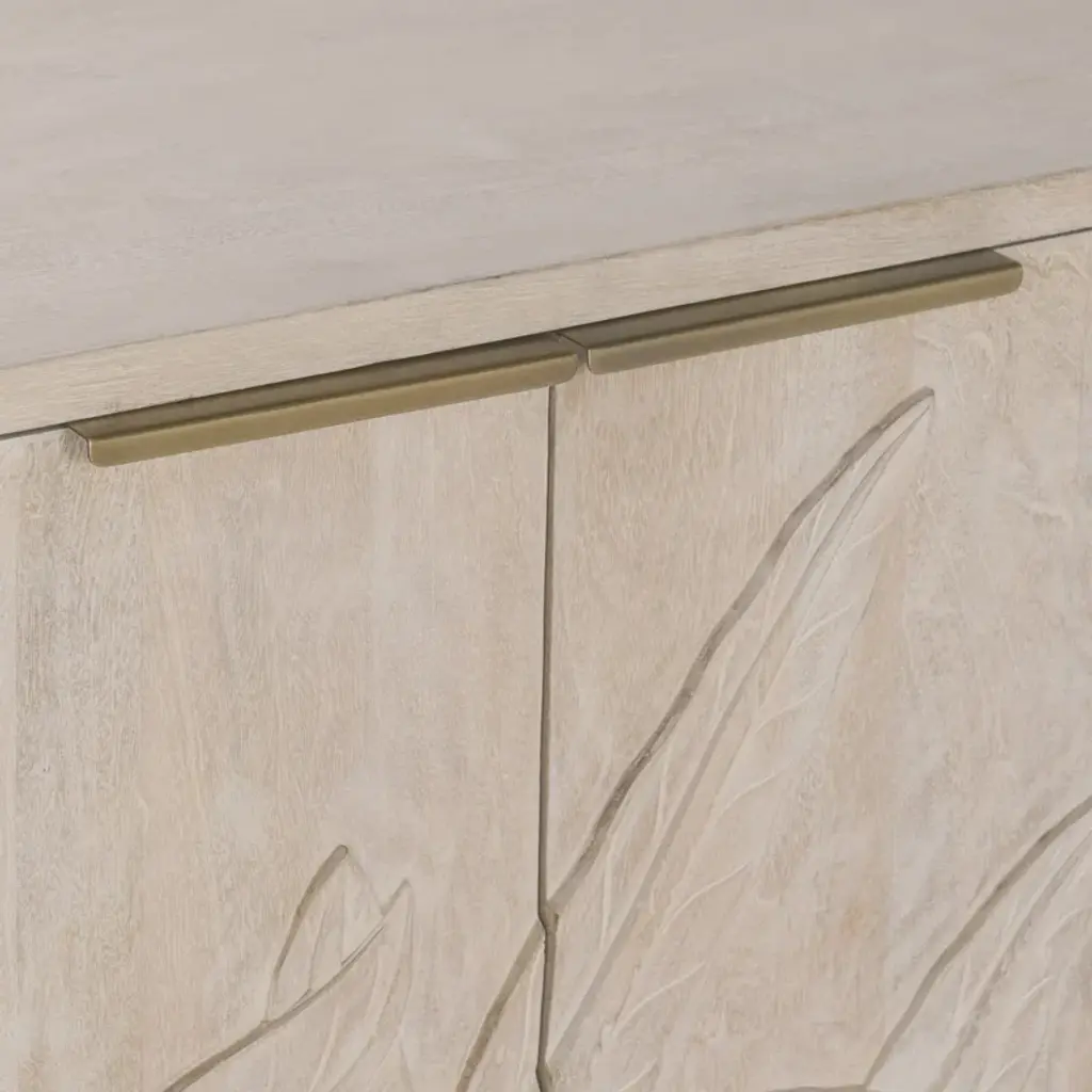 Hand-carved with a graceful foliage motif, this buffet breathes fresh style into any dining or living space, grounding the look with organic warmth and charm. Four doors open to provide versatile storage space, complete with adjustable and removable shelves. Solid mango wood offers added visual appeal with lively grain patterns and color variation.