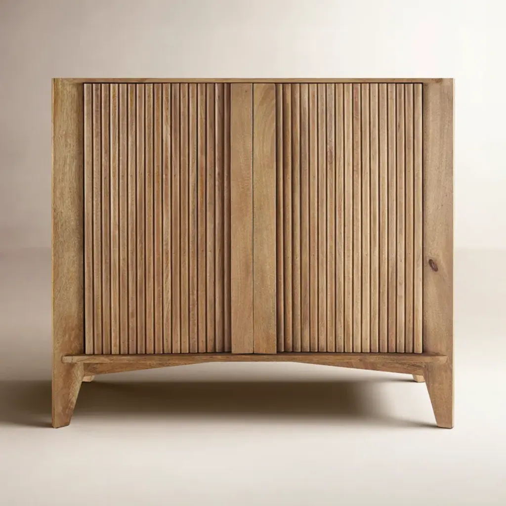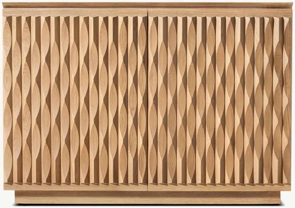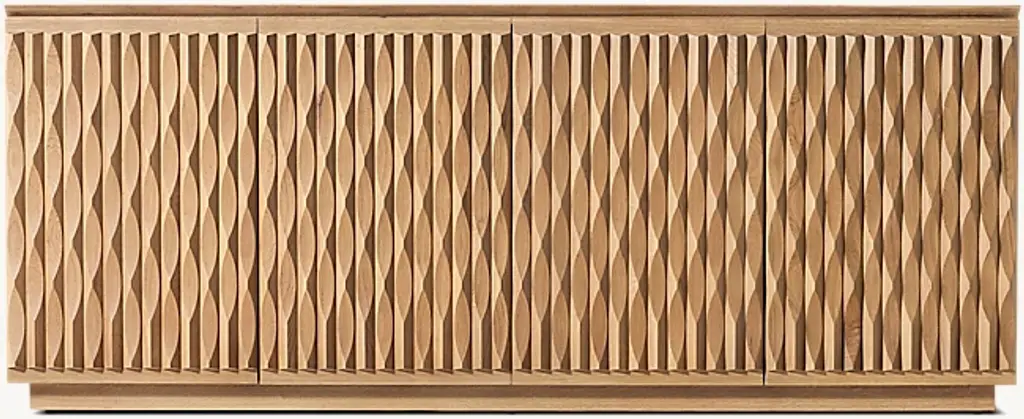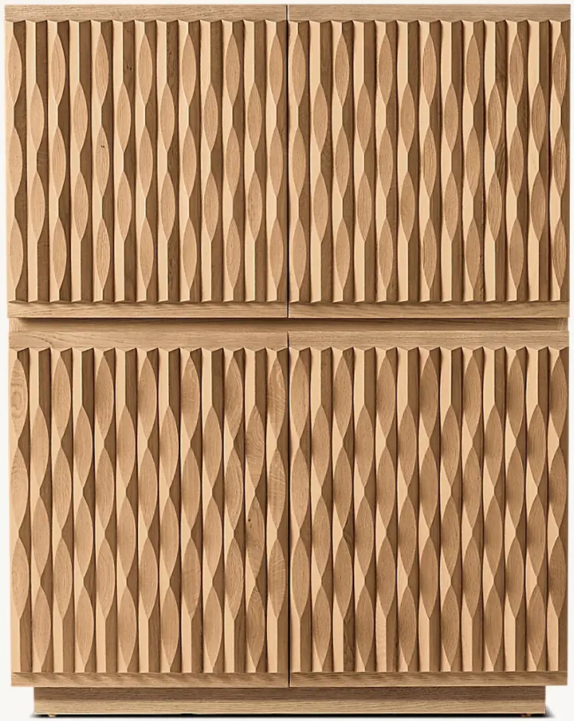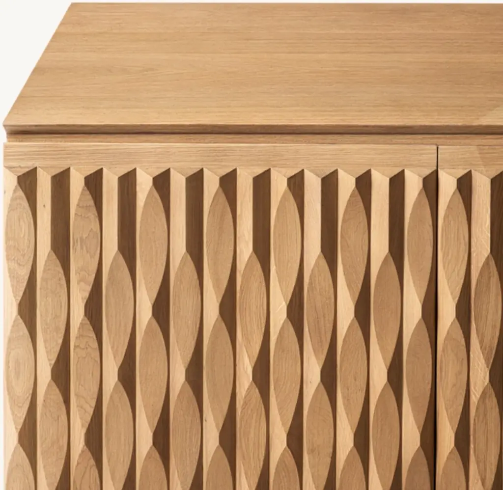 Artisan-crafted of American white oak, Lemaire's minimalist, midcentury silhouette plays counterpoint to a richly decorative façade. Carved with undulating vertical strips that crest and dip for a fluid feel, the dimensional design appears to float on its recessed plinth base.SHOP THE ENTIRE COLLECTION