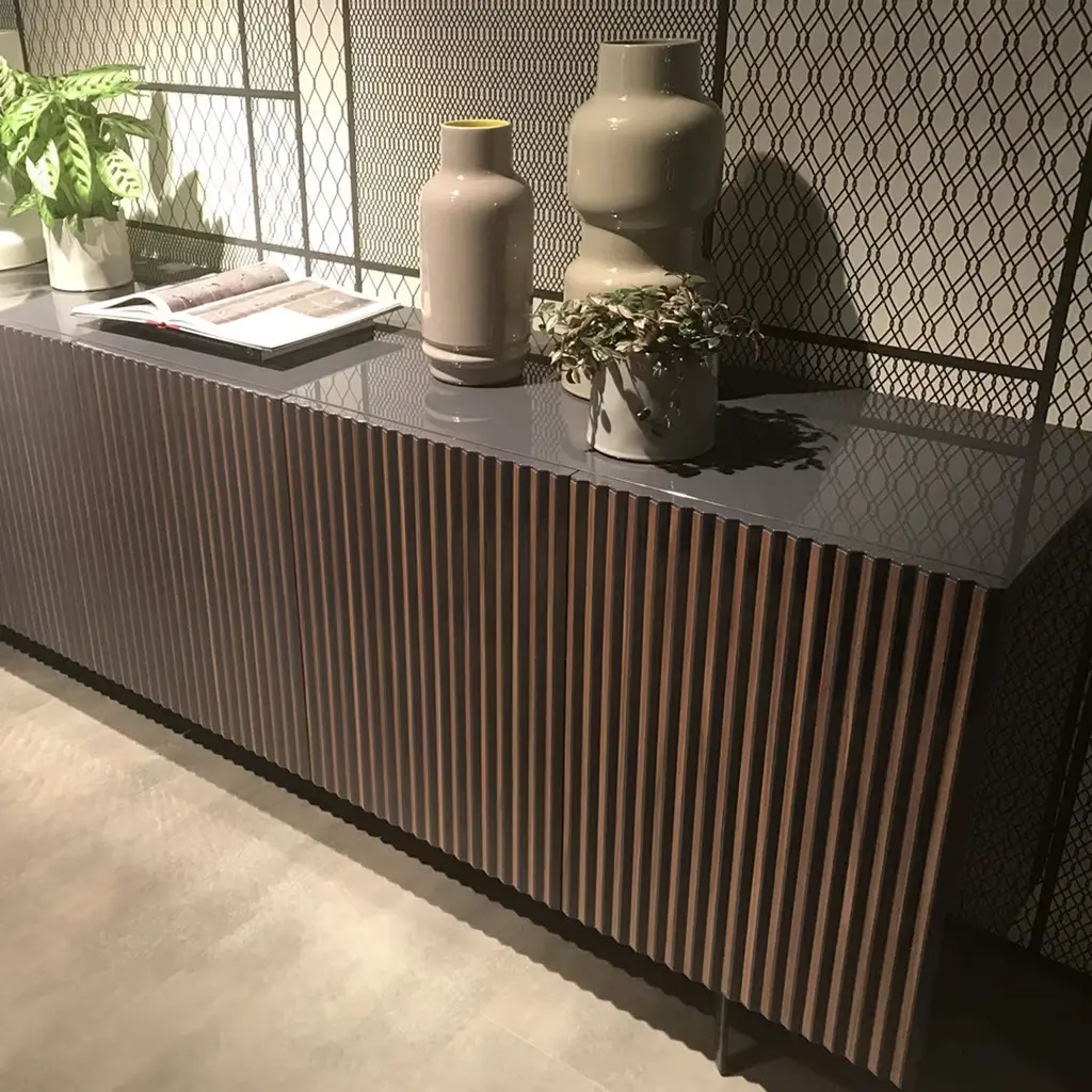 A capacious and elegant sideboard, this piece features five doors and spectacular allure. An exercise in contrasts, the black-lacquered wooden frame is sleek and essential, enriched with Canaletto walnut wood vertical inserts on the front panels. Infusing an interior with mesmerizing sophistication, the exquisite design on the door creates an optical effect when seen from different angles. The four angled legs are made of black powder-coated iron.