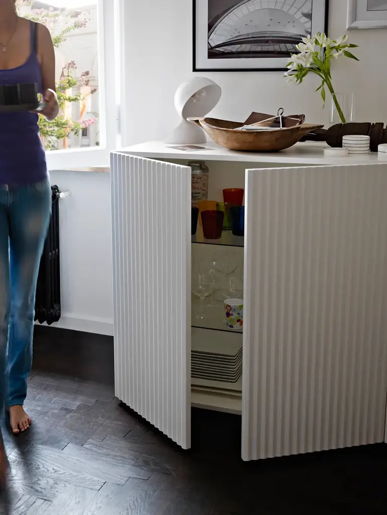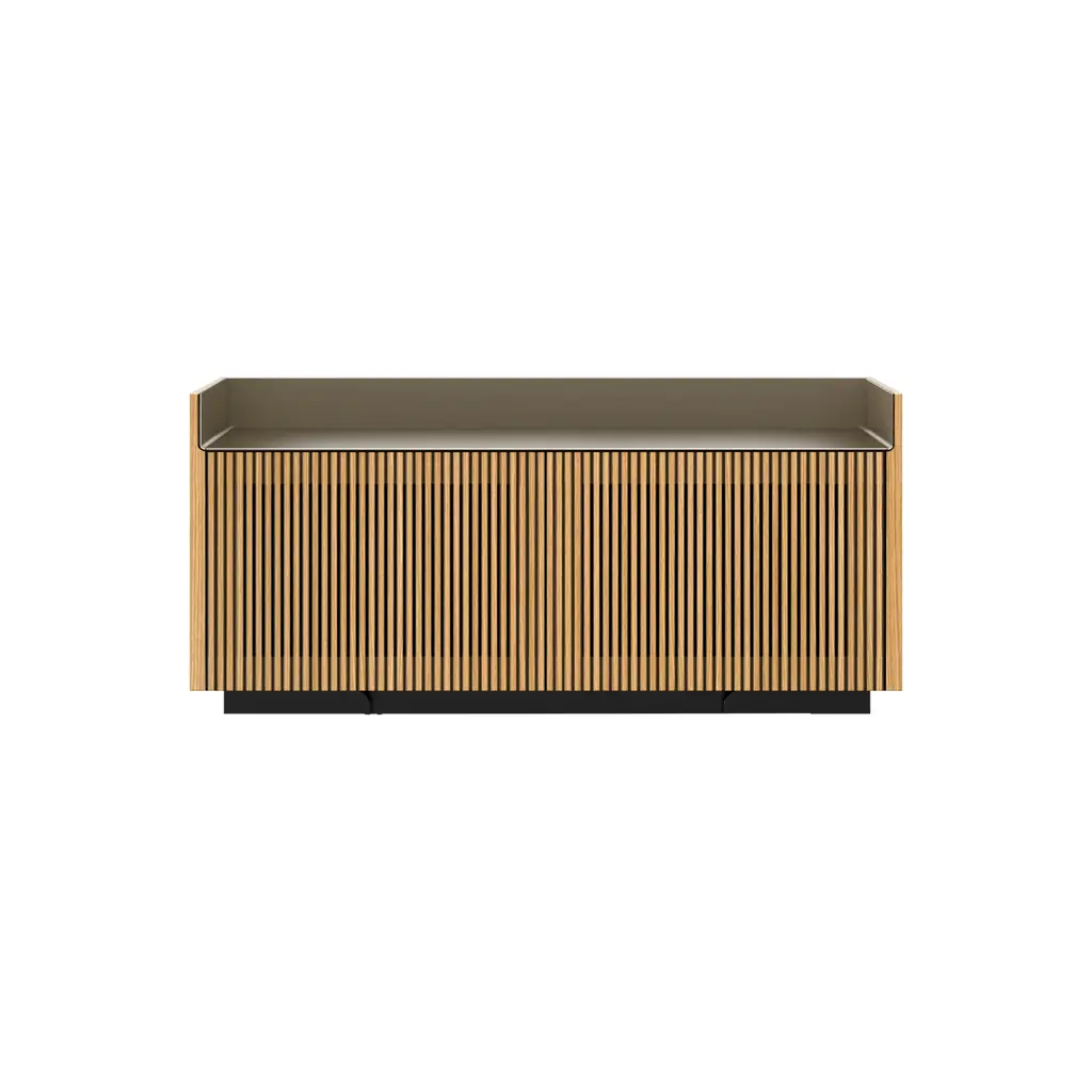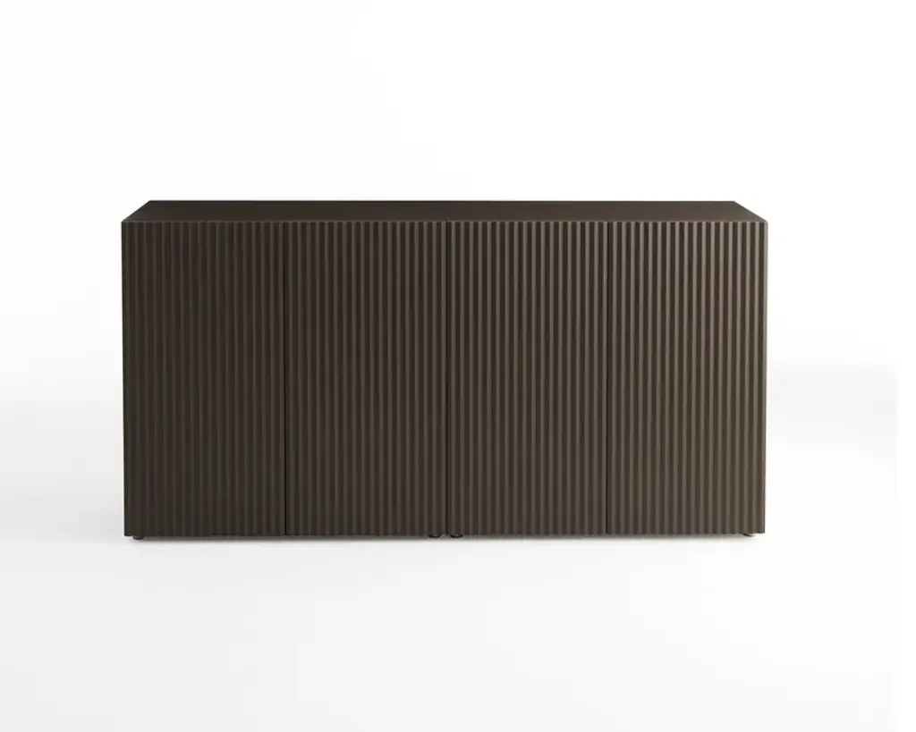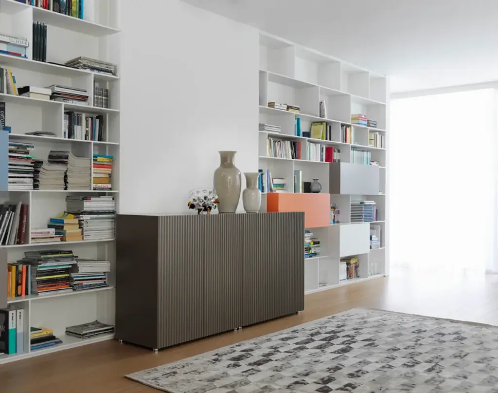 Leon Full Color is a Structure made from lacquered particleboard or MDF. Lacquered MDF doors. Internal shelves made from transparent tempered glass.Leon Full Color is the monochrome lacquered variant of Leon Wood. Leon plays with an awe-provoking optical effect that underlies its salient feature, that is, a standpoint-dependent visualization. From the front, the doors appear marked by vertical multi-coloured stripes yet, when observed from the side, with the naturalness of the light-shadow effect, dark or light uniformity prevails.
