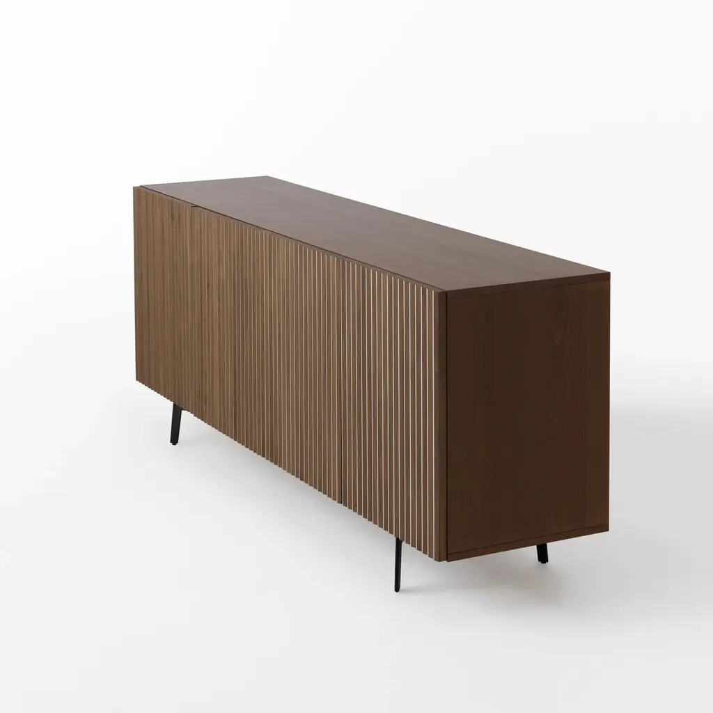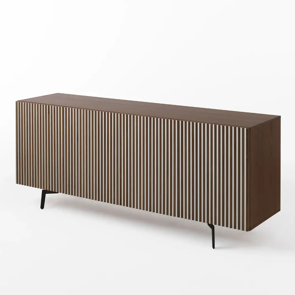 An exercise in contrasts, StH designed this striking piece of functional decor: a superb sideboard boasting captivating optical effect depending on the standpoint from which it is observed. Skillfully crafted of beechwood with a blonde finish, the door panels feature alternating vertical bleached and blonde inserts that, seen from the front, create a multi-colored striped effect, and observed from the side, the color appears homogeneous.