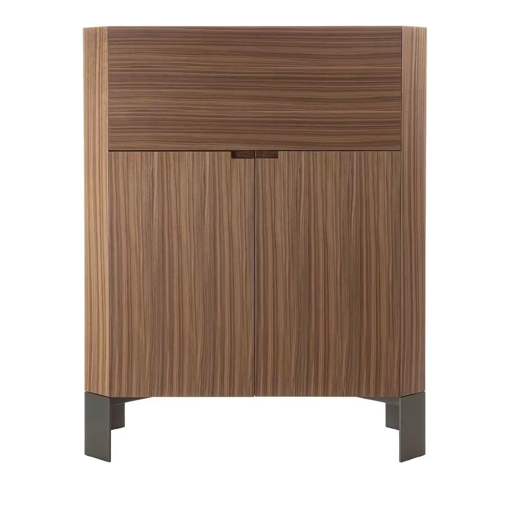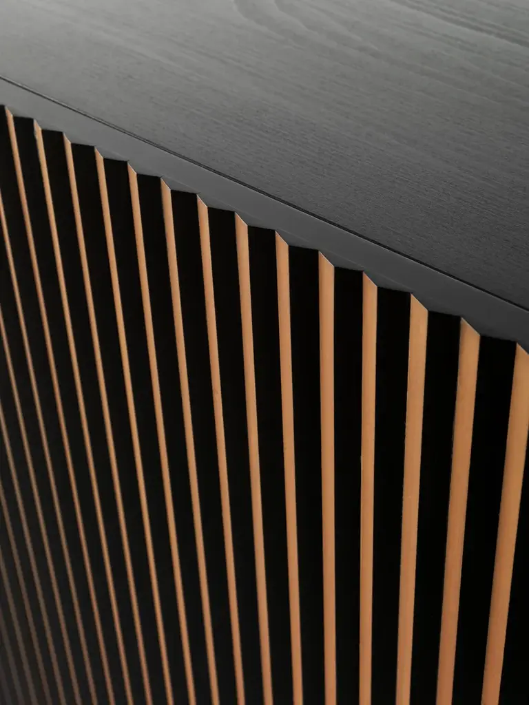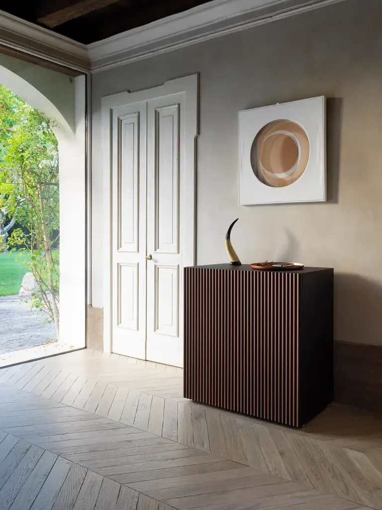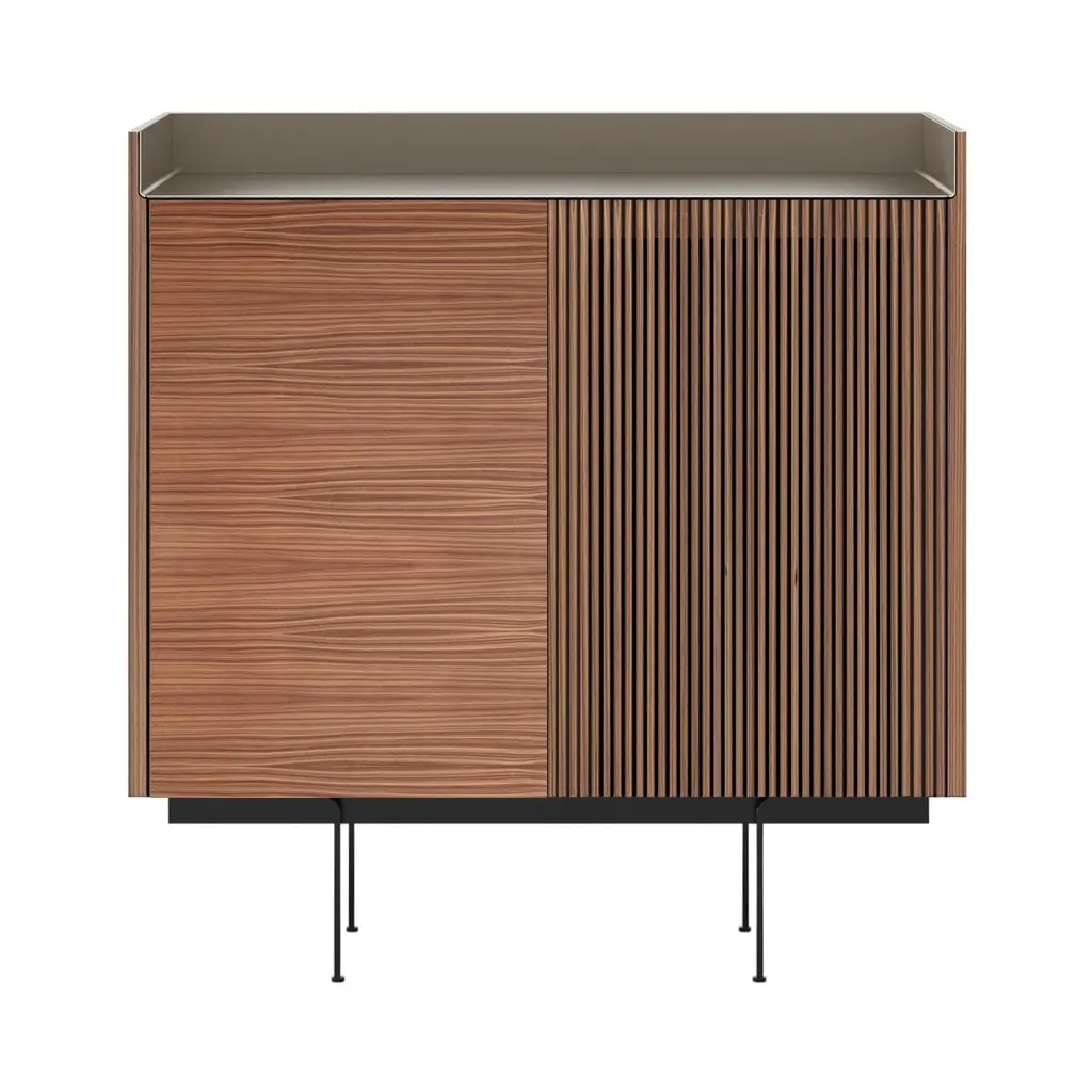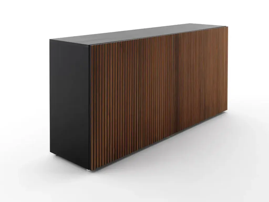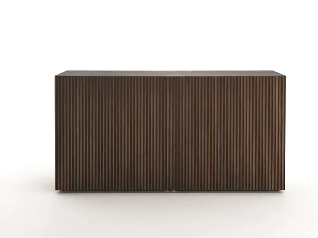 Leon plays with an awe-provoking optical effect that underlies its salient feature, that is, a standpoint-dependent visualization. From the front, the doors appear marked by vertical multi-coloured stripes yet, when observed from the side, dark or light uniformity prevails. Even the unique lacquered white finish produces the same effects through room lighting.Structure made from particleboard, either veneered and stained or melamine-coated and lacquered. The thickness of the structure and shelves is 18 mm, the back panel 10 mm, and the fixed central divider 36 mm. Doors with triangular section inserts made from stained or lacquered beech. Shelves made from transparent tempered glass, with polished edge, 5 mm thick. PVC or felt bumpers. Painted ABS adjustable feet with aluminium finish. Optional base, height 16 cm or 32 cm, made from powder-coated iron. Optional accessories: shelf for glasses, extractable cutlery box, extractable tray, wooden shelves.FINISHDoors: white lacquered, bicolor cherry and mocha beech, bicolor whitened beech and bois blondBody/doors' edges and interior feature: white lacquered, mocha beech, whitened beech, bois blondOptional metal base: white, black