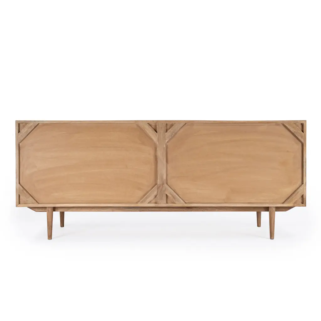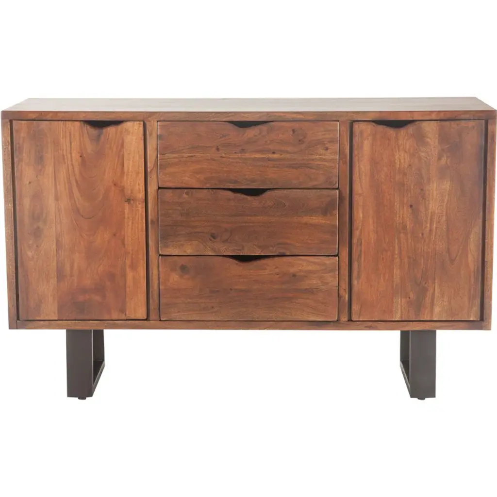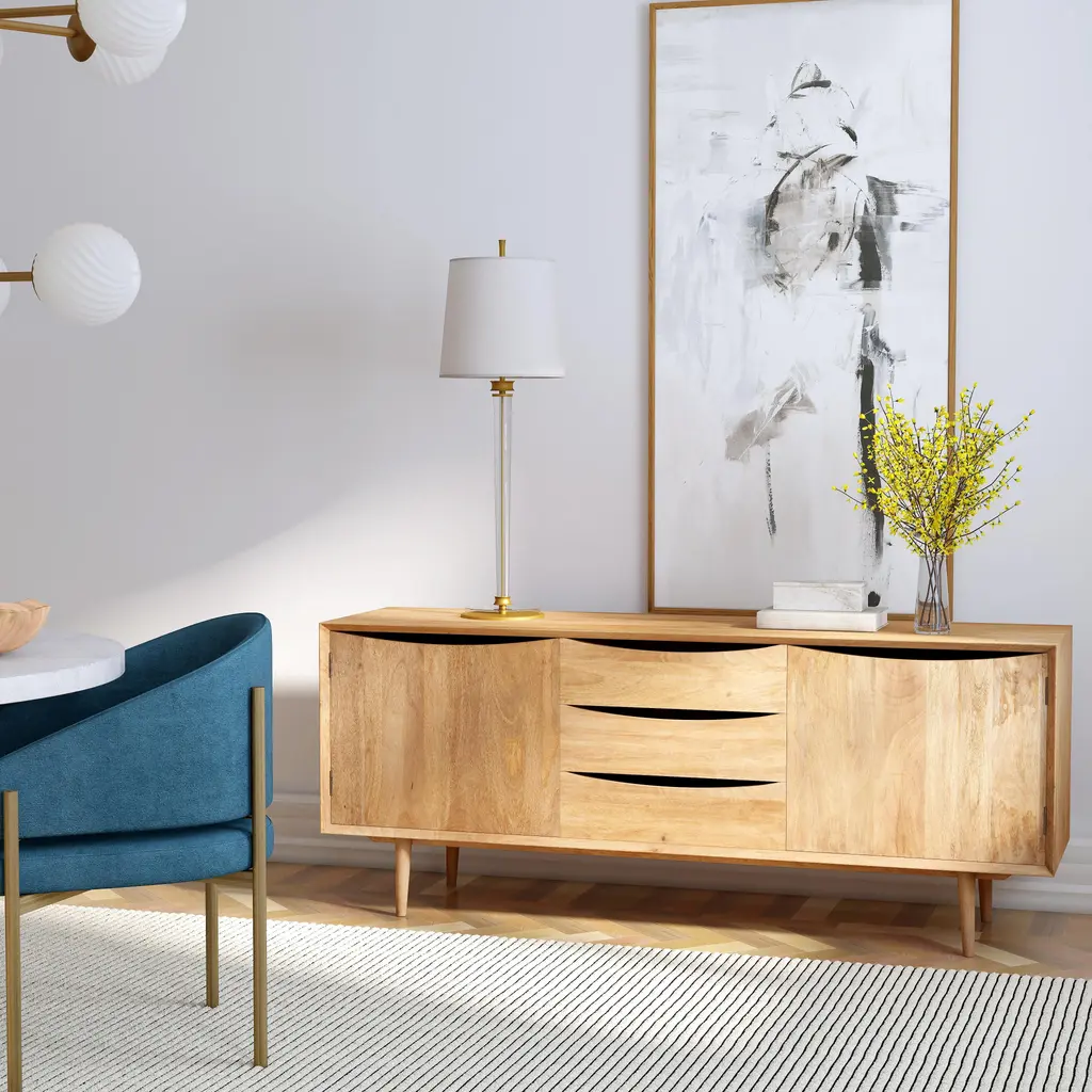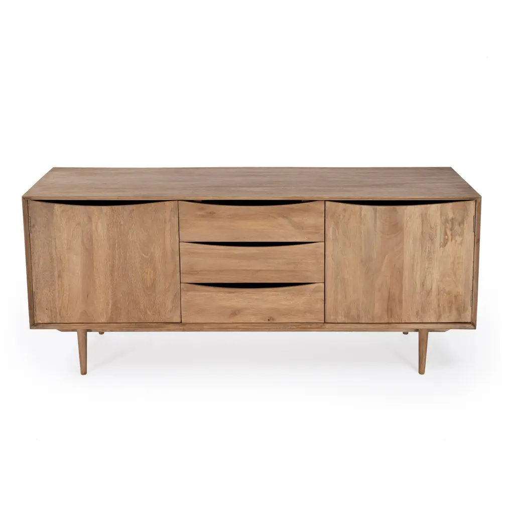 Curved lines paired with a clean silhouette make up this 67" mid-century style tv stand. Featuring a warm natural finish and featuring ample storage inside it's 3 center drawers and two side doors for storing components and your media library. The acacia Wood and MDF frame sits on top of 4 tapered legs. Durably Constructed With: Mango Wood Solids, MDF Product Construction Features: Finish Distressing Product Assembled Measurement & Weight: 27.5" H x 67.0" W x 18.0" D -- 99.0 lbs. 210 lbs. Suggested weight capacity Item Arrives: Needs Assembly Photo may slightly differ from actual item in terms of color/finish due to the lighting during photo shoot or the monitor's display.